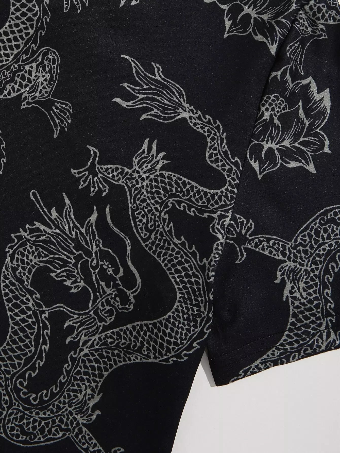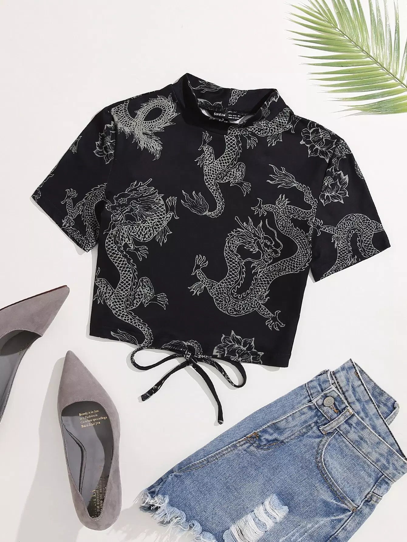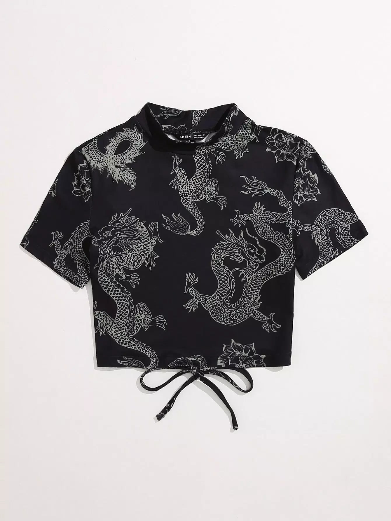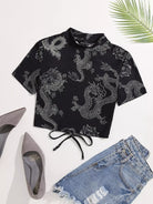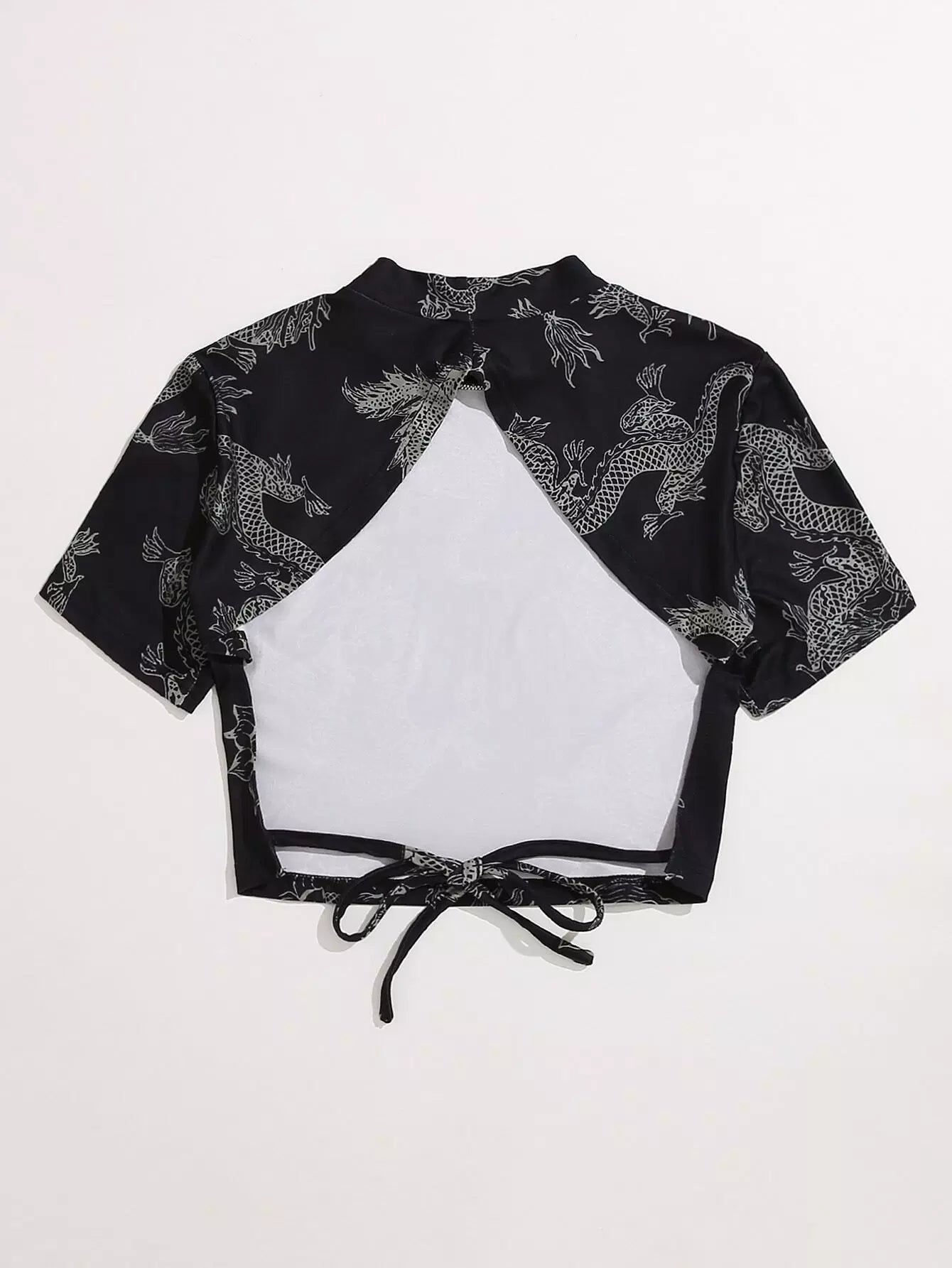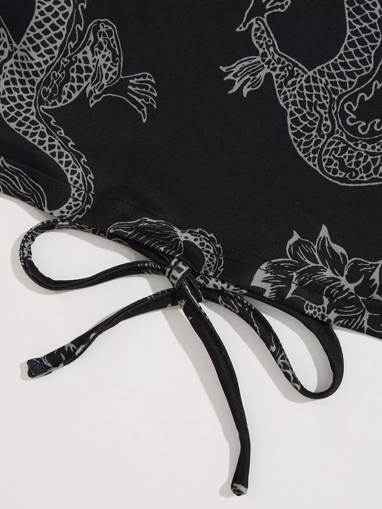 Plus Chinese Dragon Print Knotted Backless Mock Neck Tee