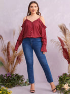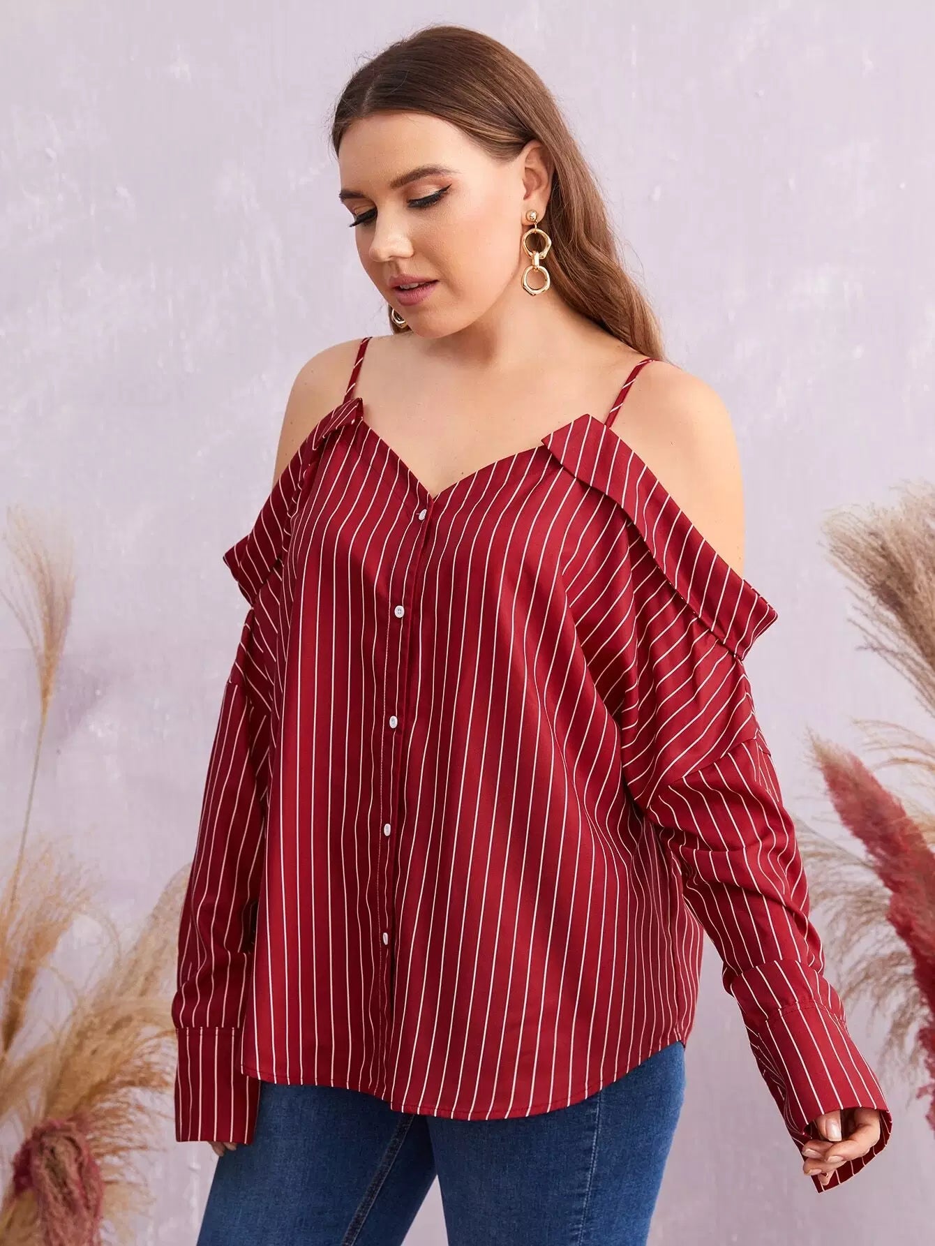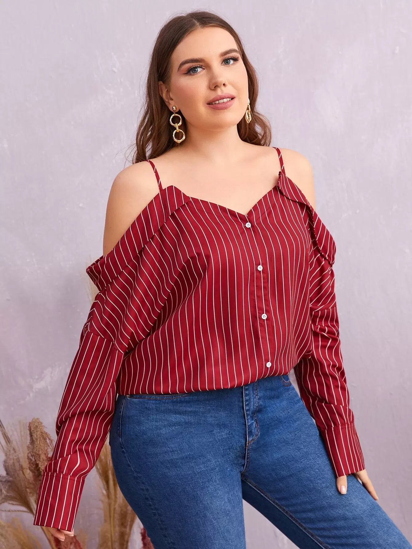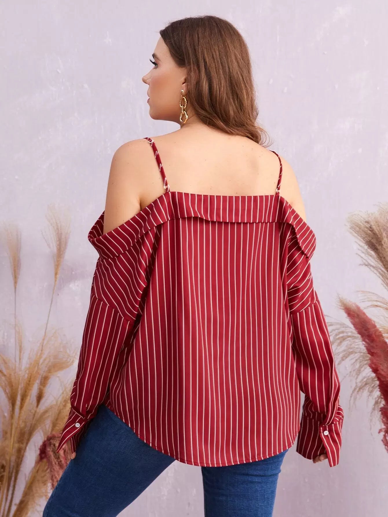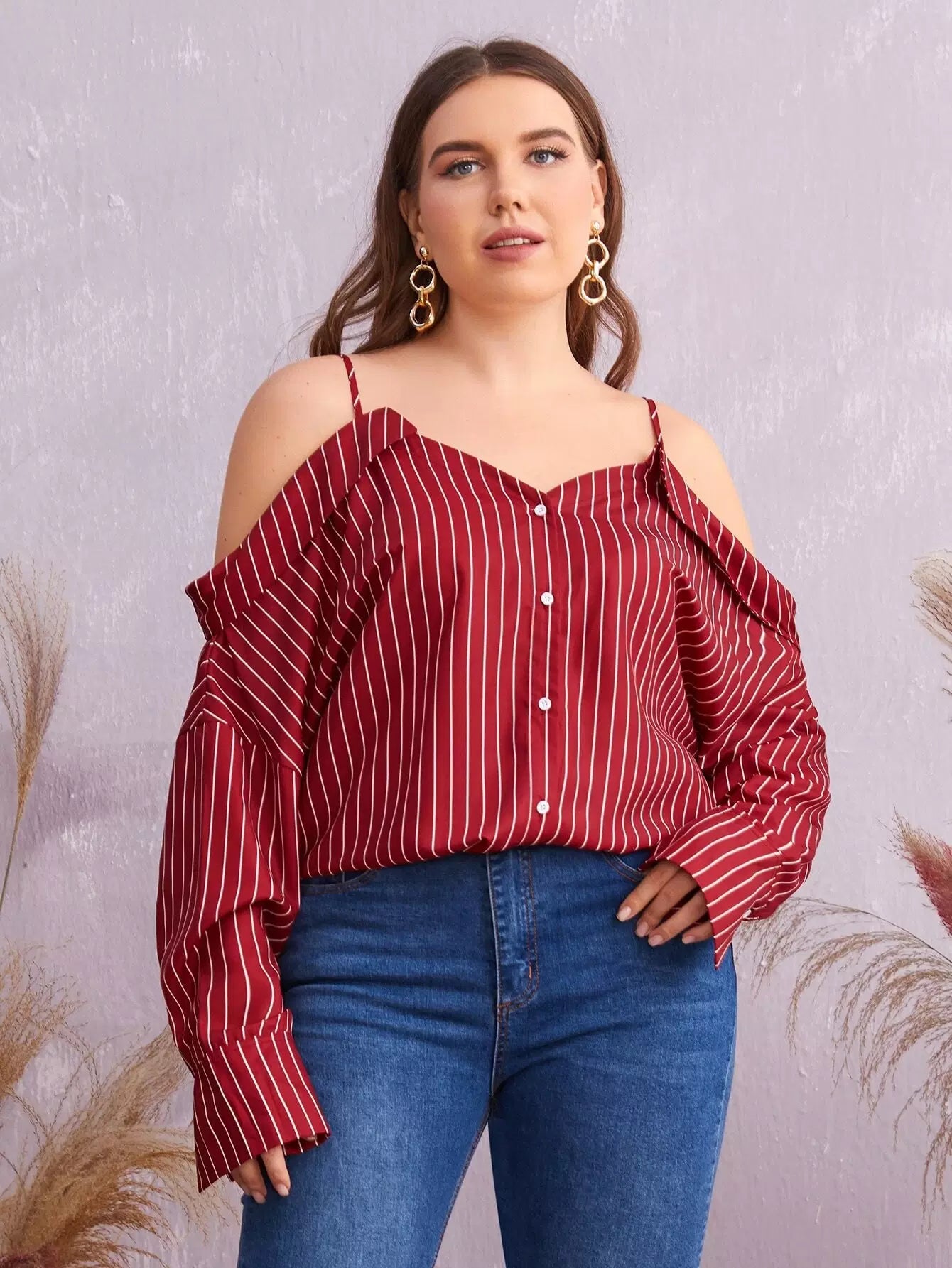 Plus Cold Shoulder Foldover Detail Buttoned Striped Blouse