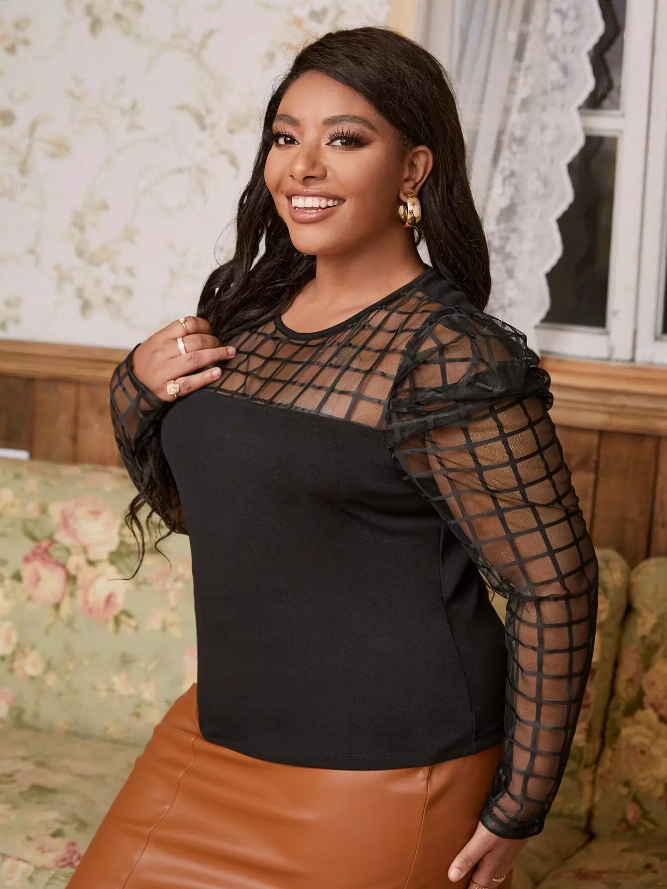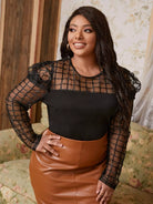 Plus Contrast Plaid Mesh Gigot Sleeve Tee