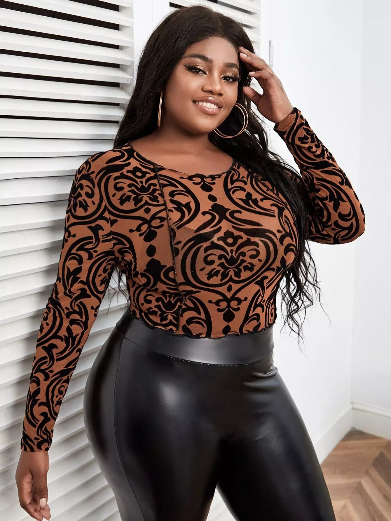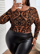Plus Damask Print Lettuce Trim Crop Mesh Top Without Bra