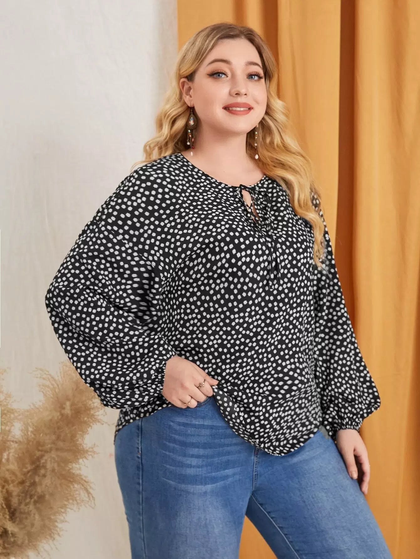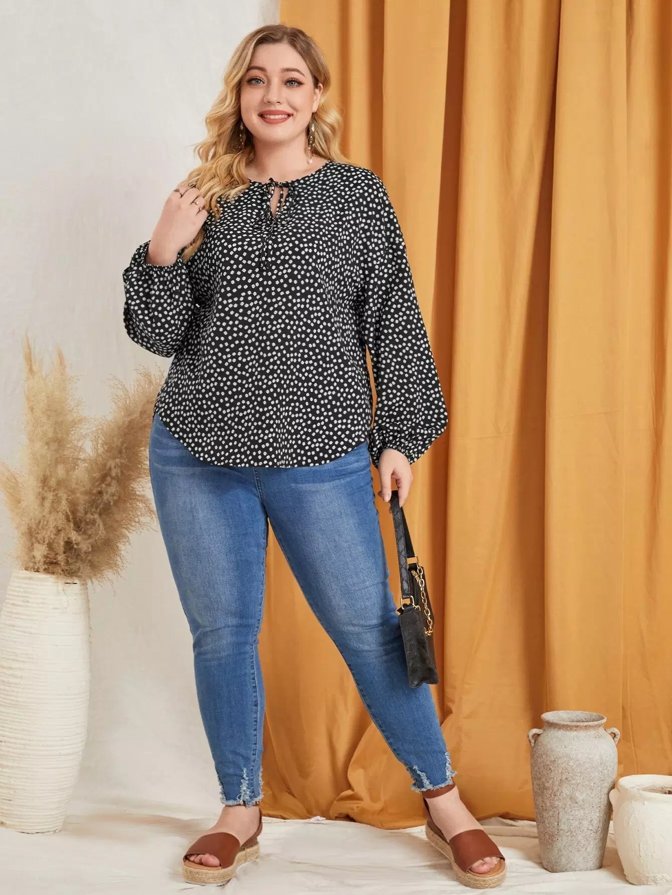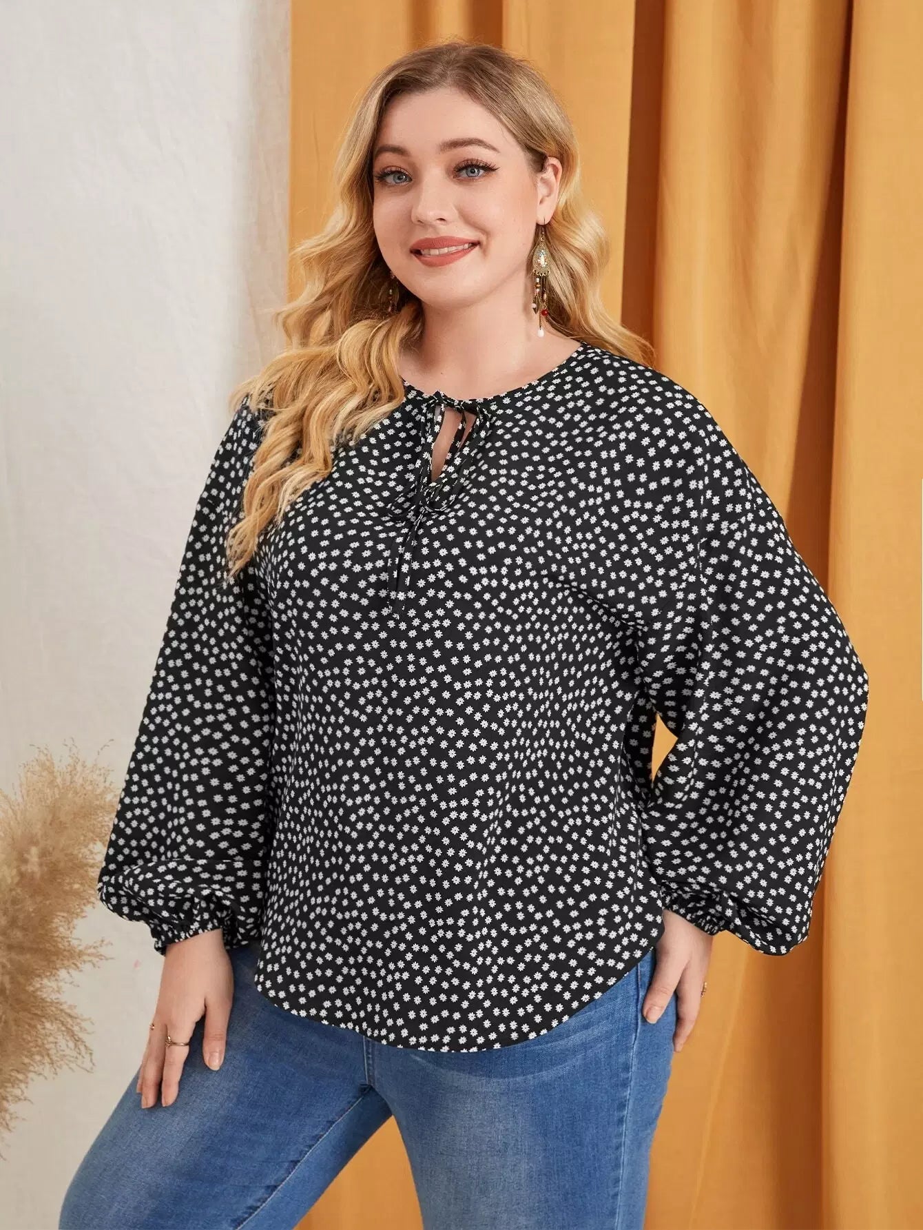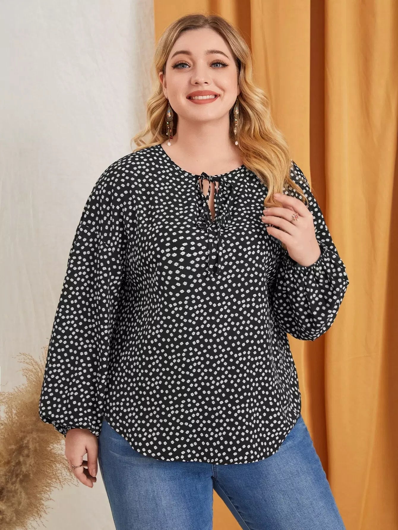 Plus Ditsy Floral Print Lantern Sleeve Curved Hem Blouse