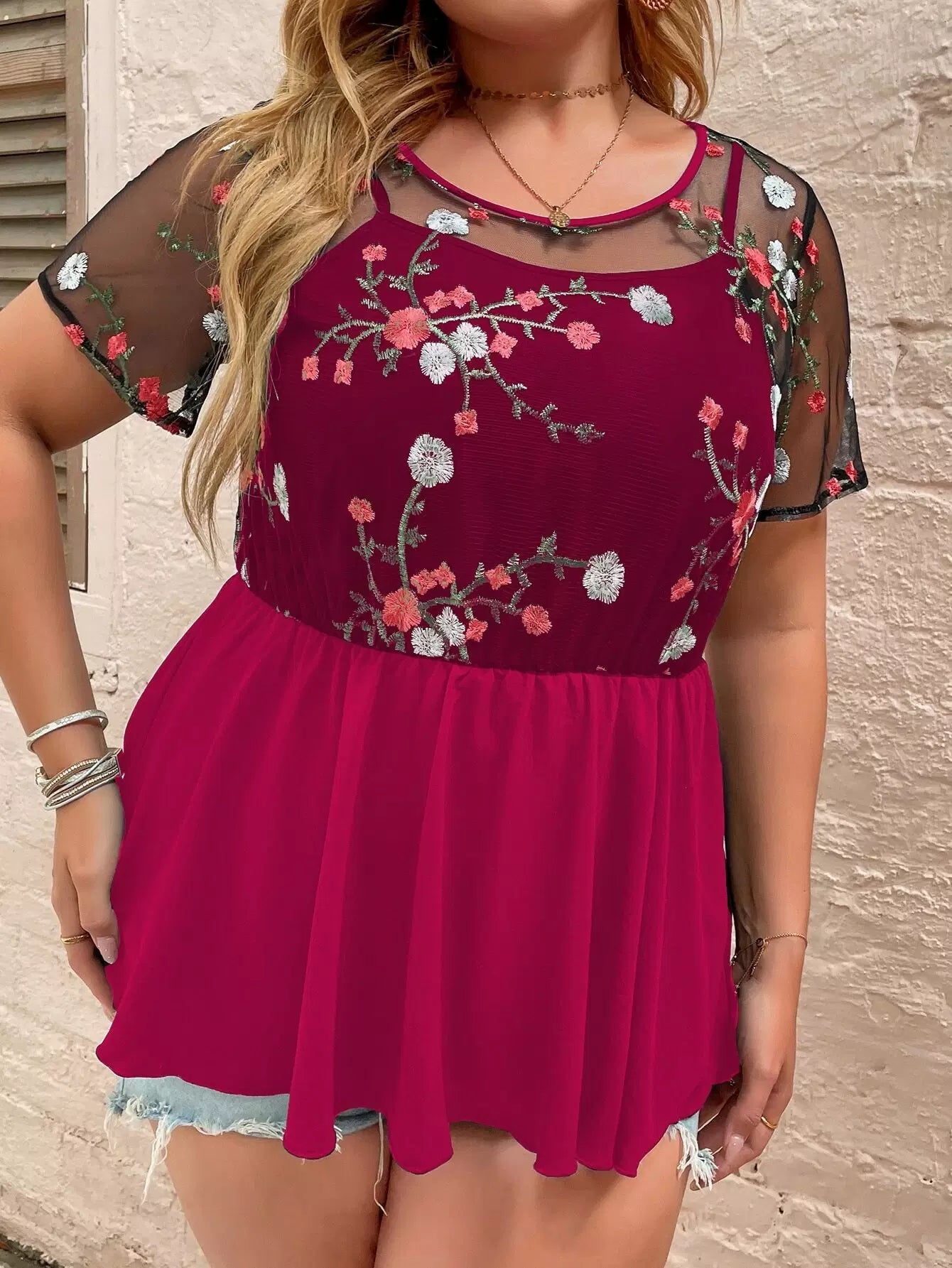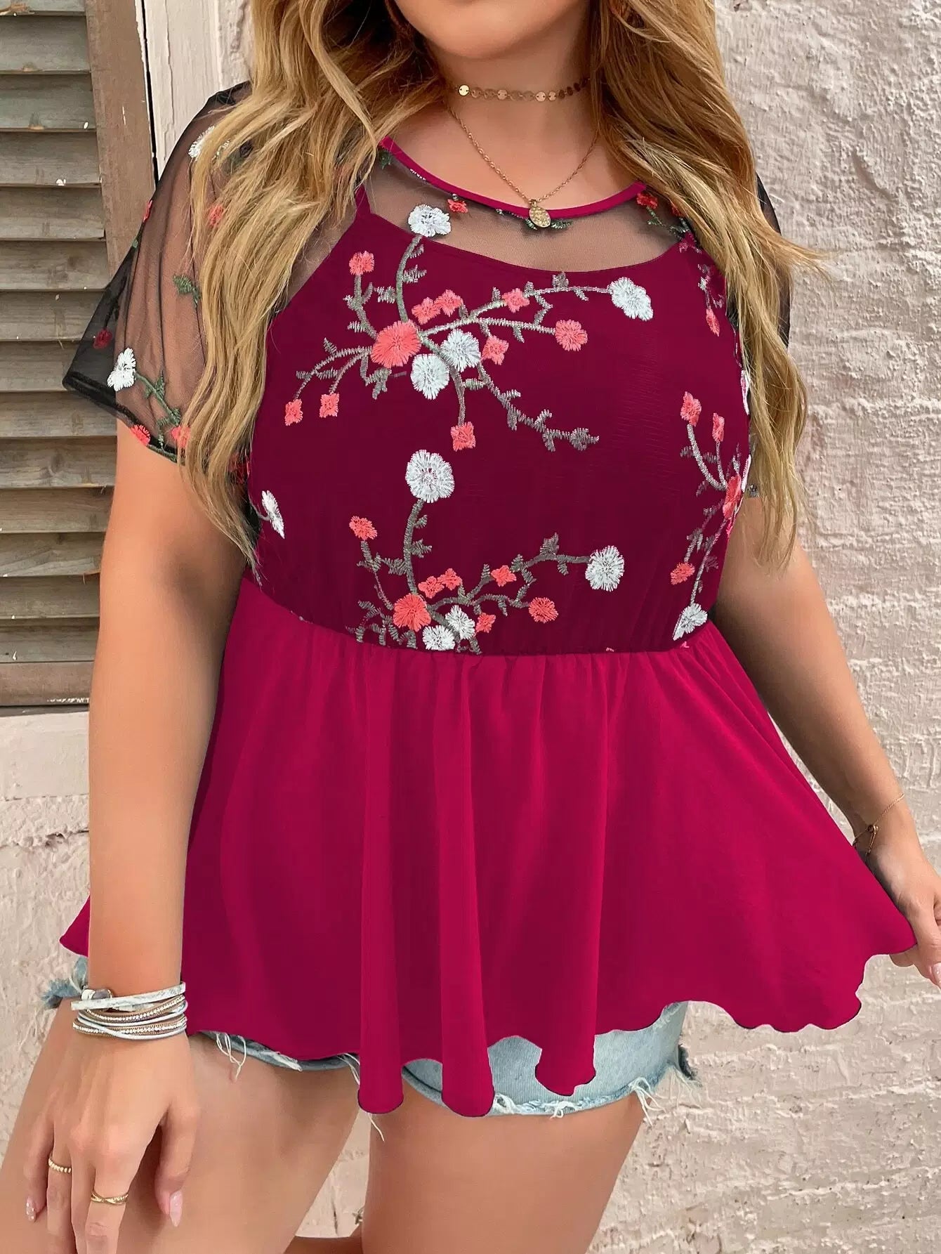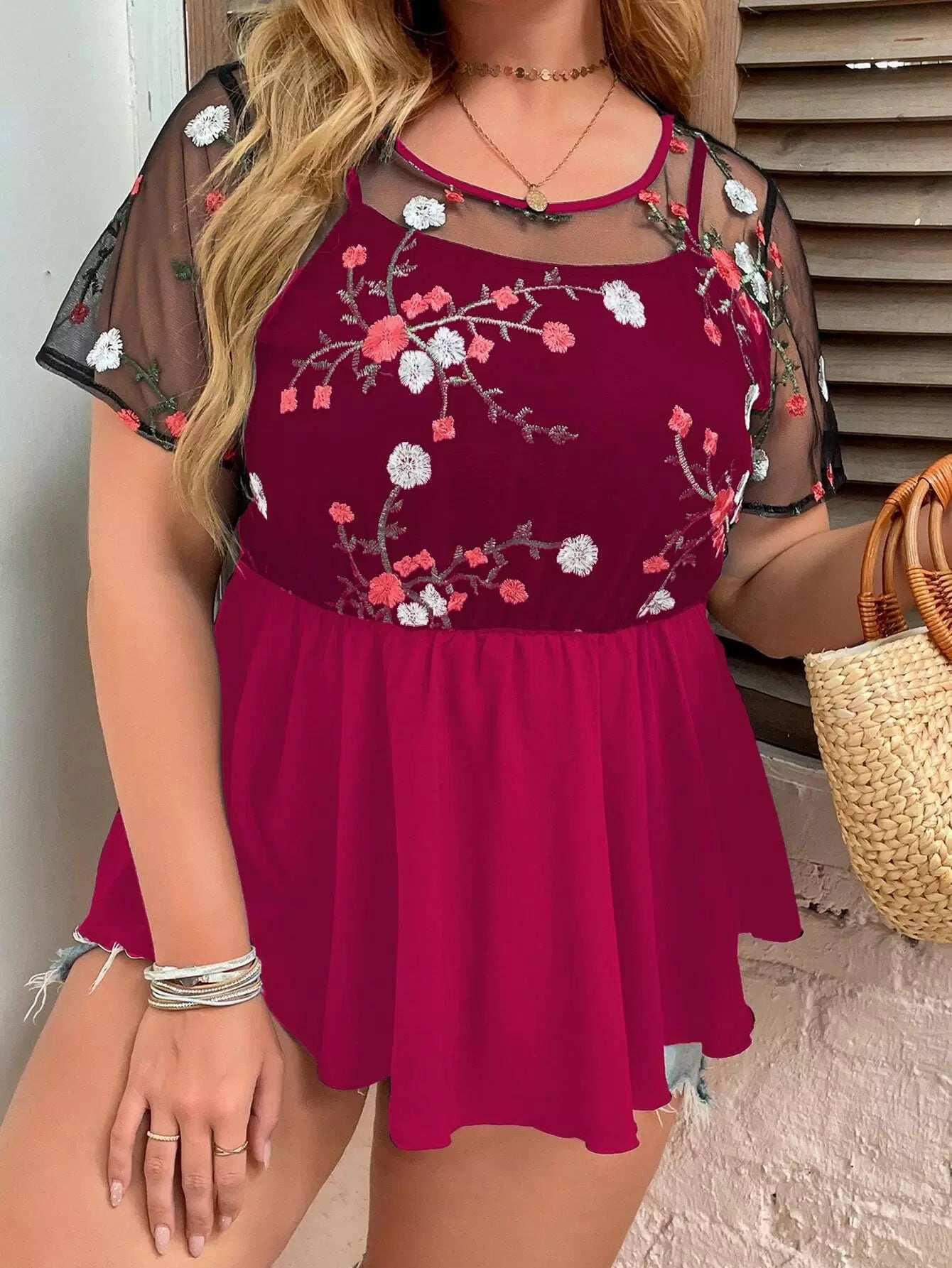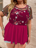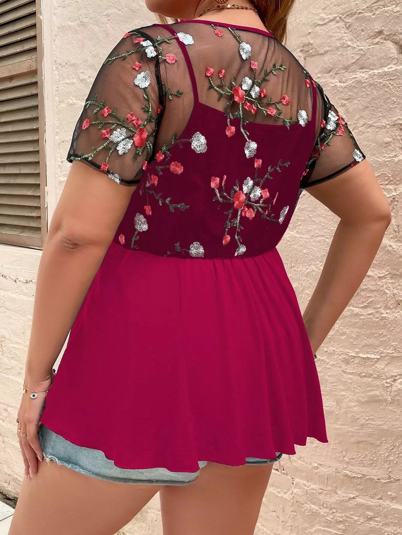 Plus Floral Embroidery Contrast Mesh Ruffle Hem Top