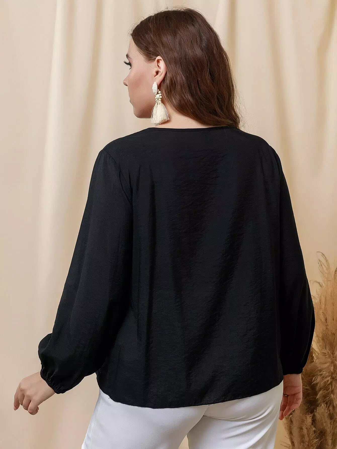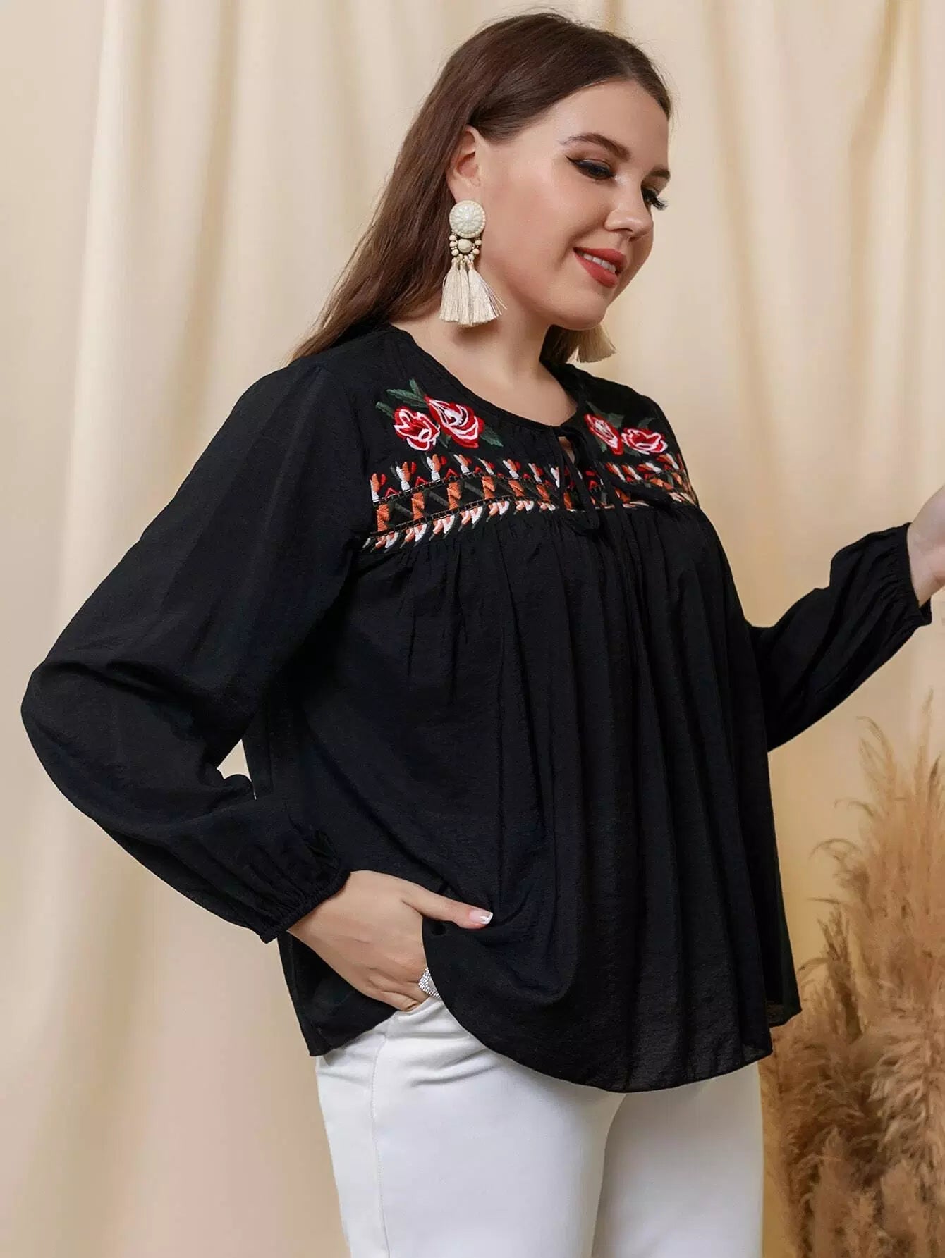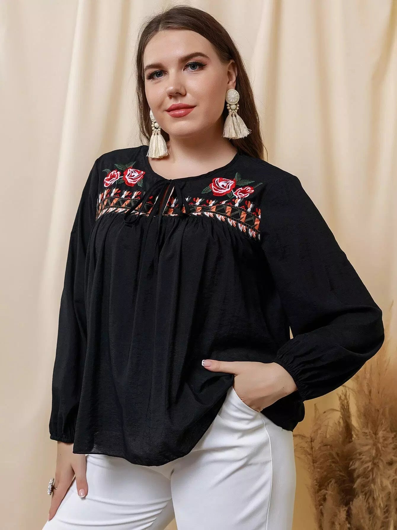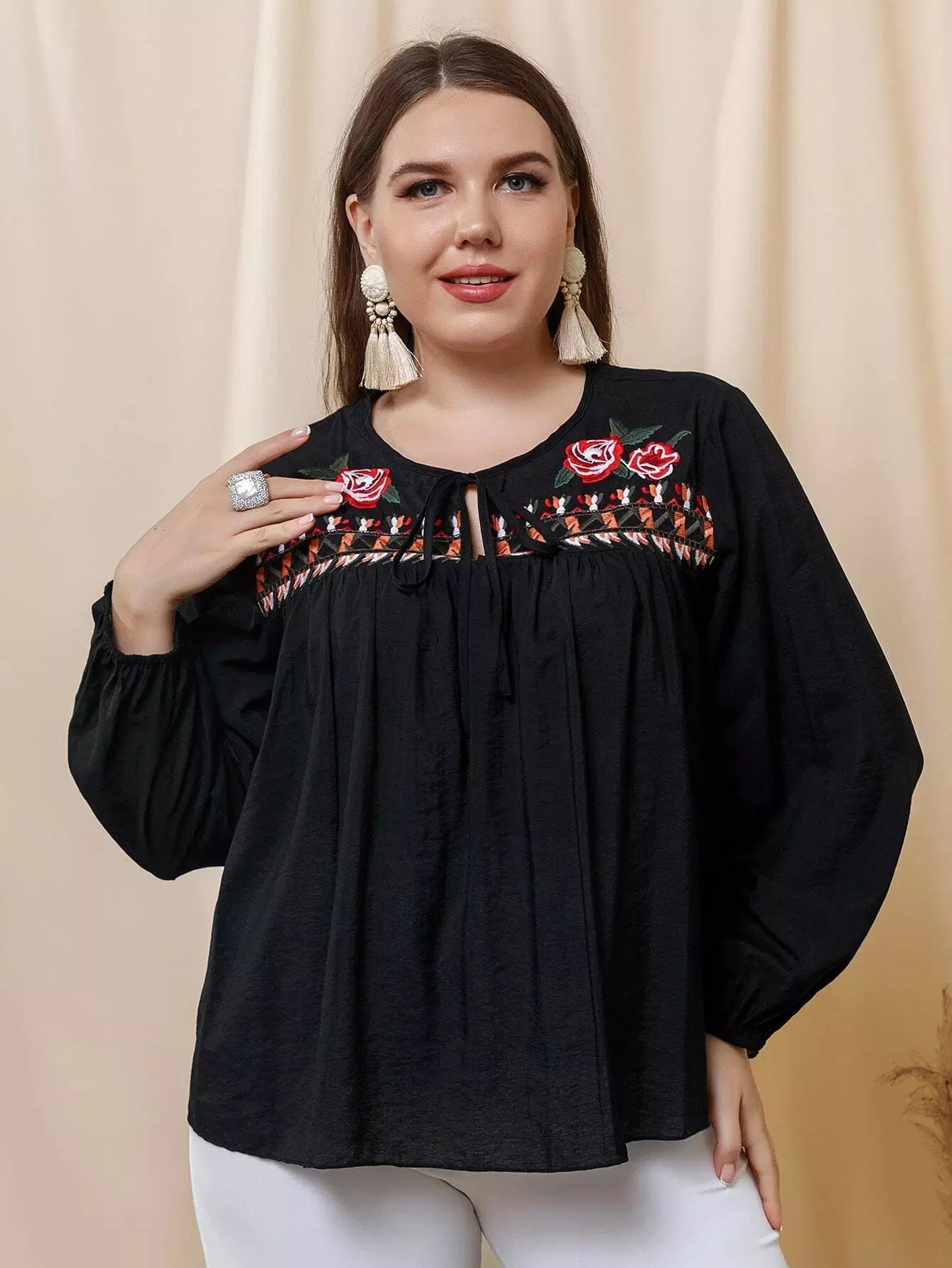 Plus Floral Embroidery Tie Neck Lantern Sleeve Blouse