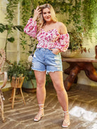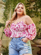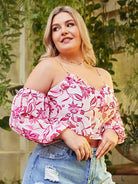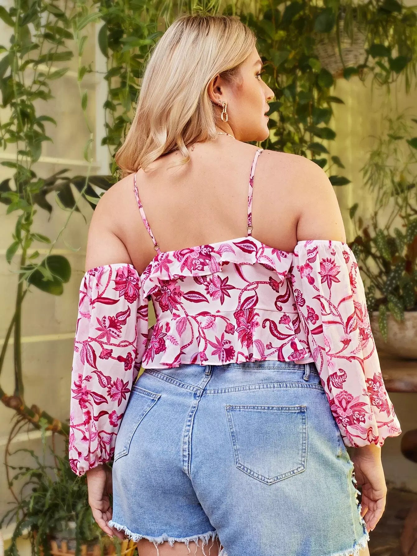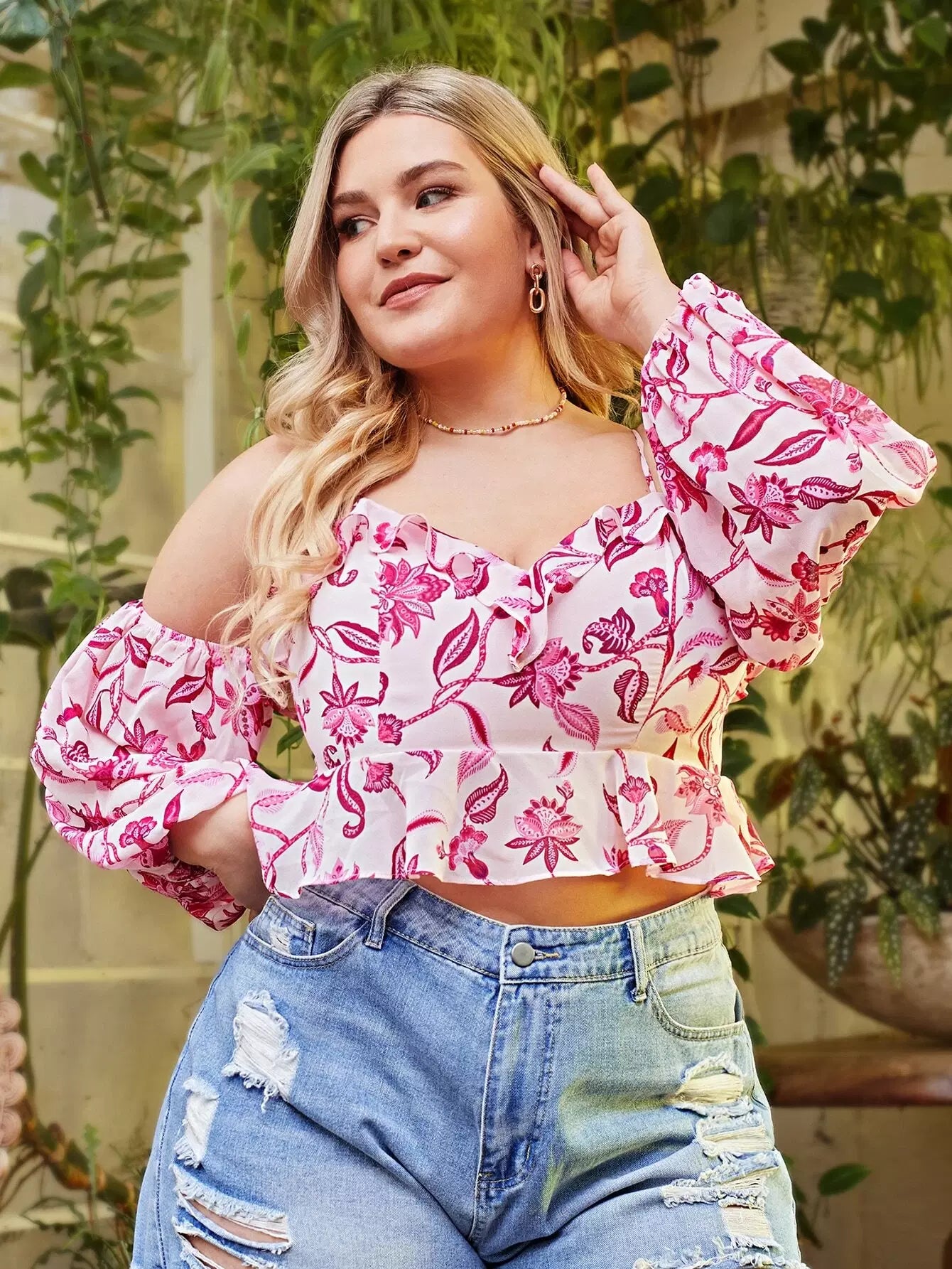 Plus Floral Print Cold Shoulder Lantern Sleeve Ruffle Trim Chiffon Blouse