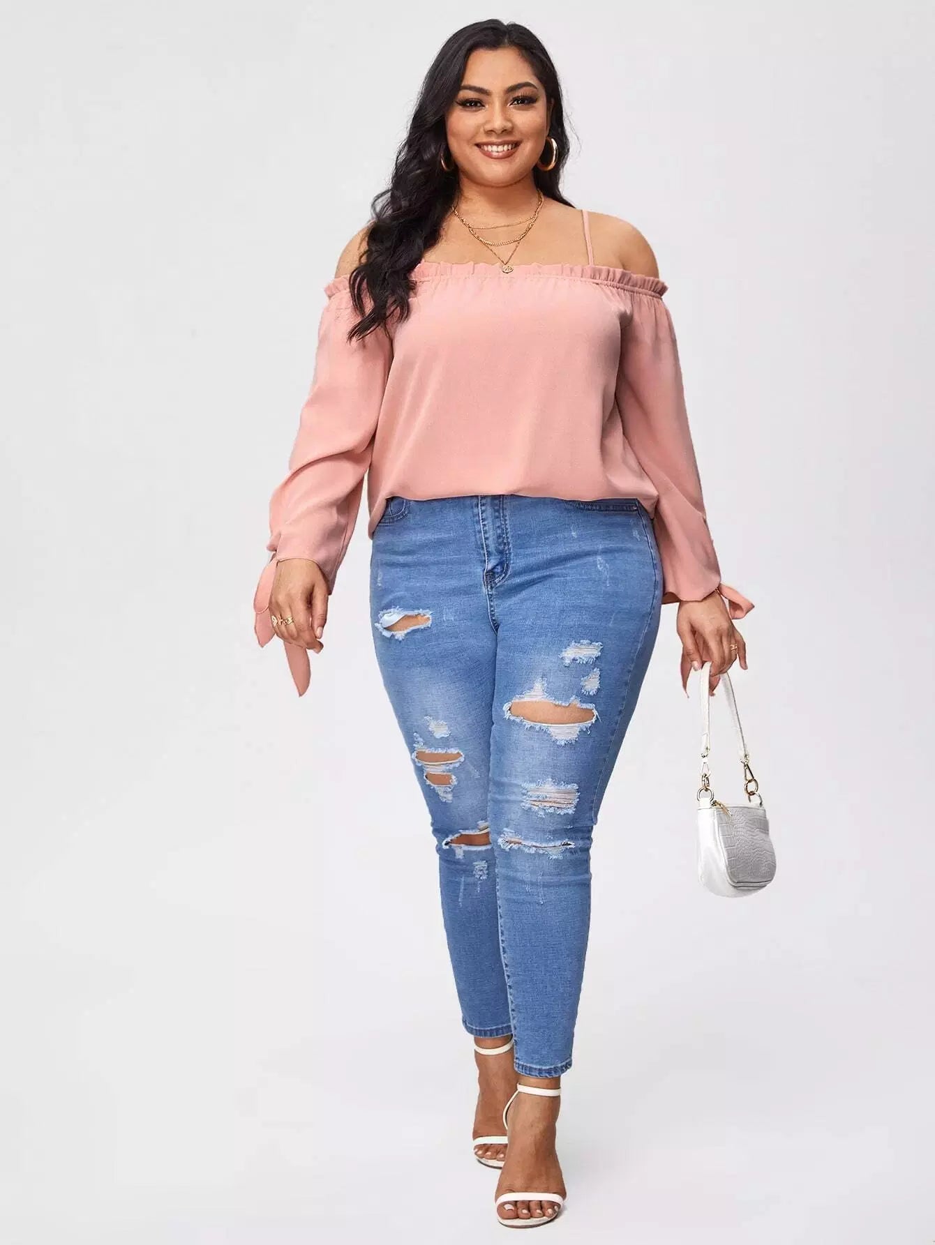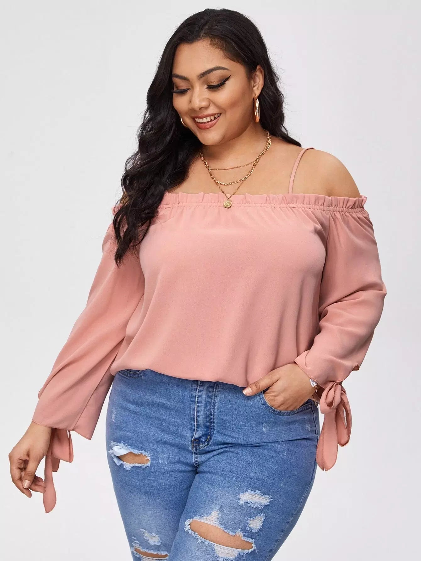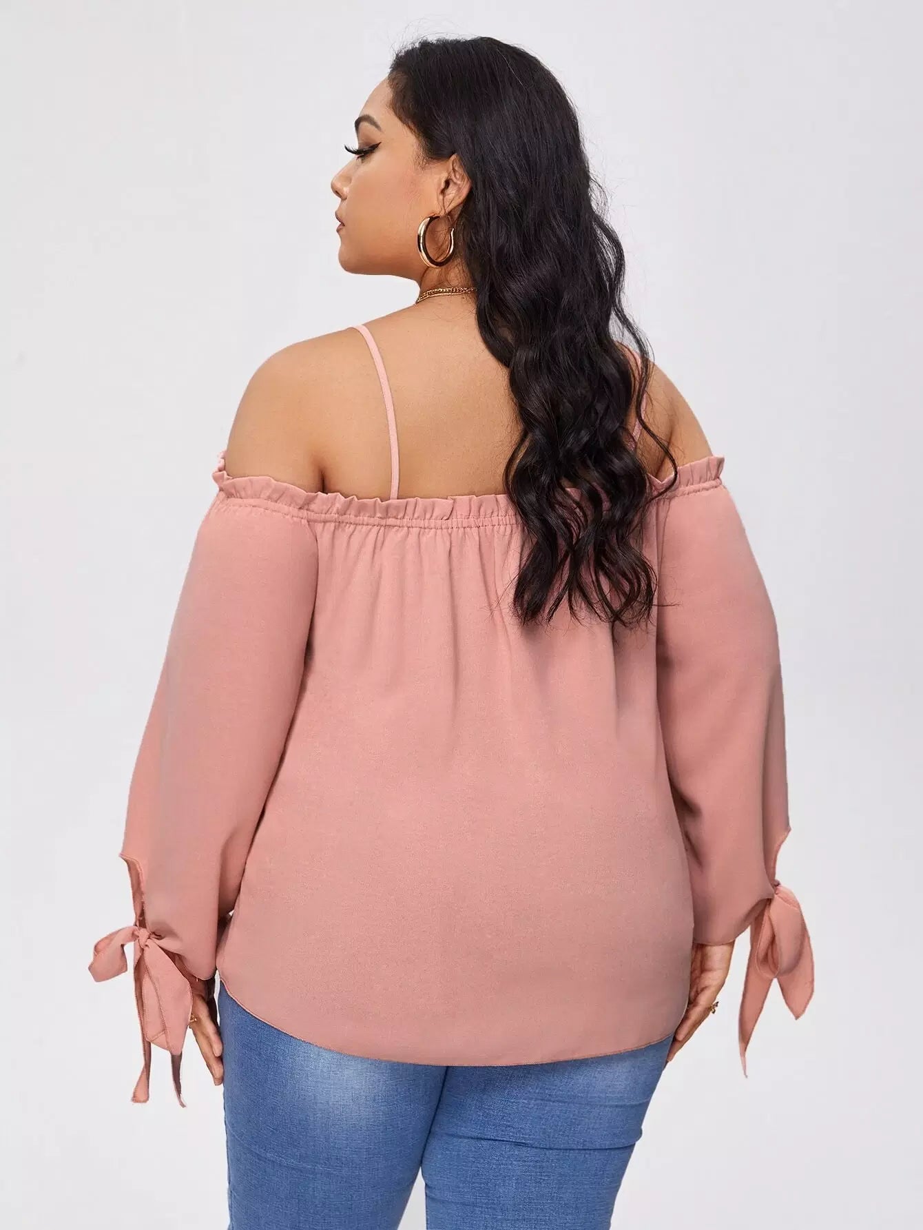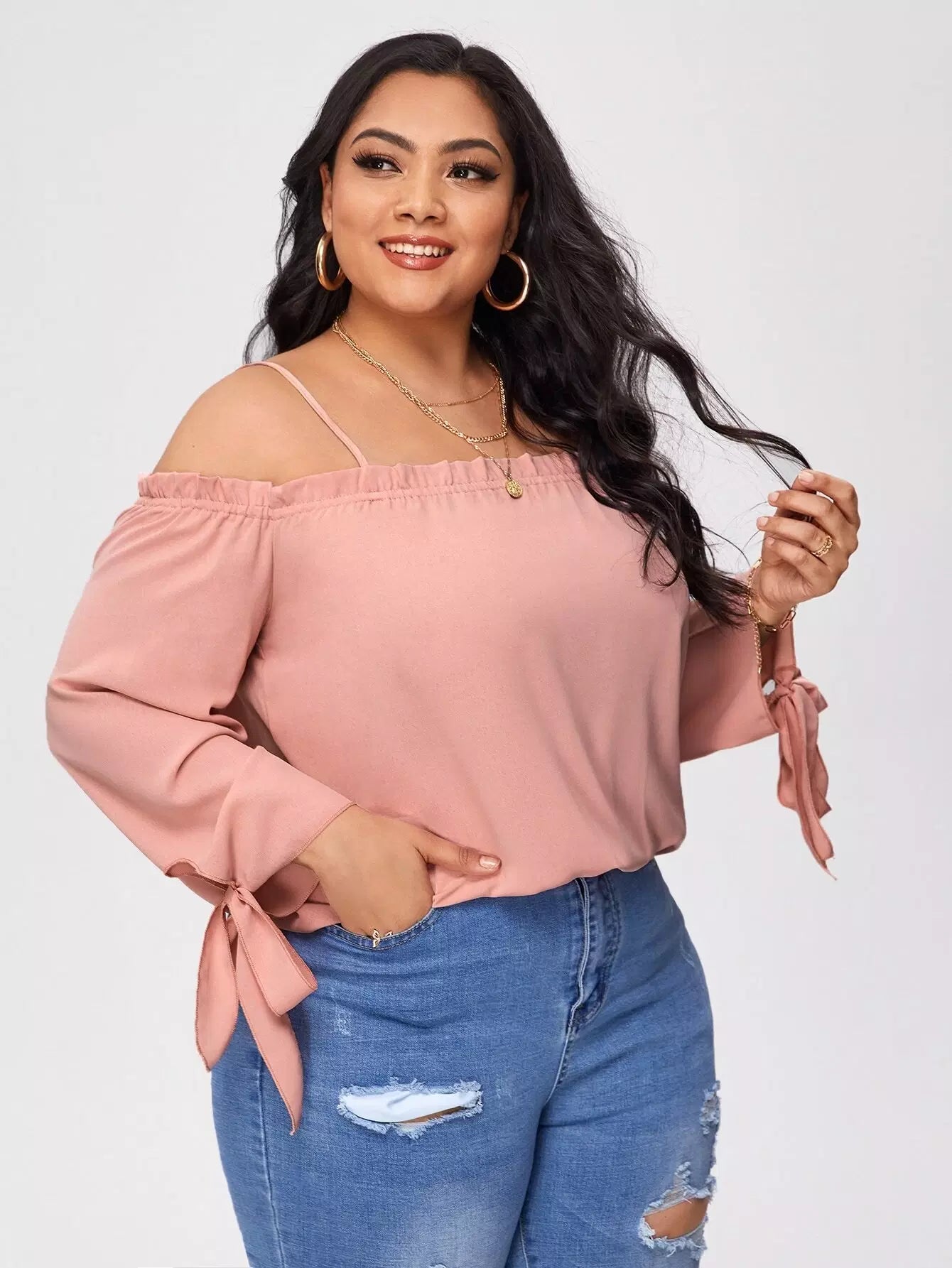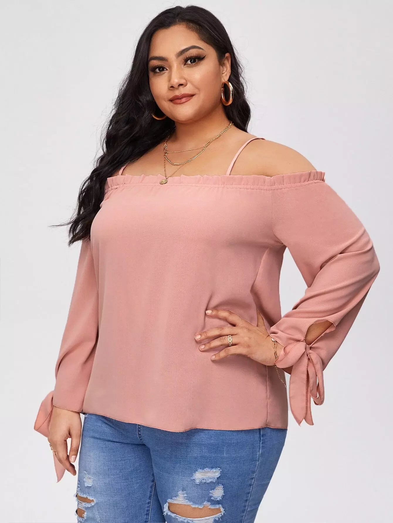 Plus Frill Trim Knot Cuff Solid Blouse