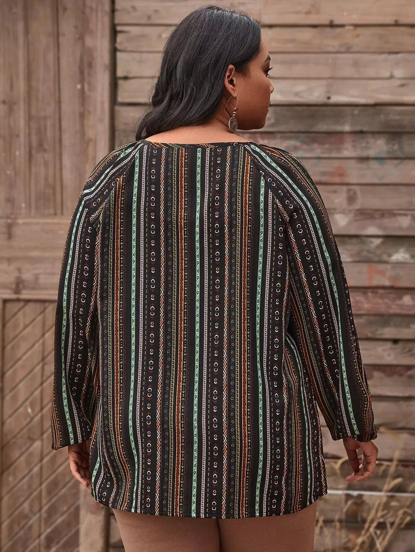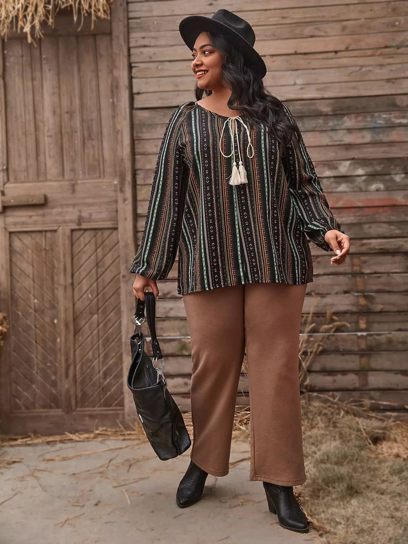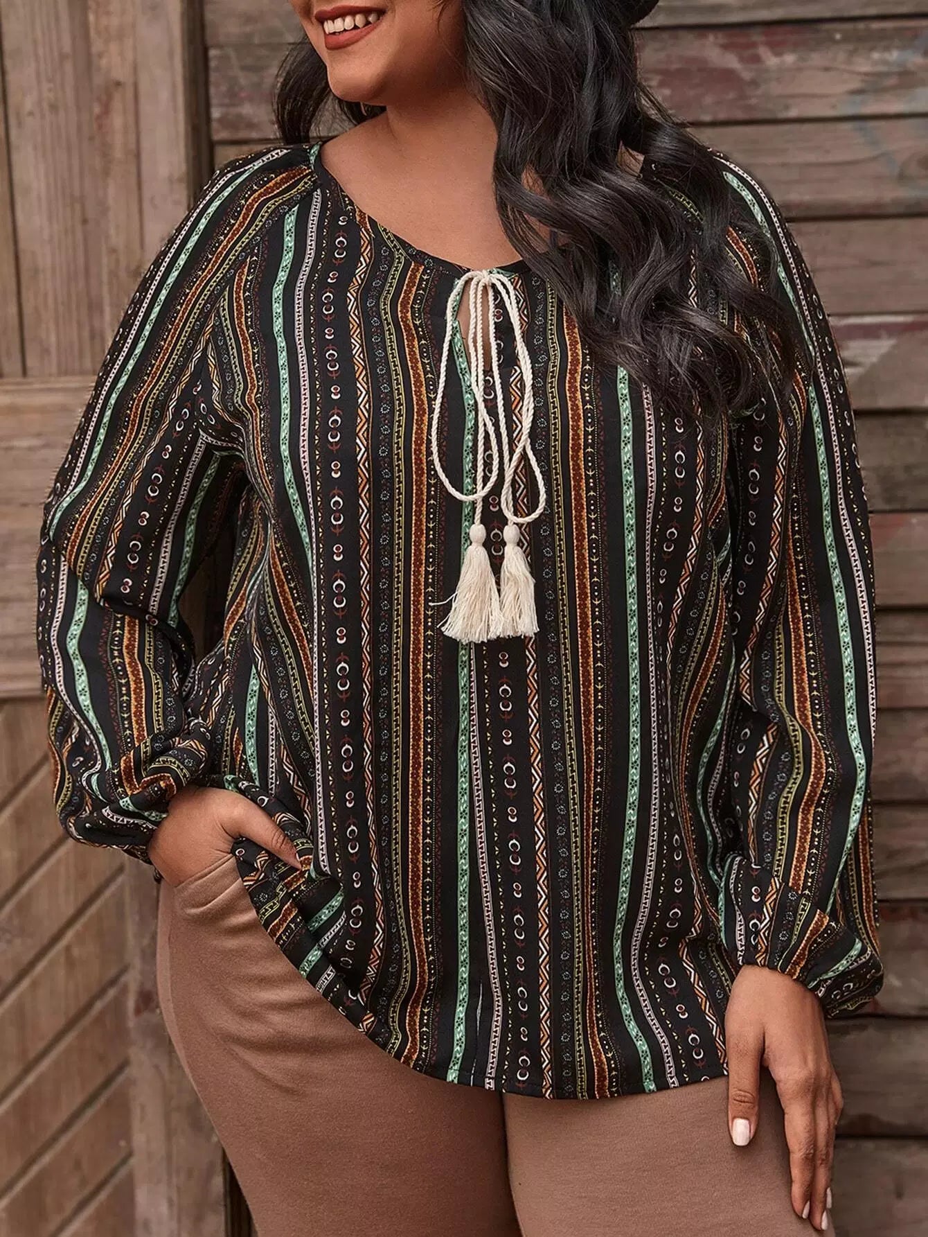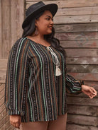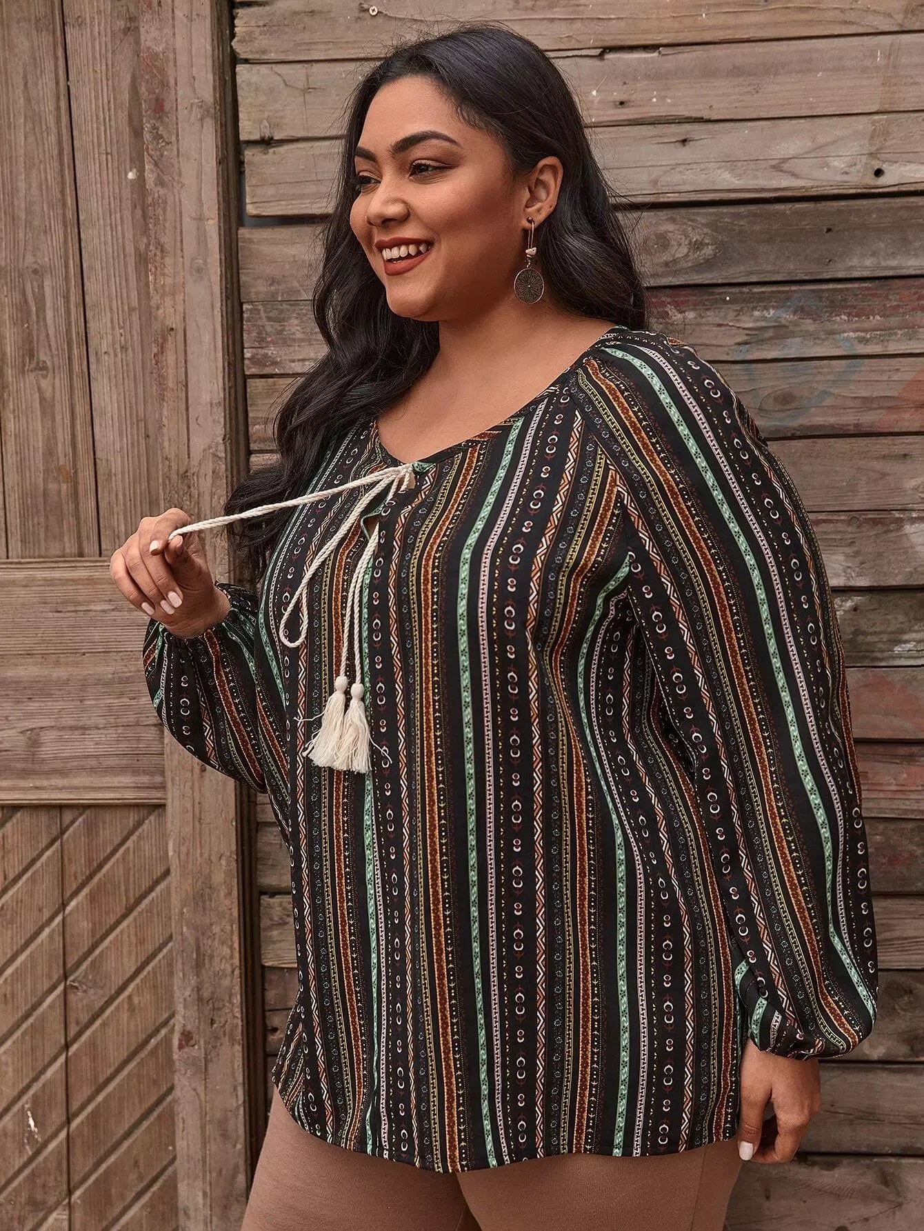 Plus Geo Striped Tassel Trim Tie Front Blouse