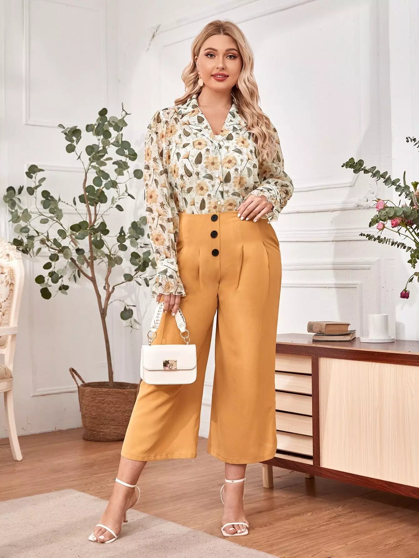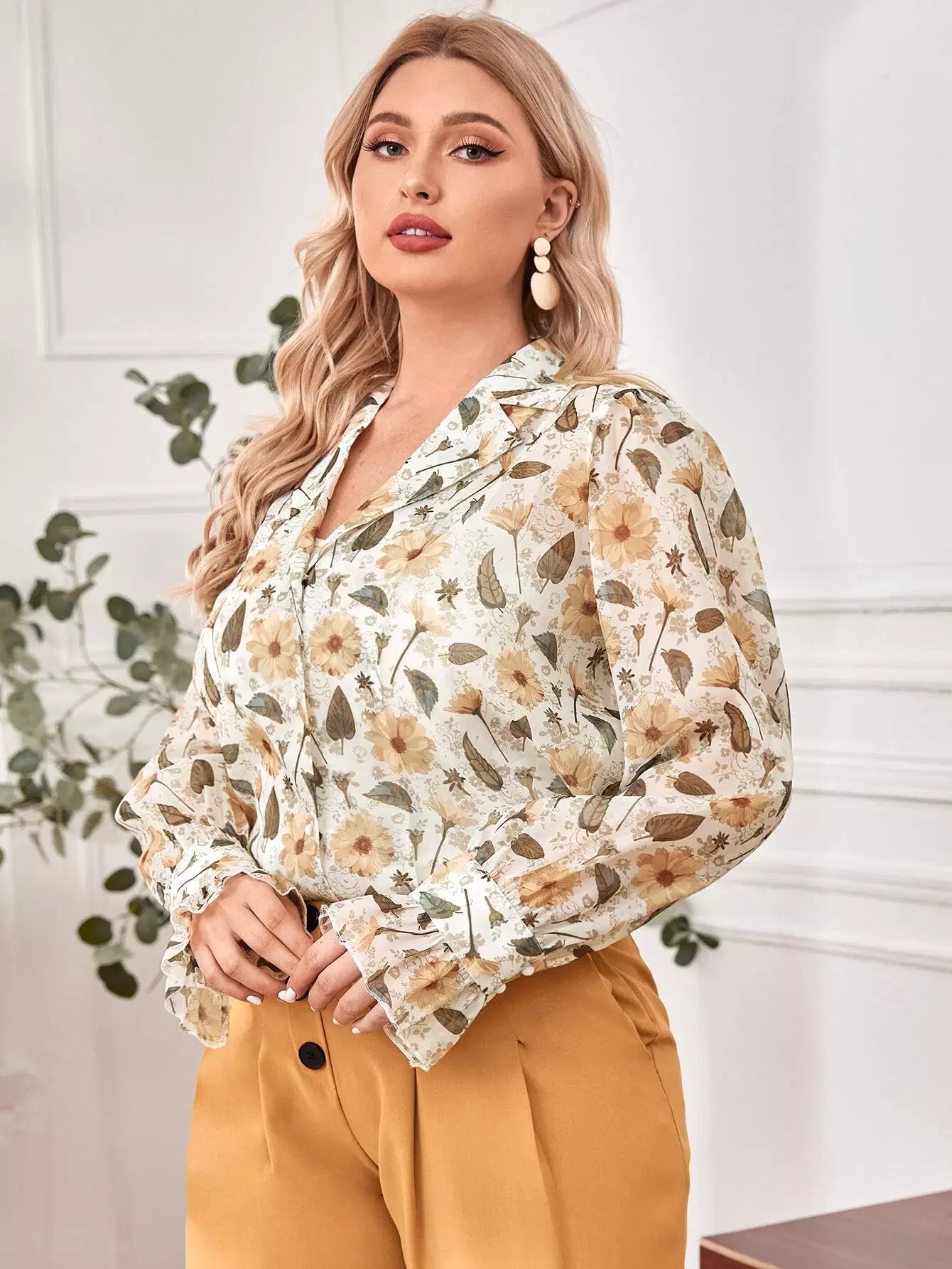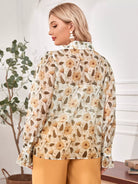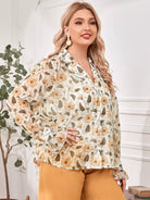 Plus Lapel Collar Flounce Sleeve Floral Print Blouse