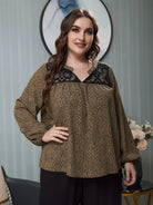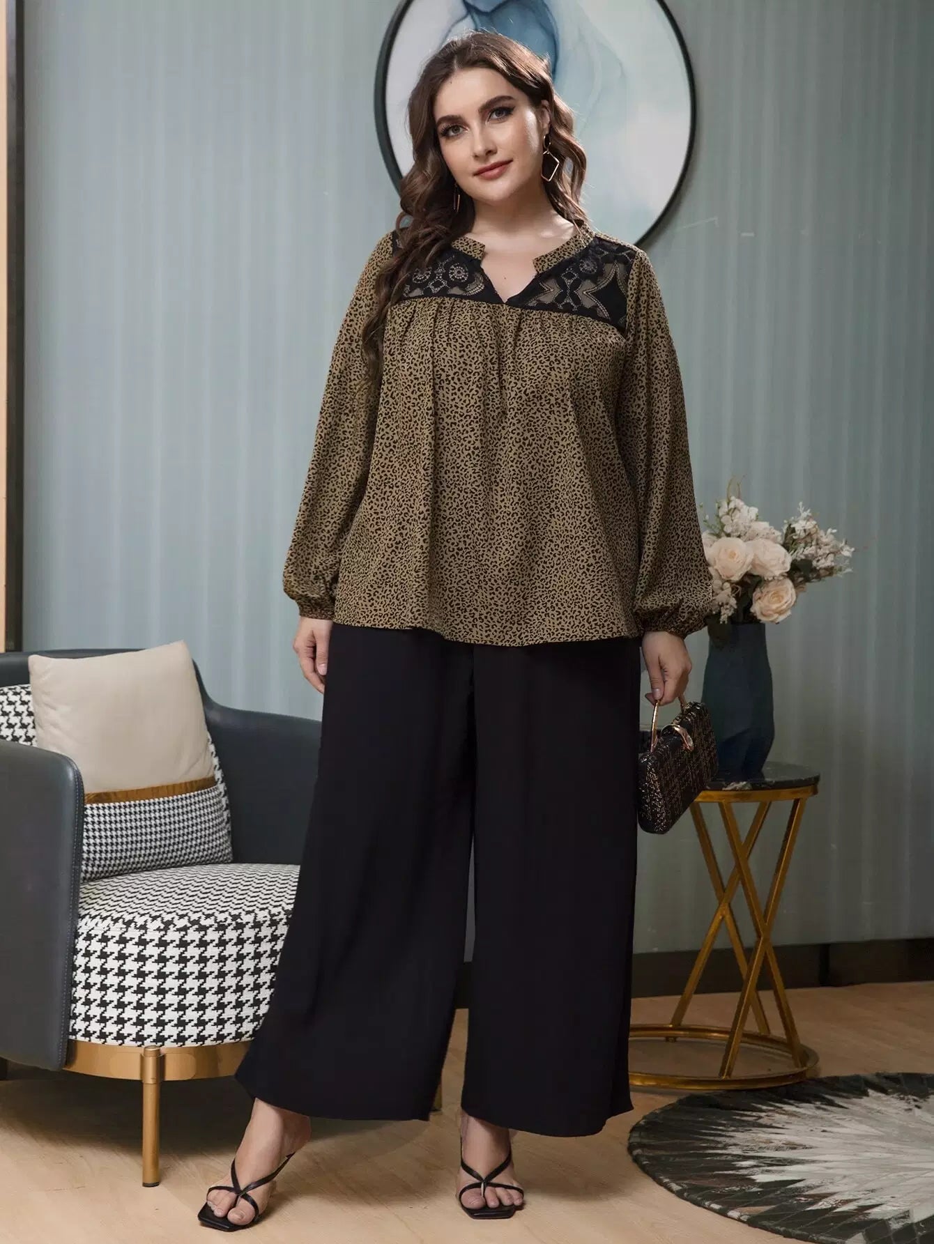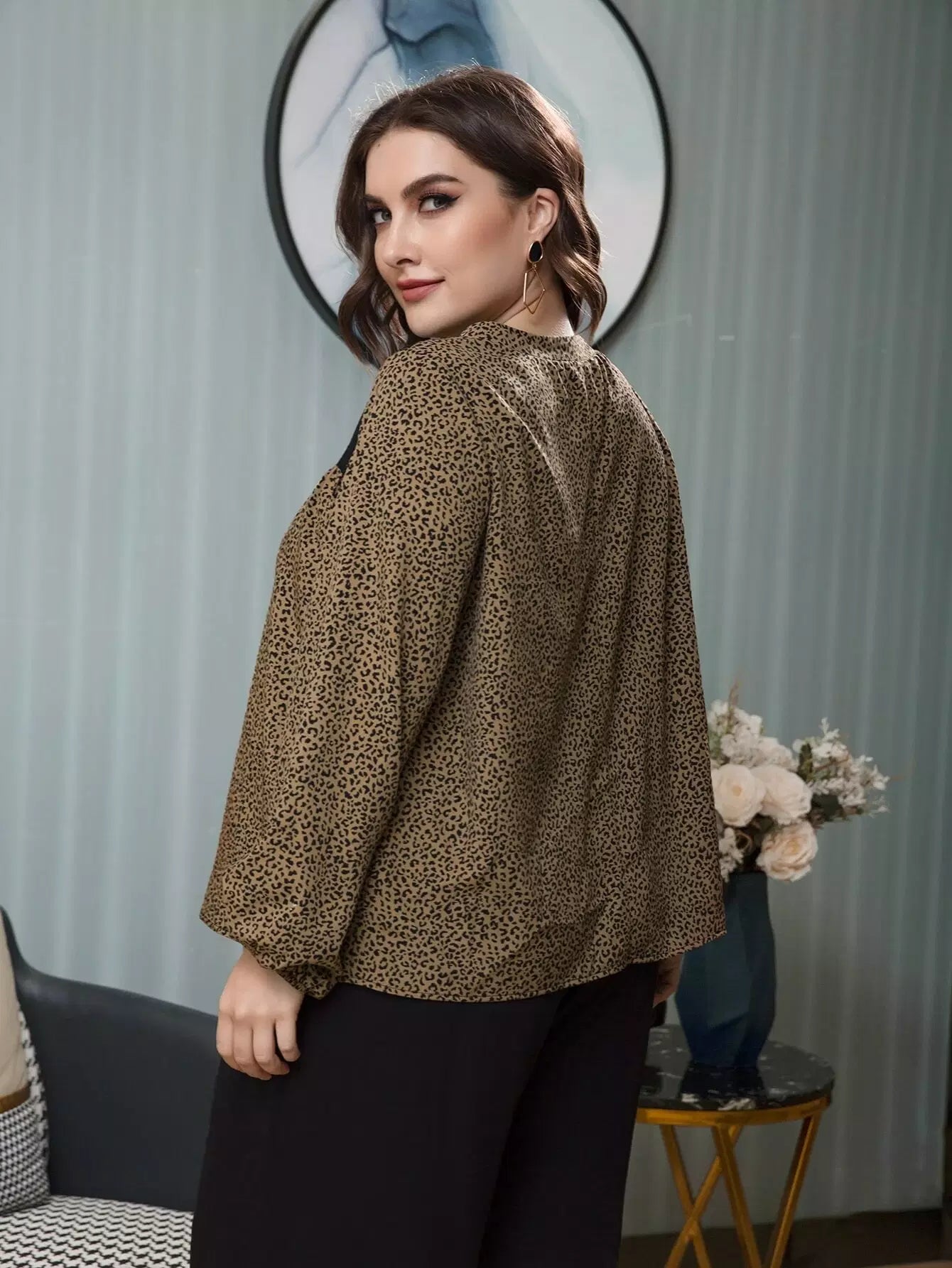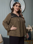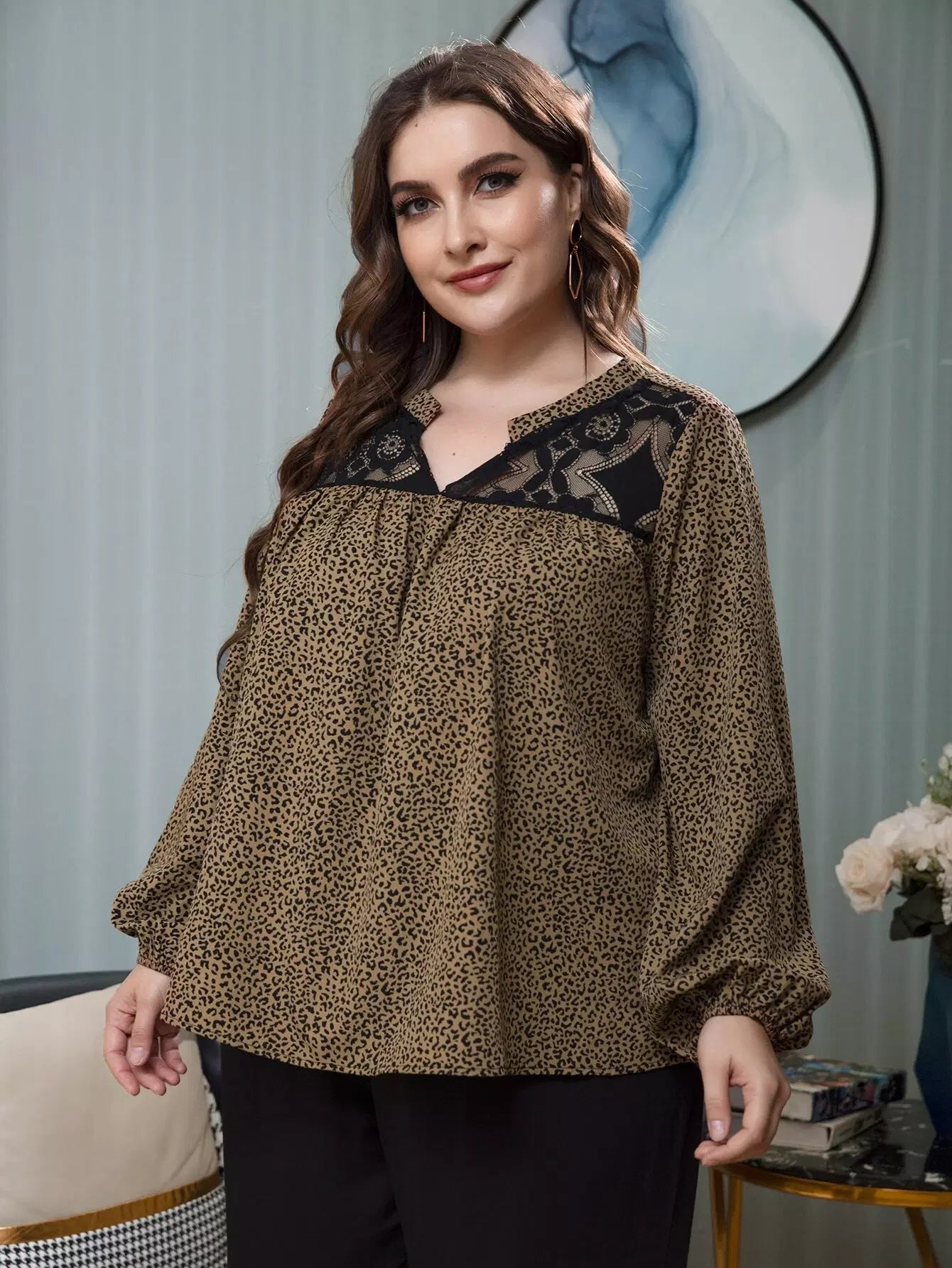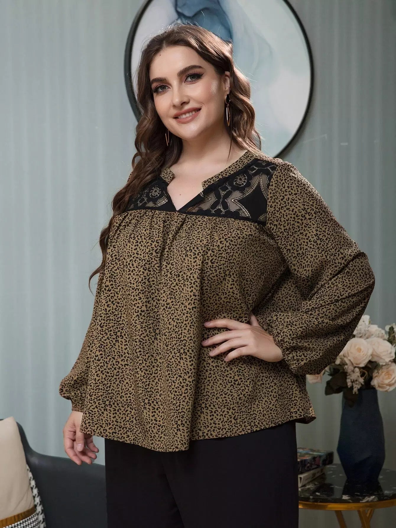 Plus Leopard Print Contrast Lace Bishop Sleeve Blouse
