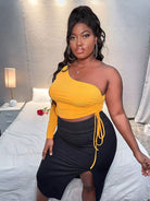 Plus One Shoulder Drawstring Knot Side Top