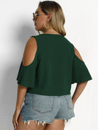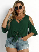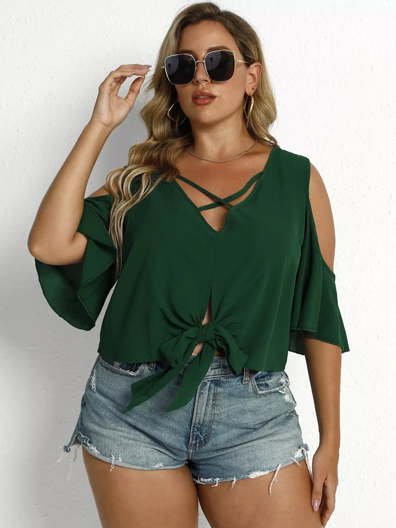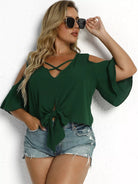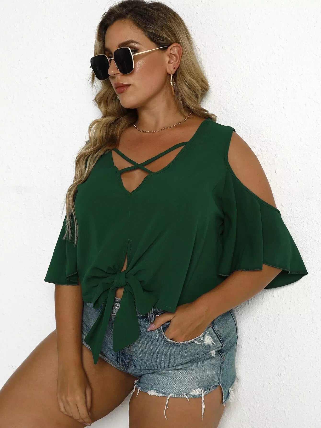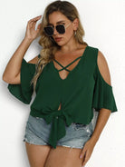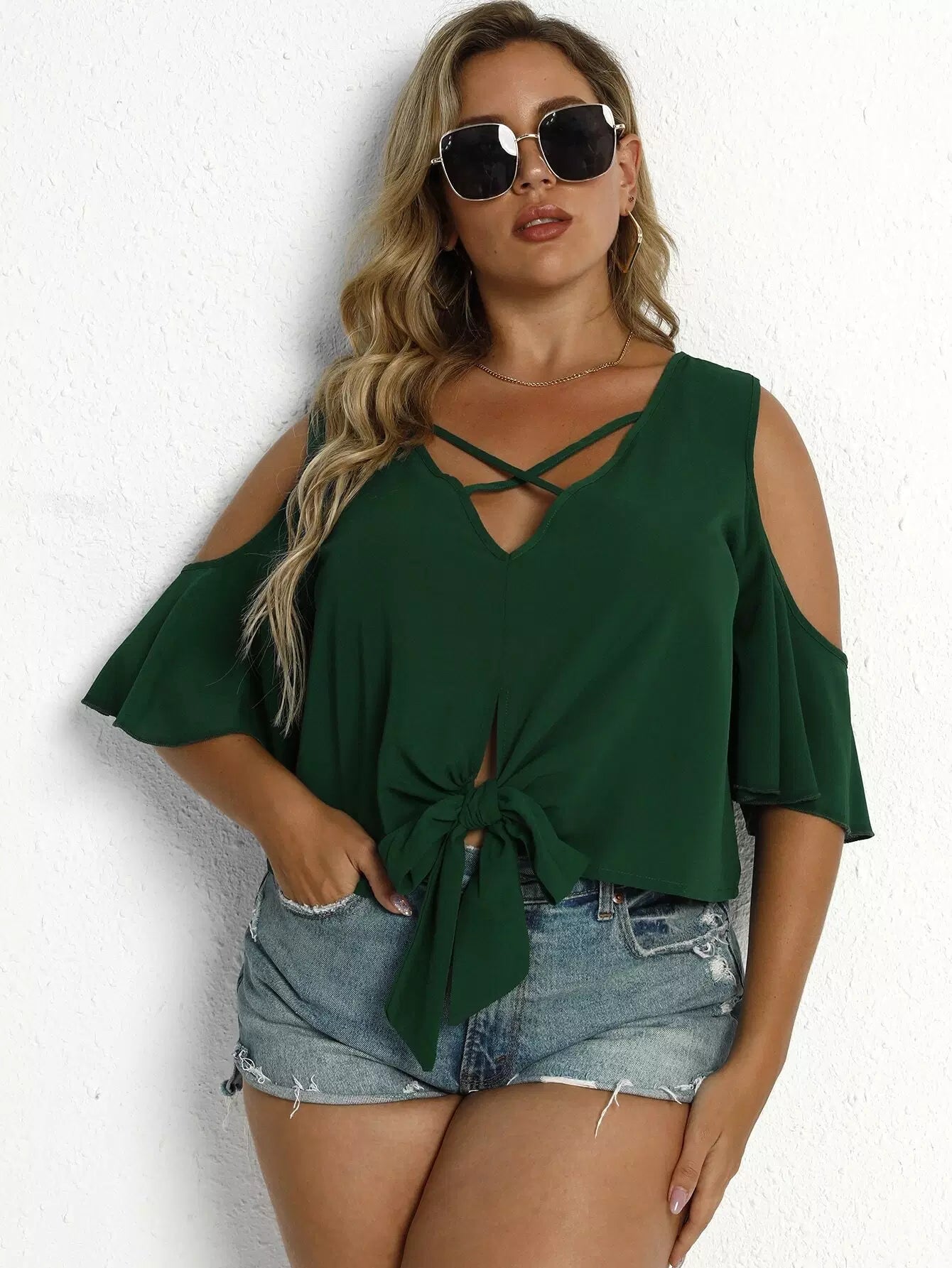 Plus Plunging Neck Cold Shoulder Knot Hem Blouse