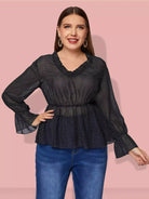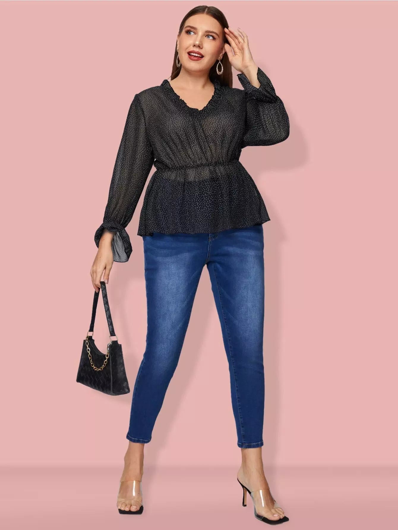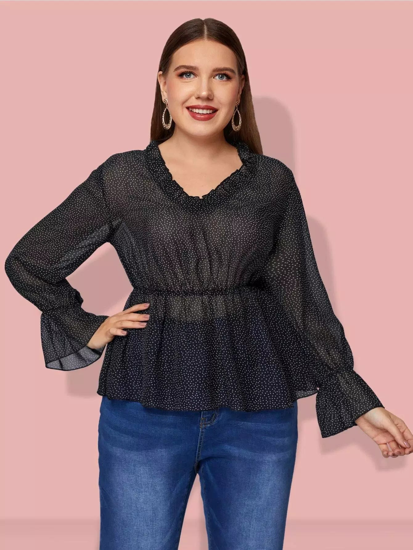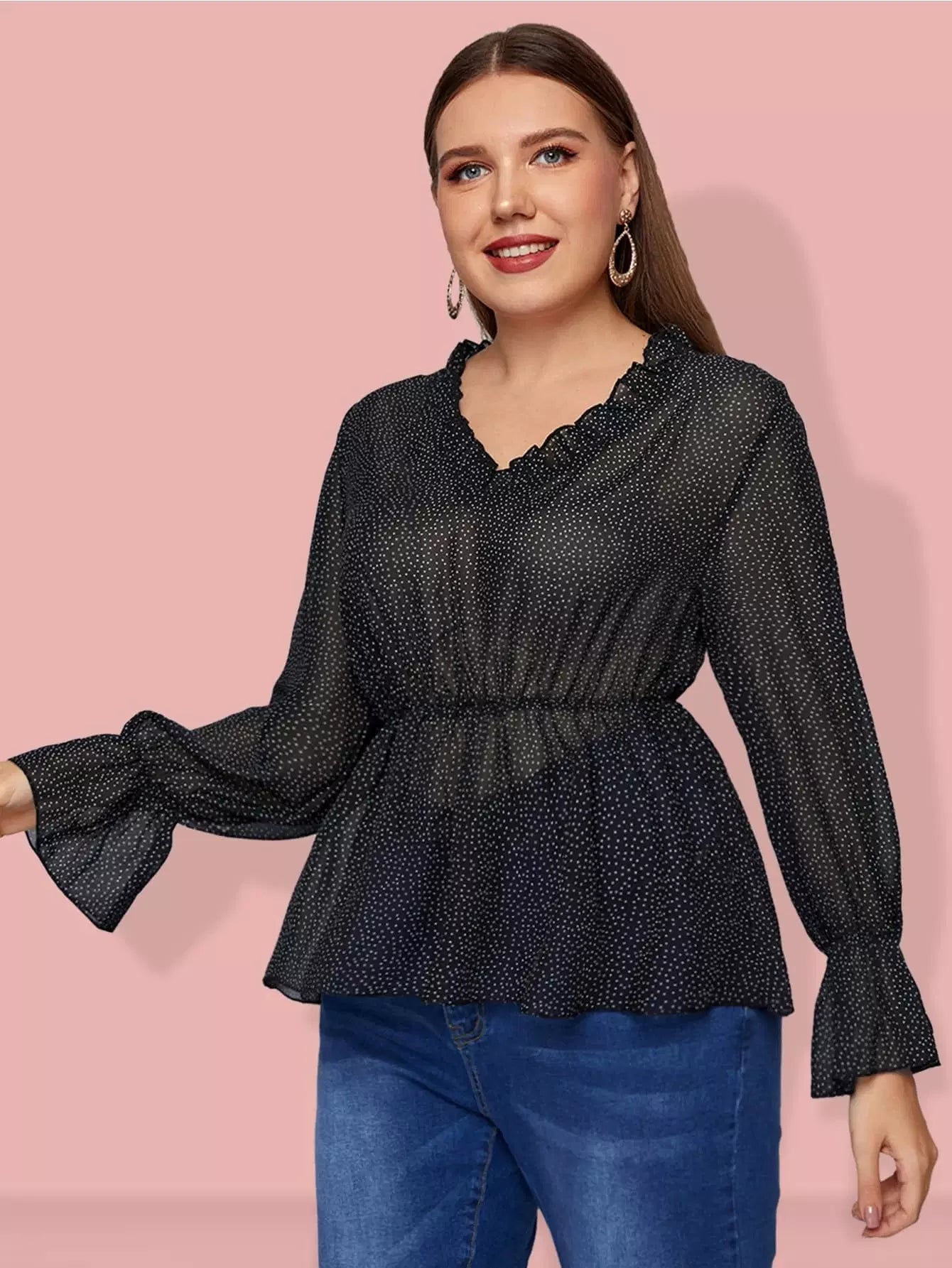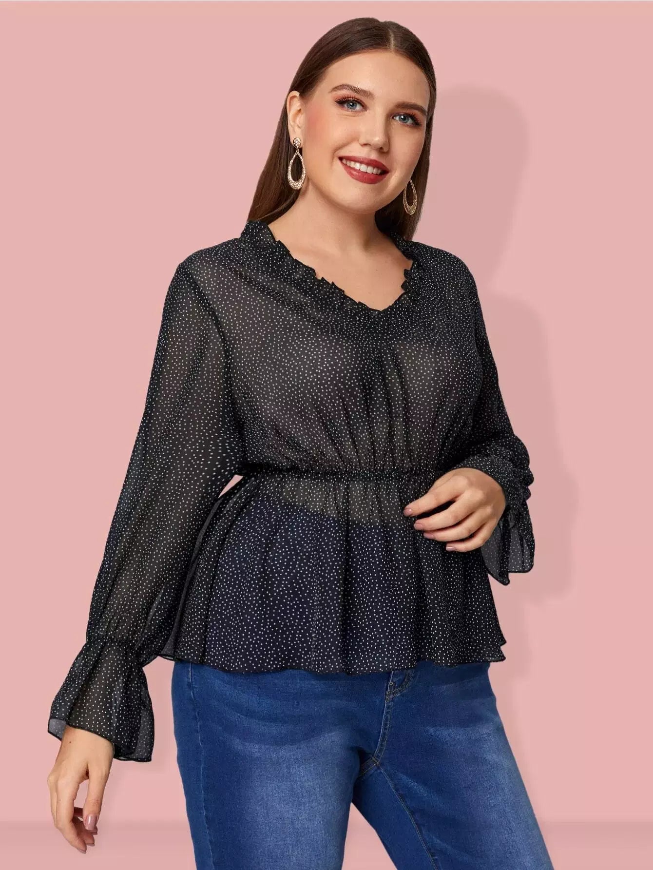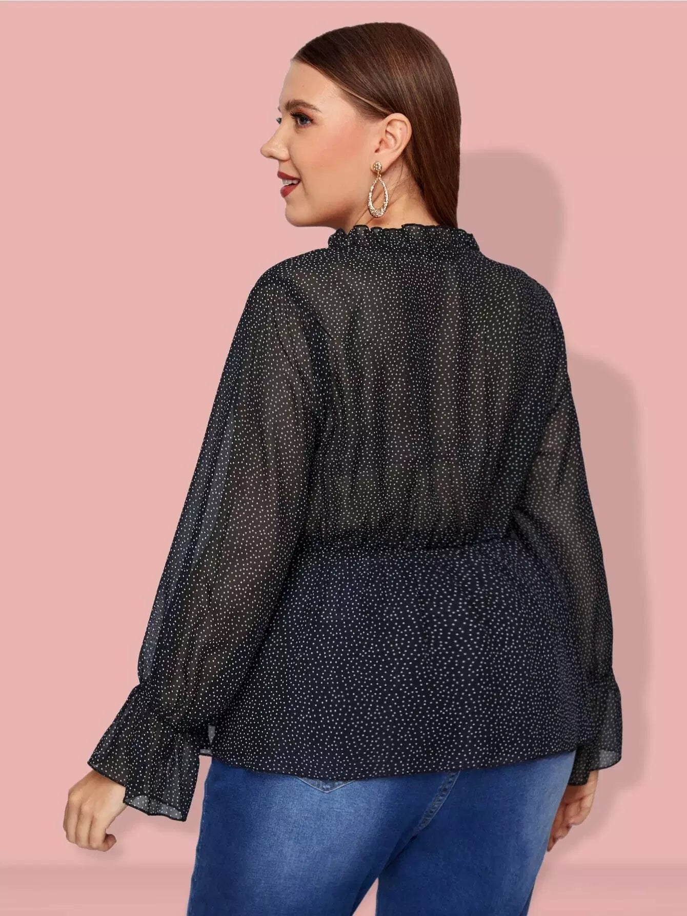 Women - Plus Polka Dot Flounce Sleeve Peplum Sheer Blouse