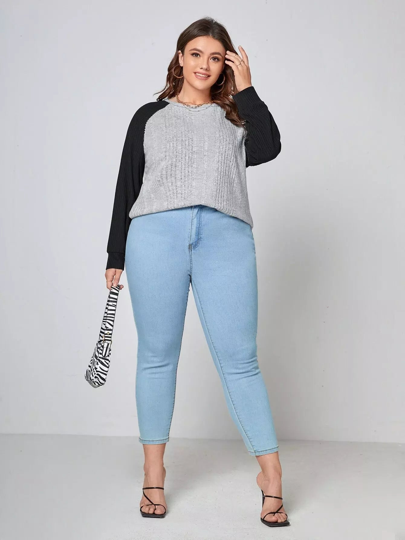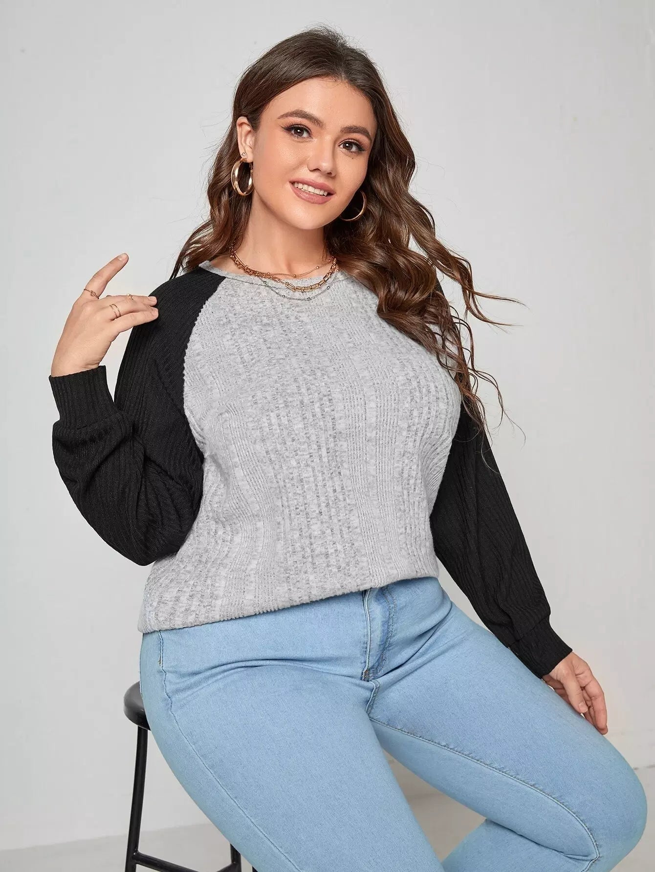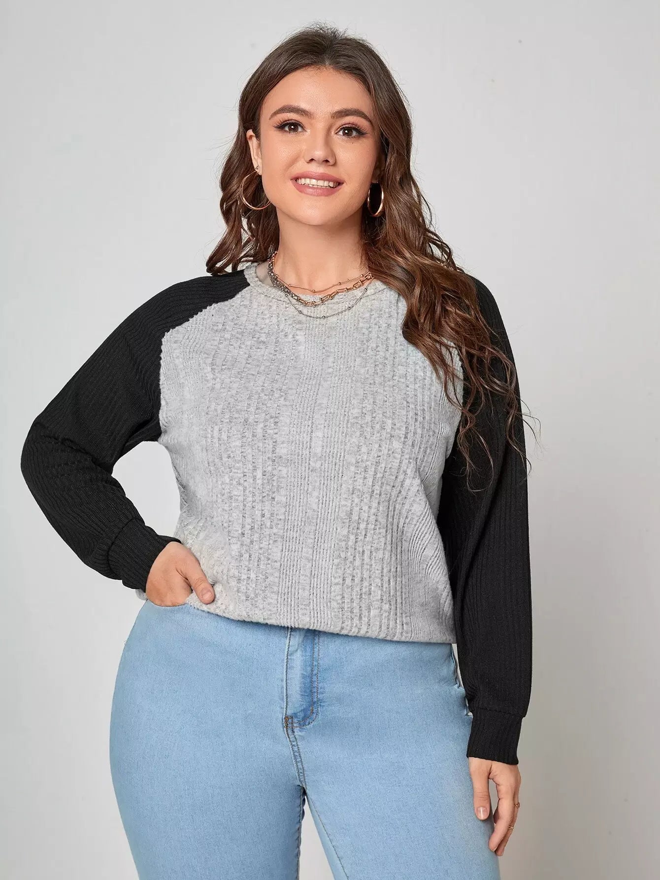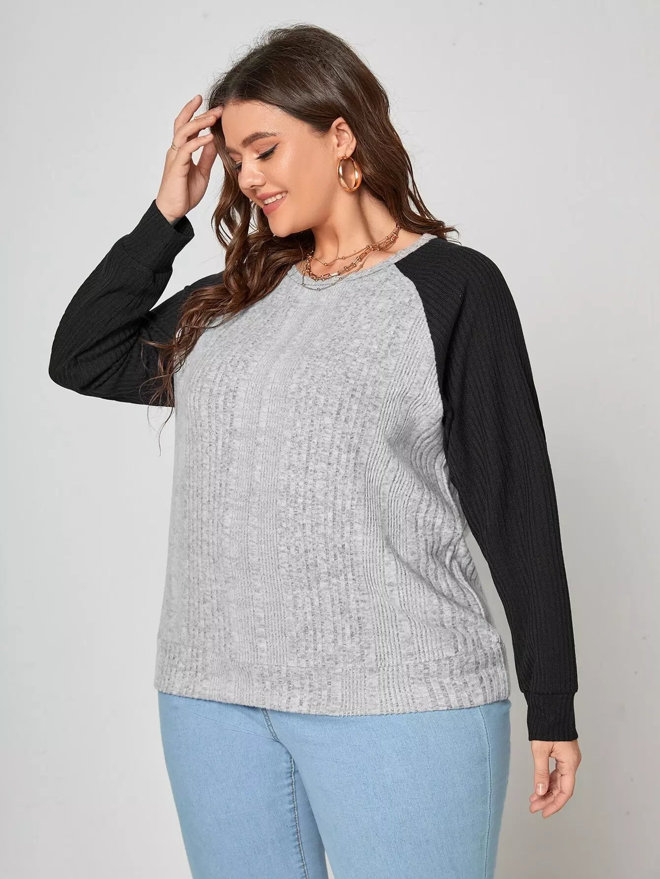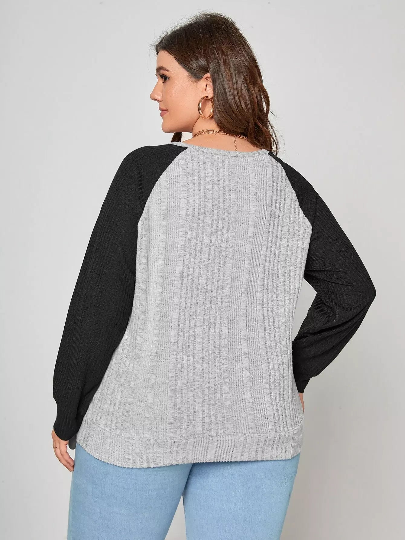 Plus Rib Knit Contrast Raglan Sleeve Tee