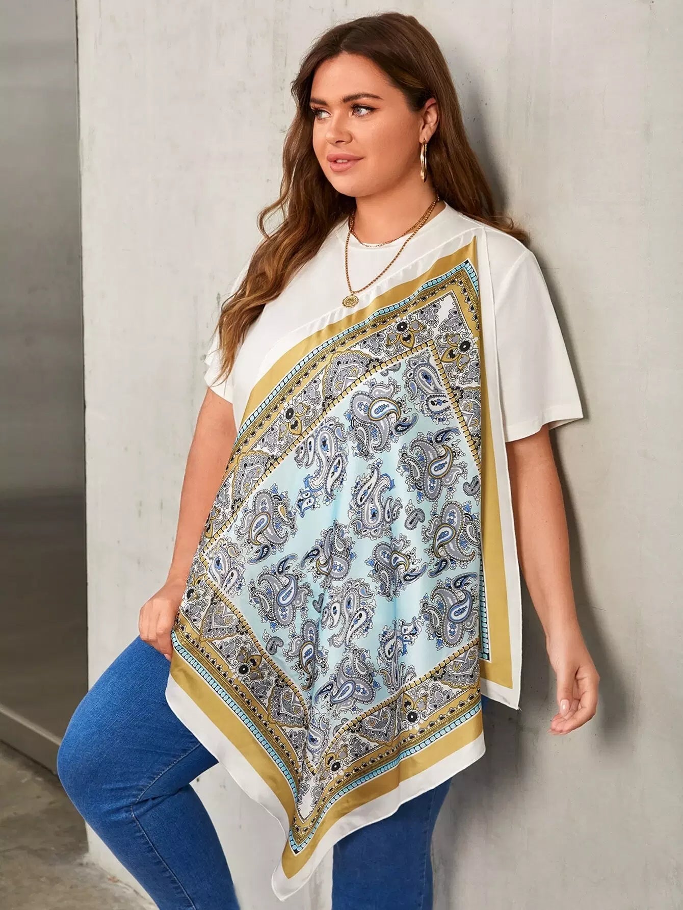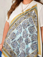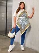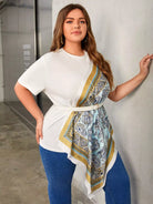 Plus Scarf Print Asymmetrical Hem Top Without Belt