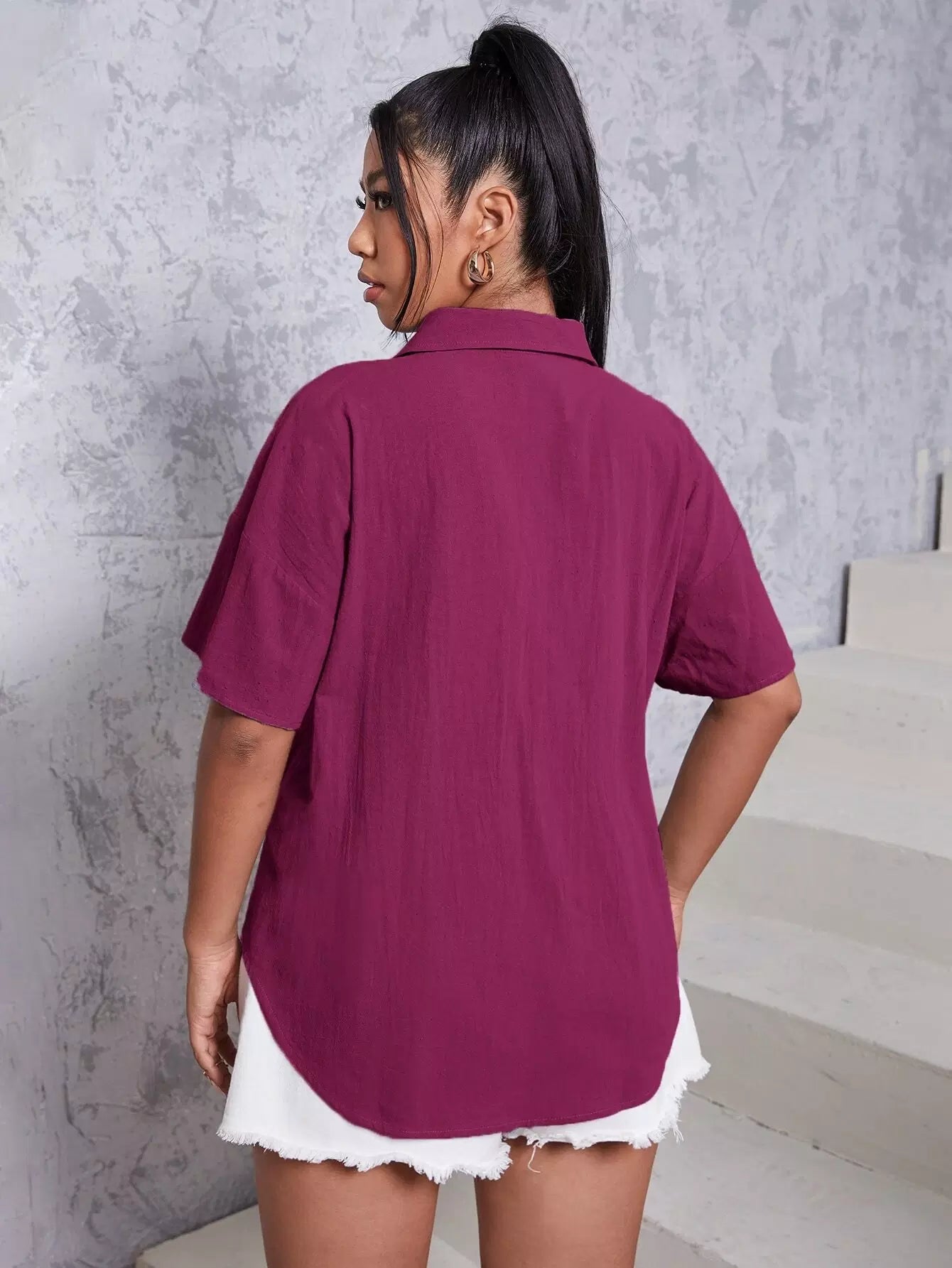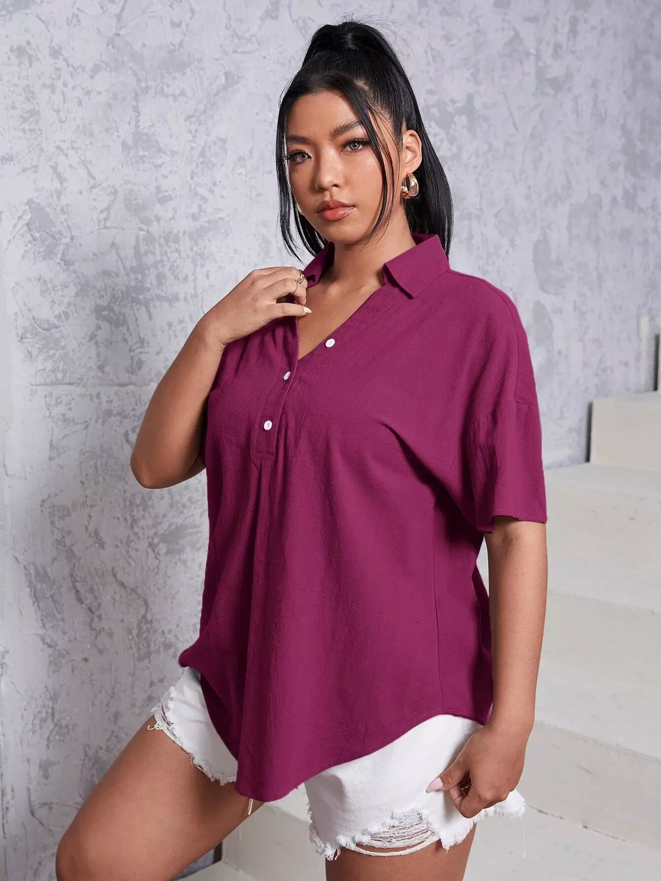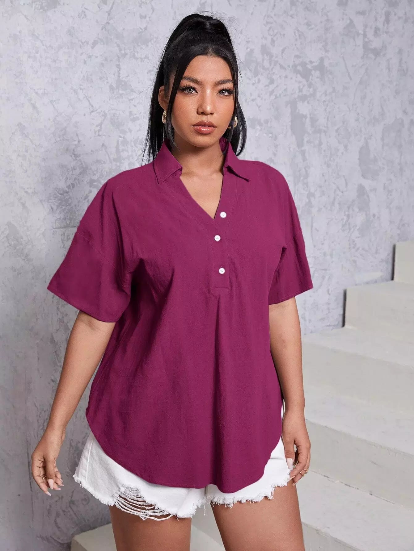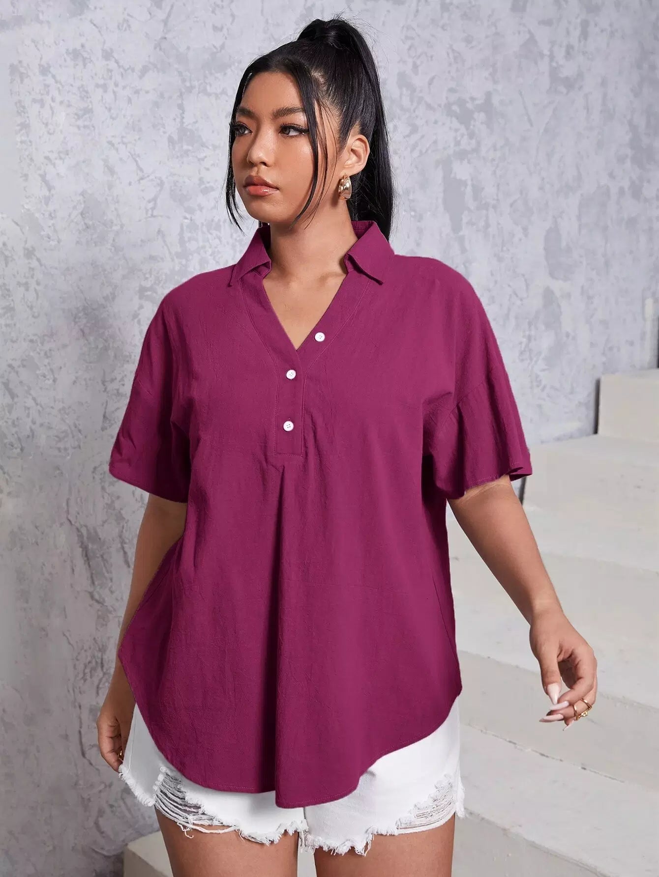 Plus Solid V-Neck Buttoned Curved Hem Blouse