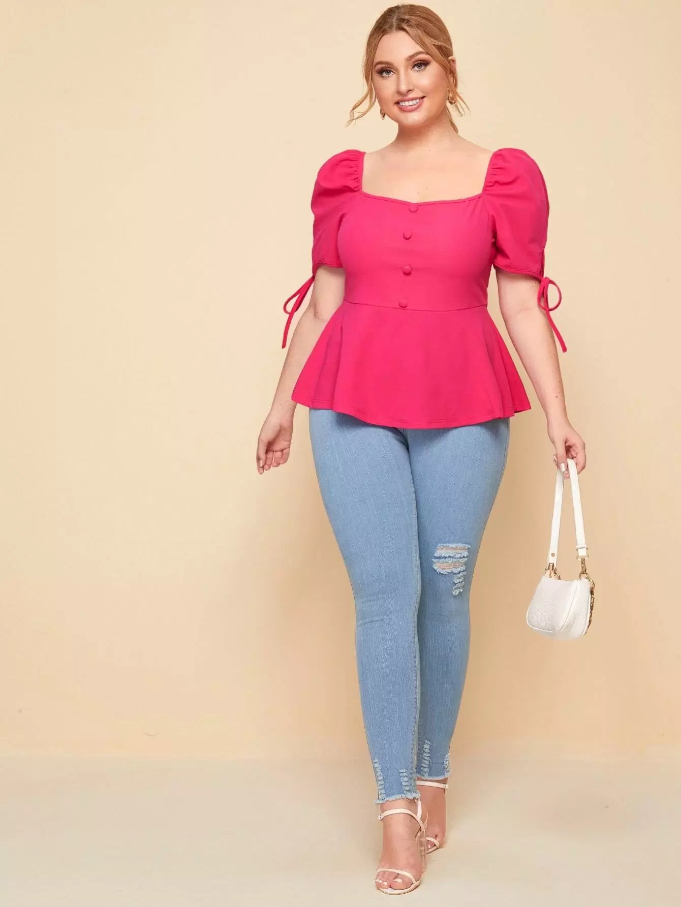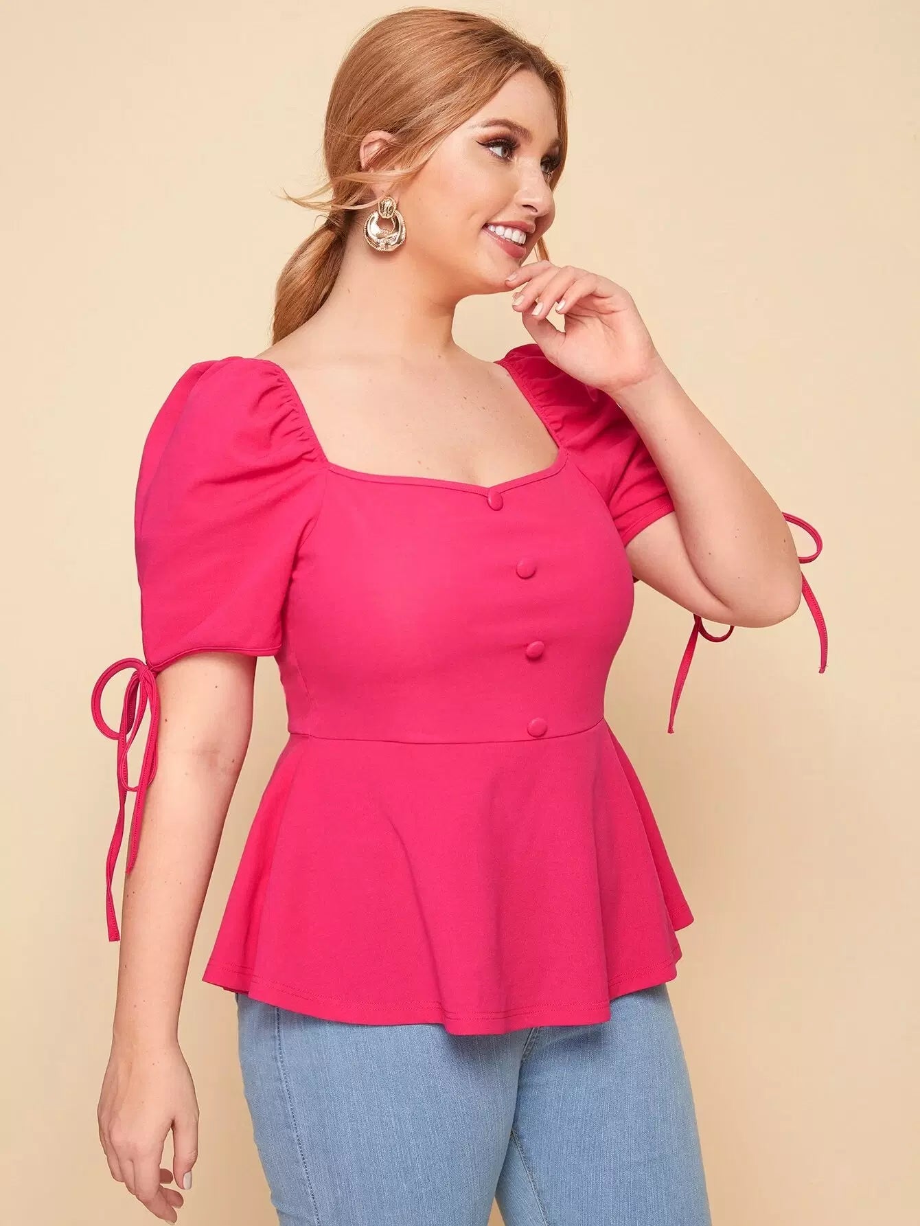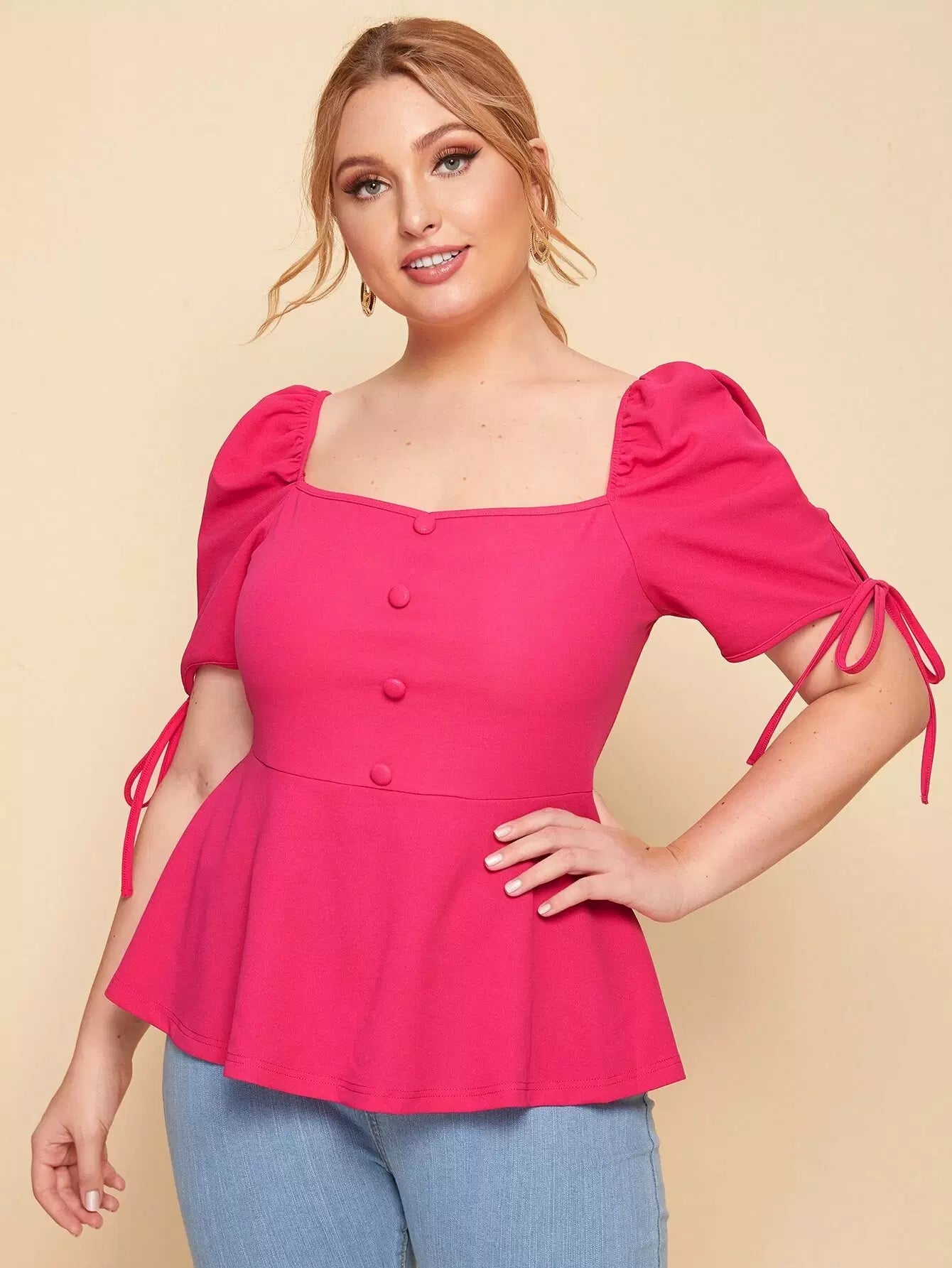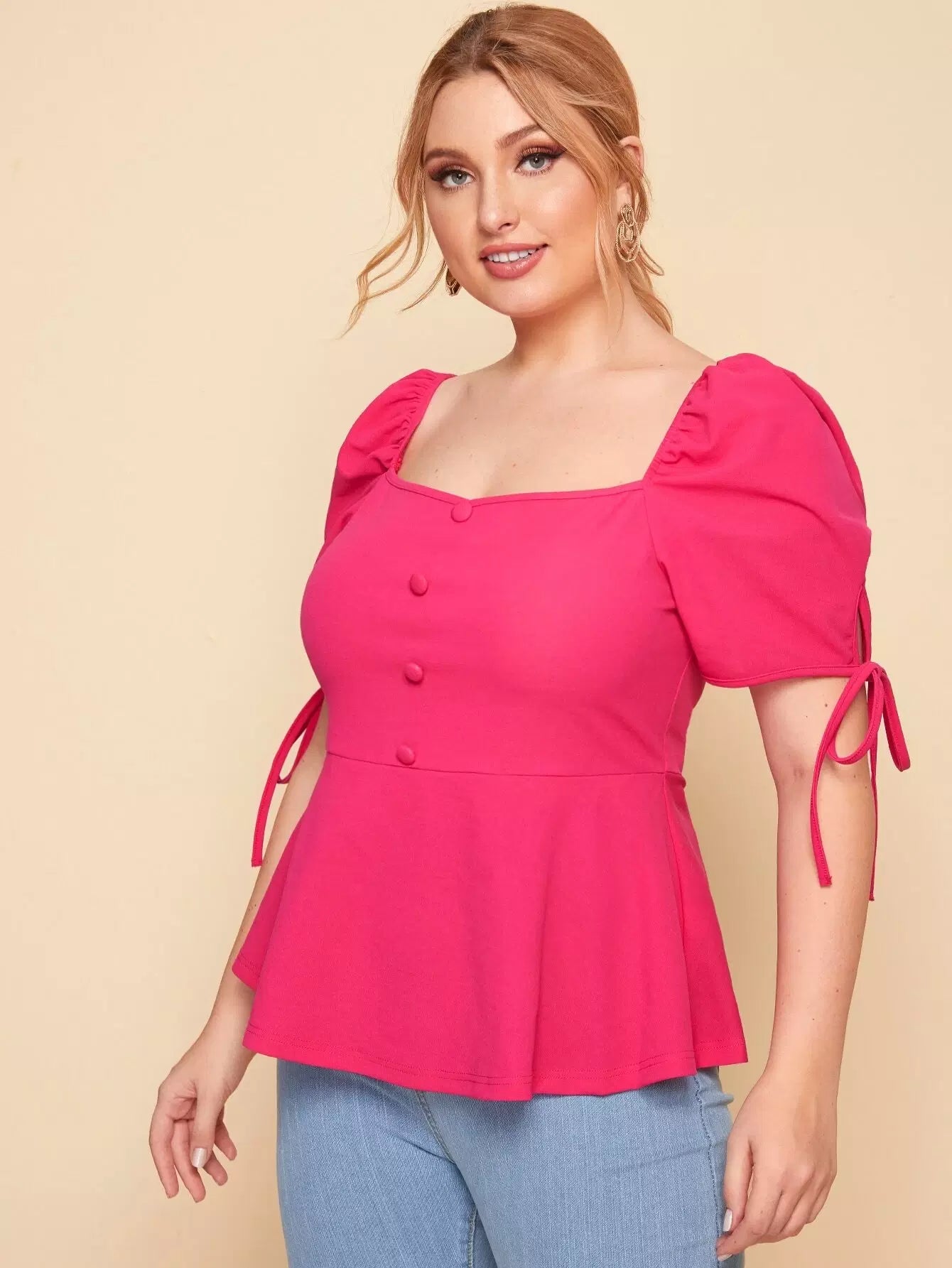 Plus Square Neck Knot Puff Sleeve Peplum Top
