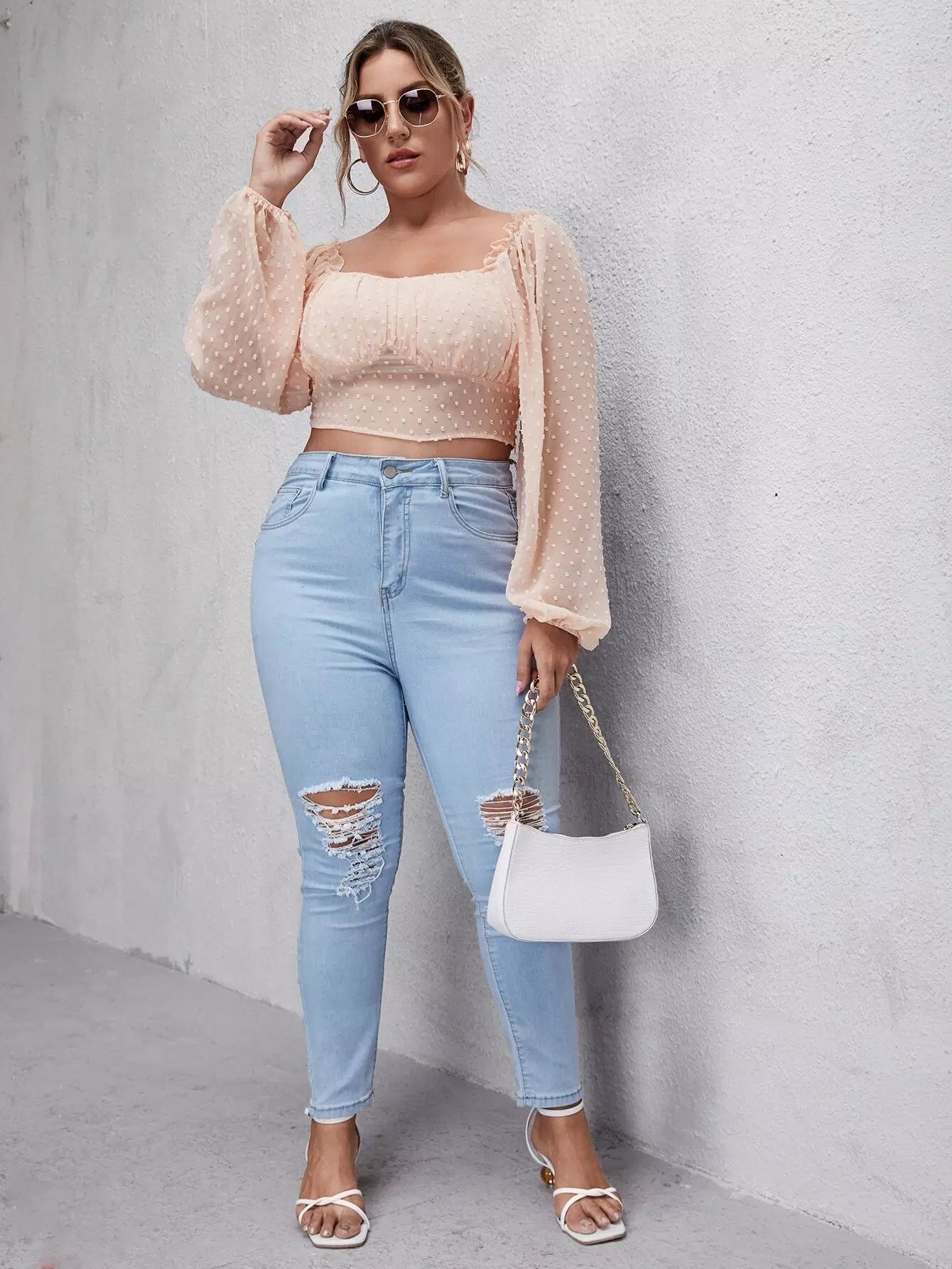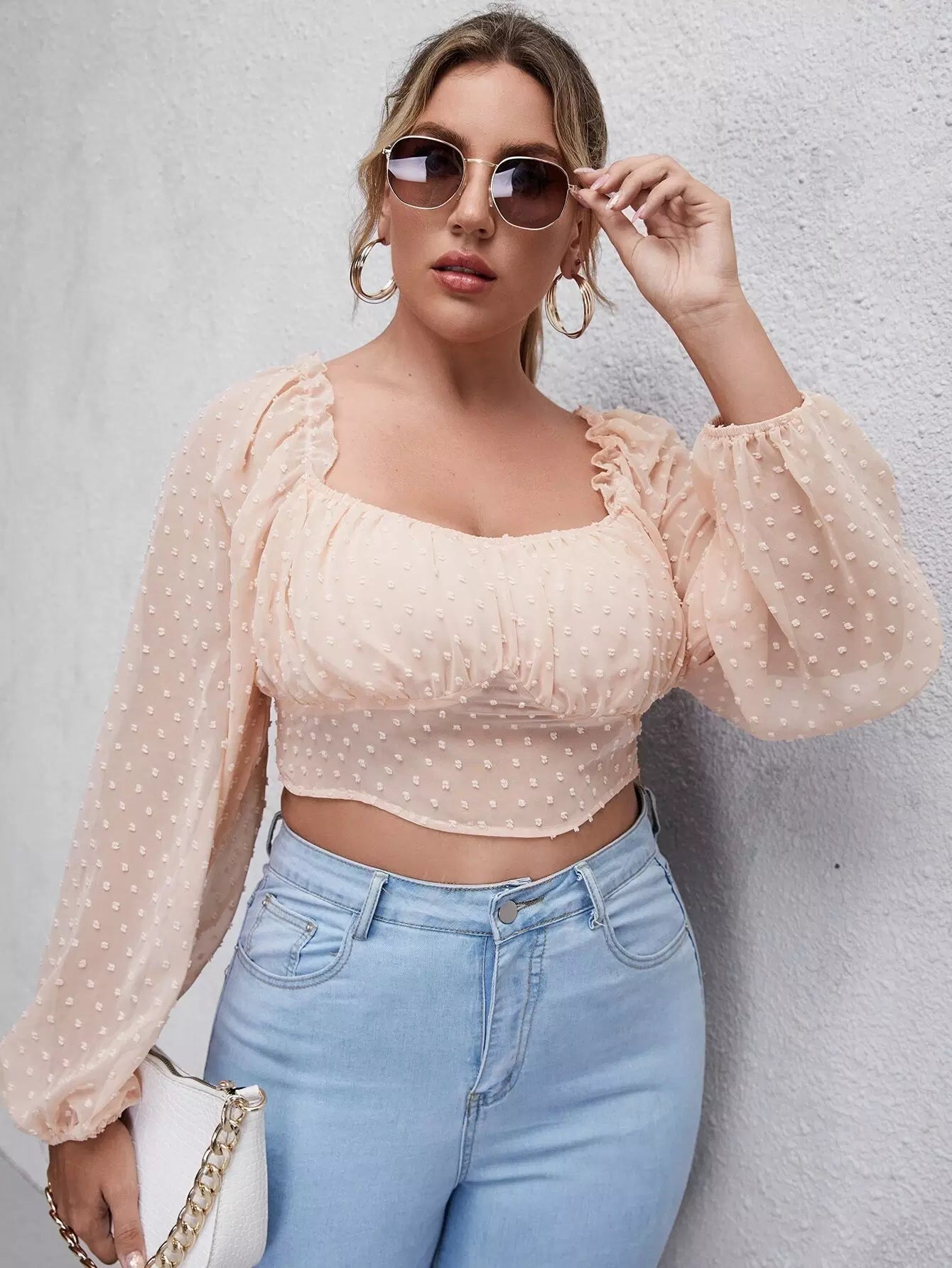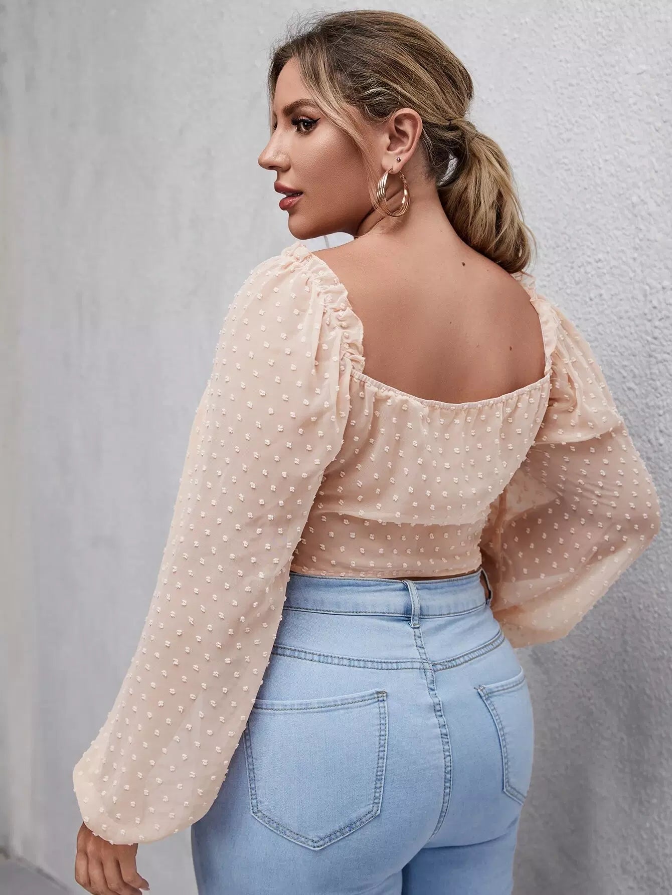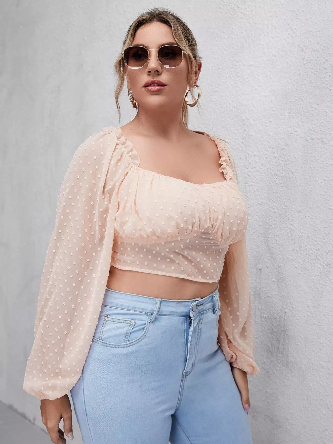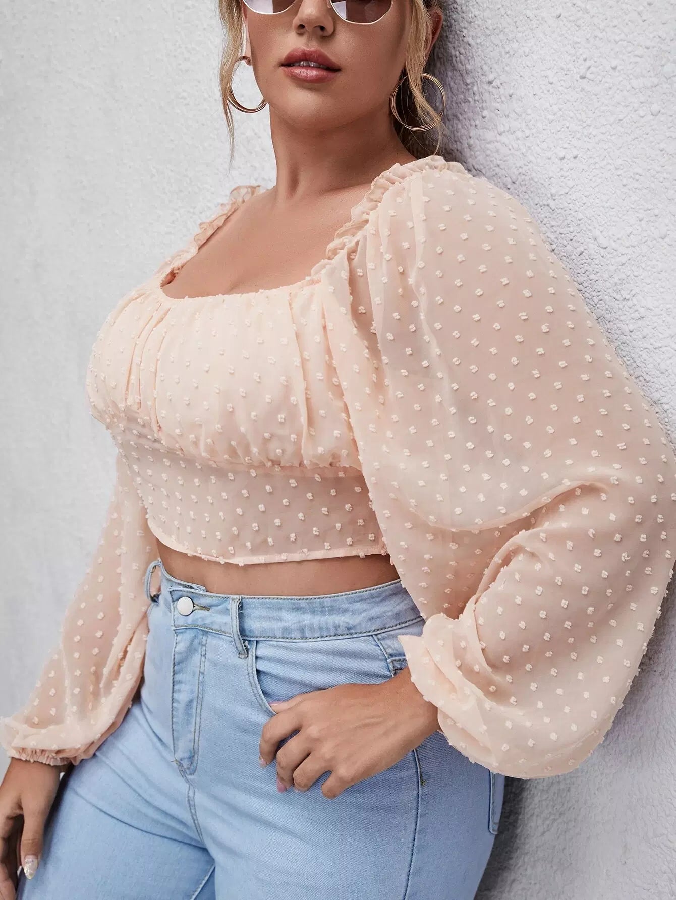 Plus Size Clothing - Plus Swiss Dot Bishop Sleeve Crop Blouse