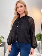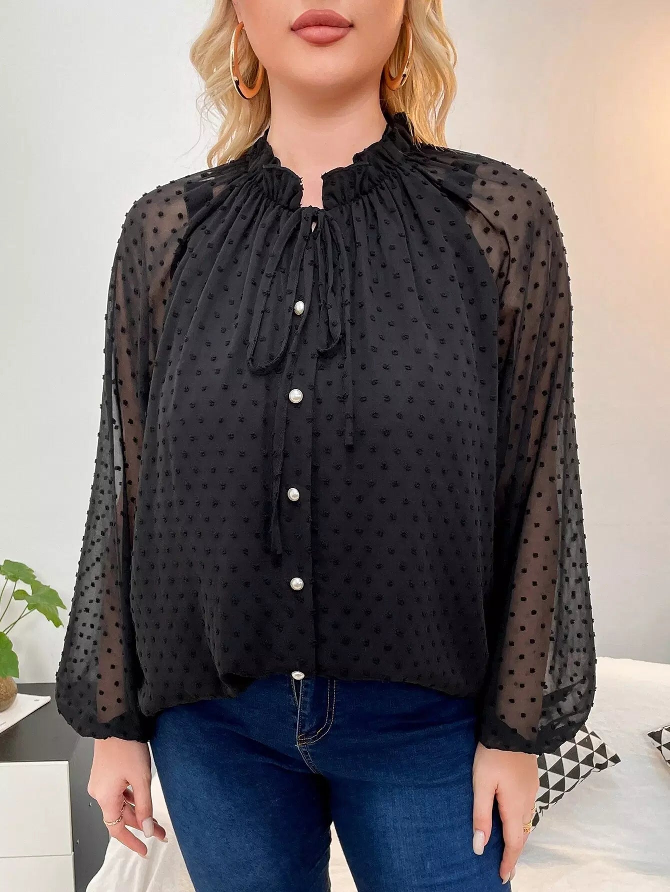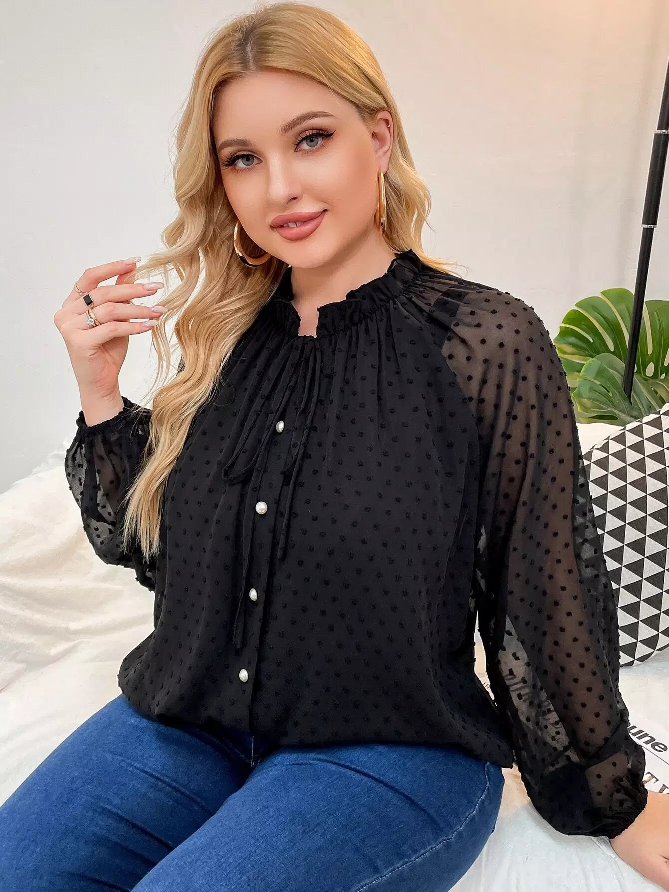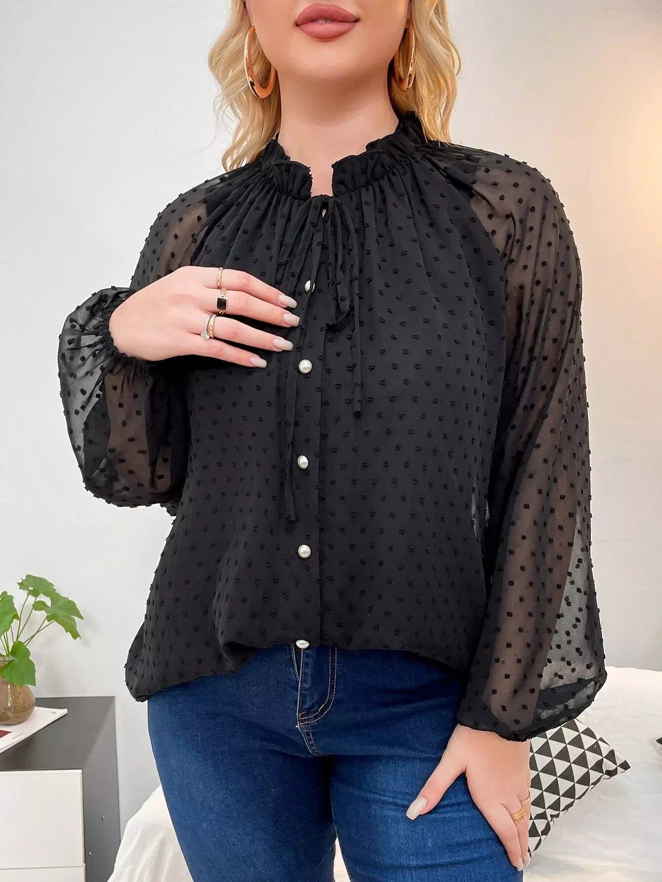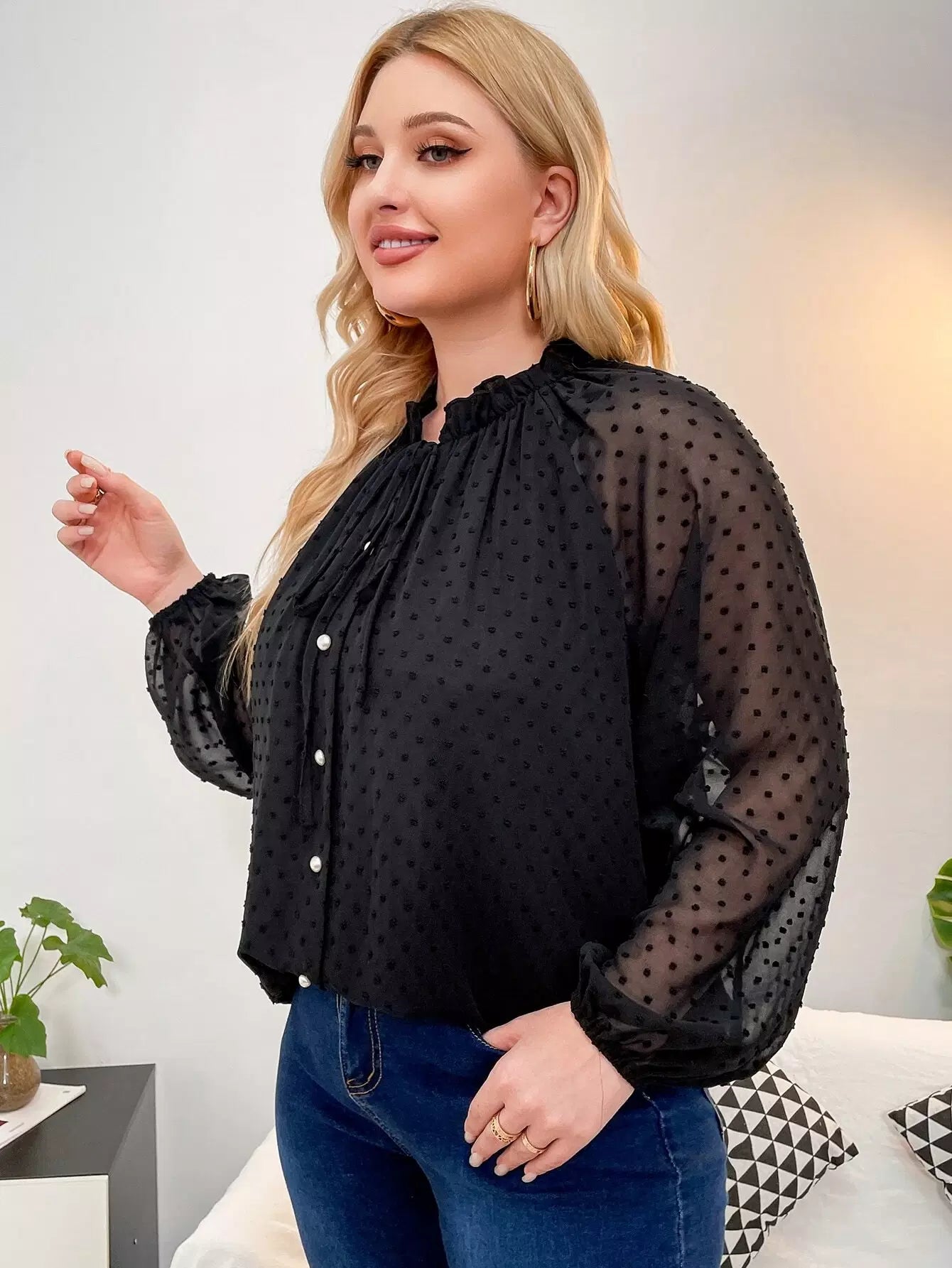 Plus Swiss Dot Lantern Sleeve Frilled Tie Neck Blouse
