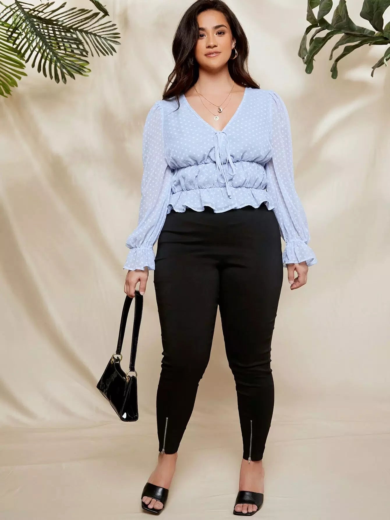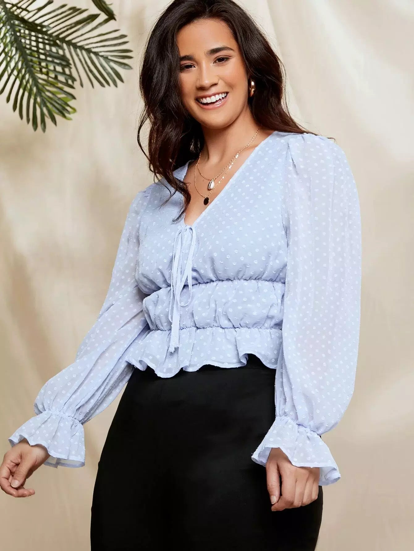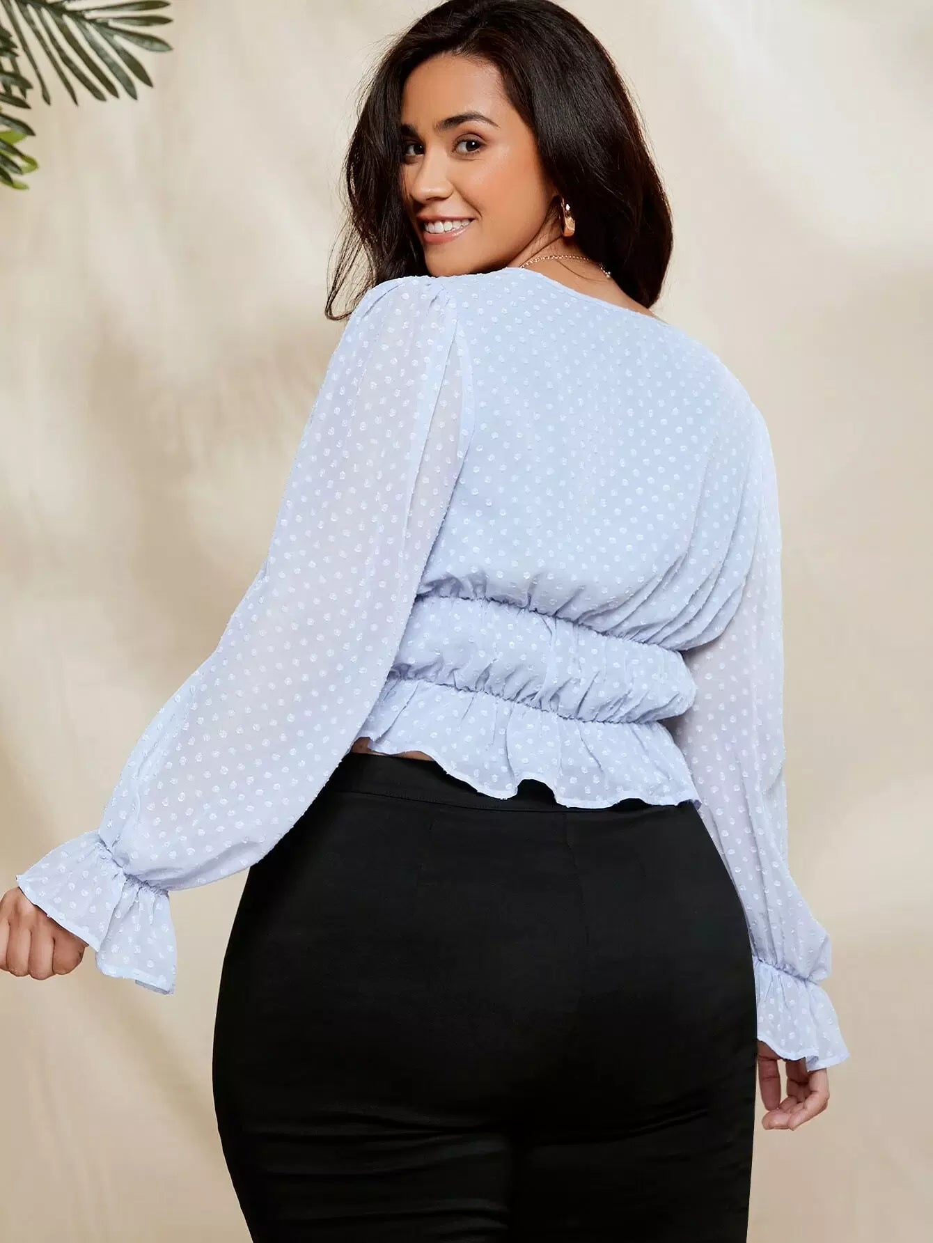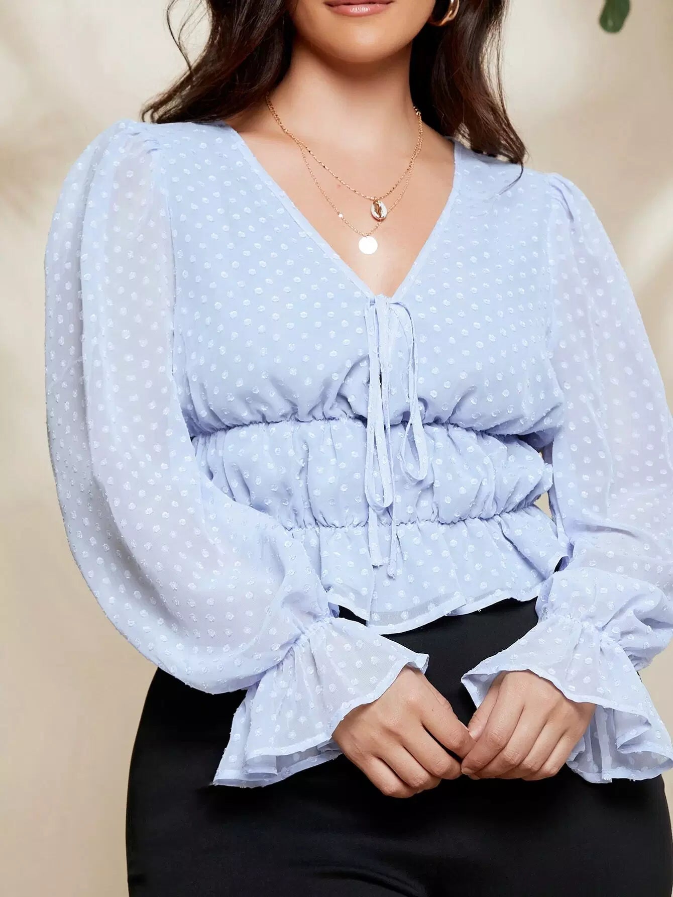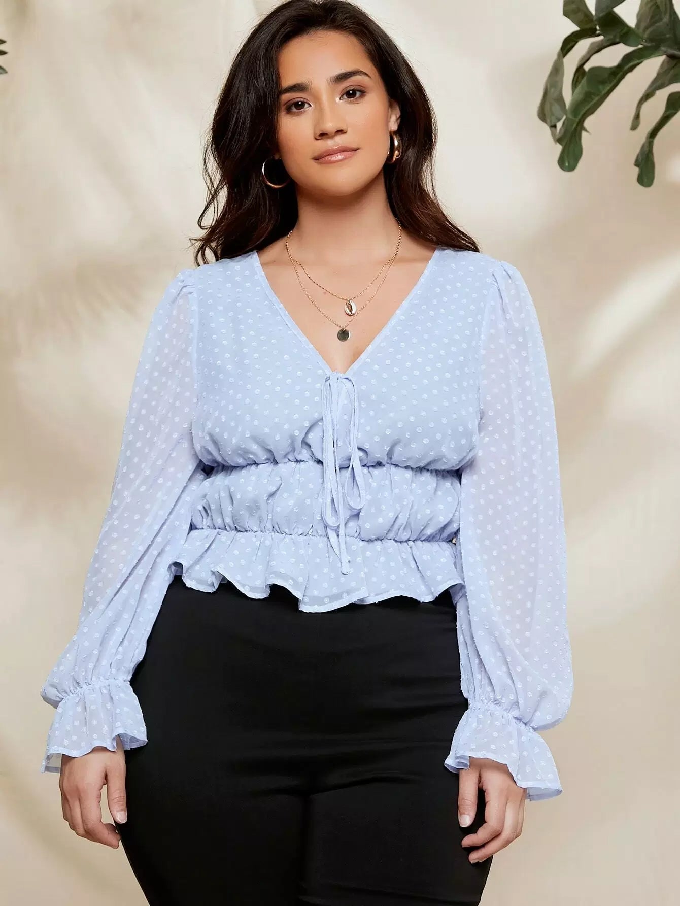 Women - Plus Tie Front Swiss Dot Peplum Top