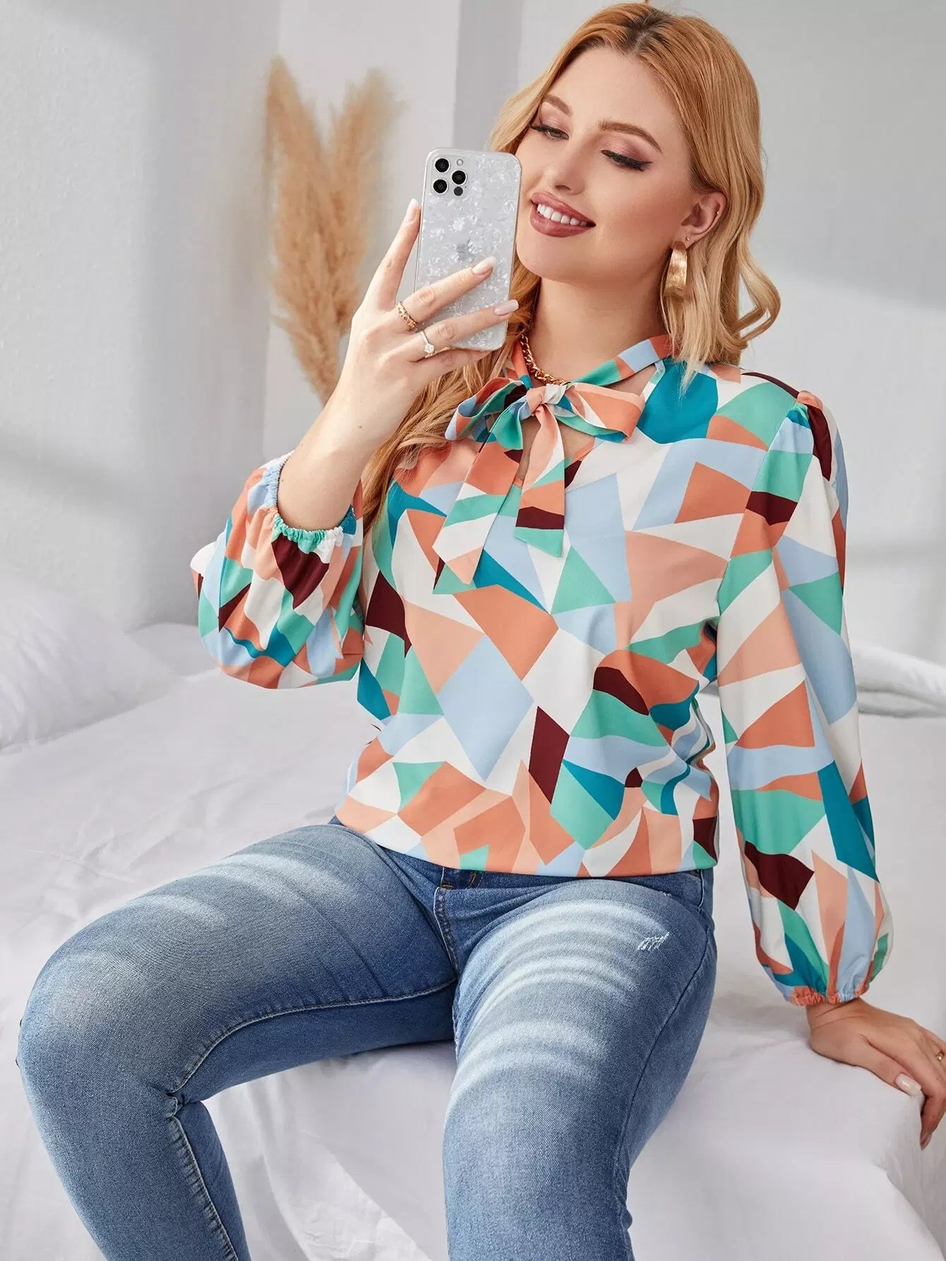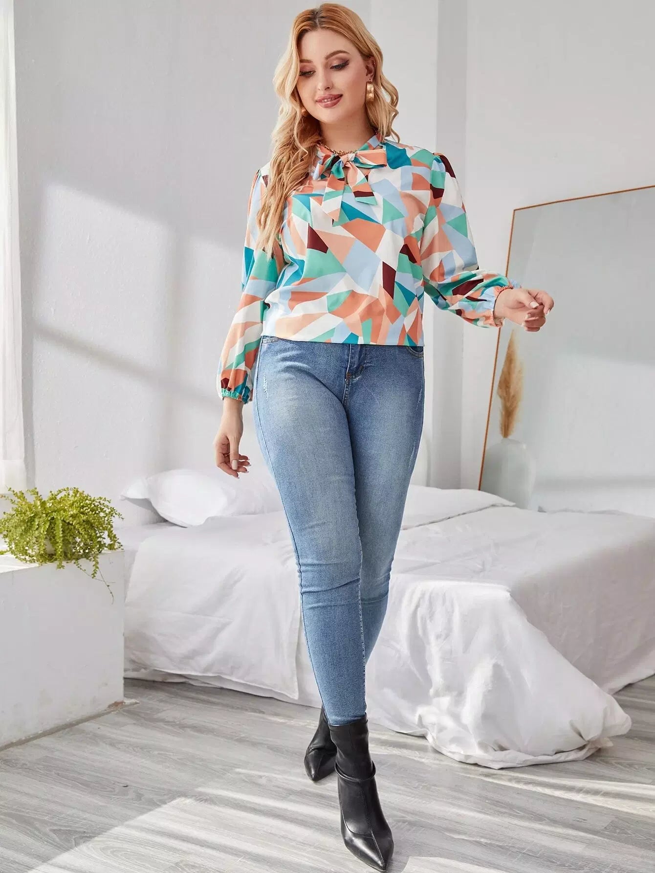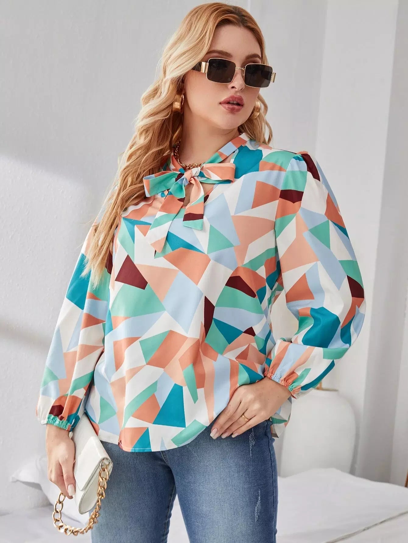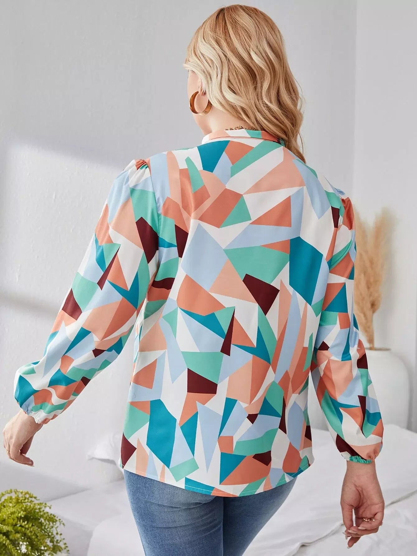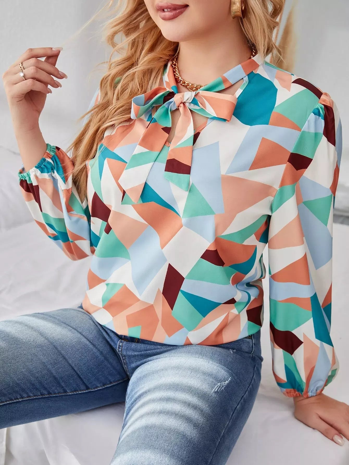 Plus Tie Neck Allover Geo Print Blouse