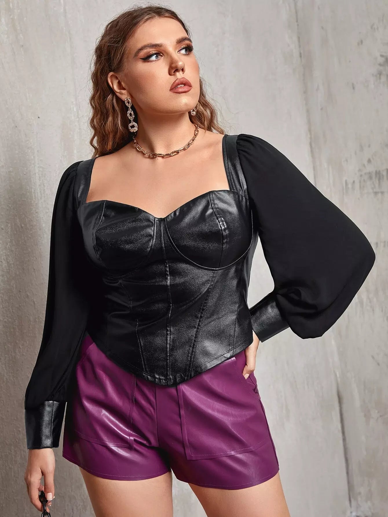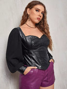 Plus Zipper Back Lantern Sleeve Bustier PU Top