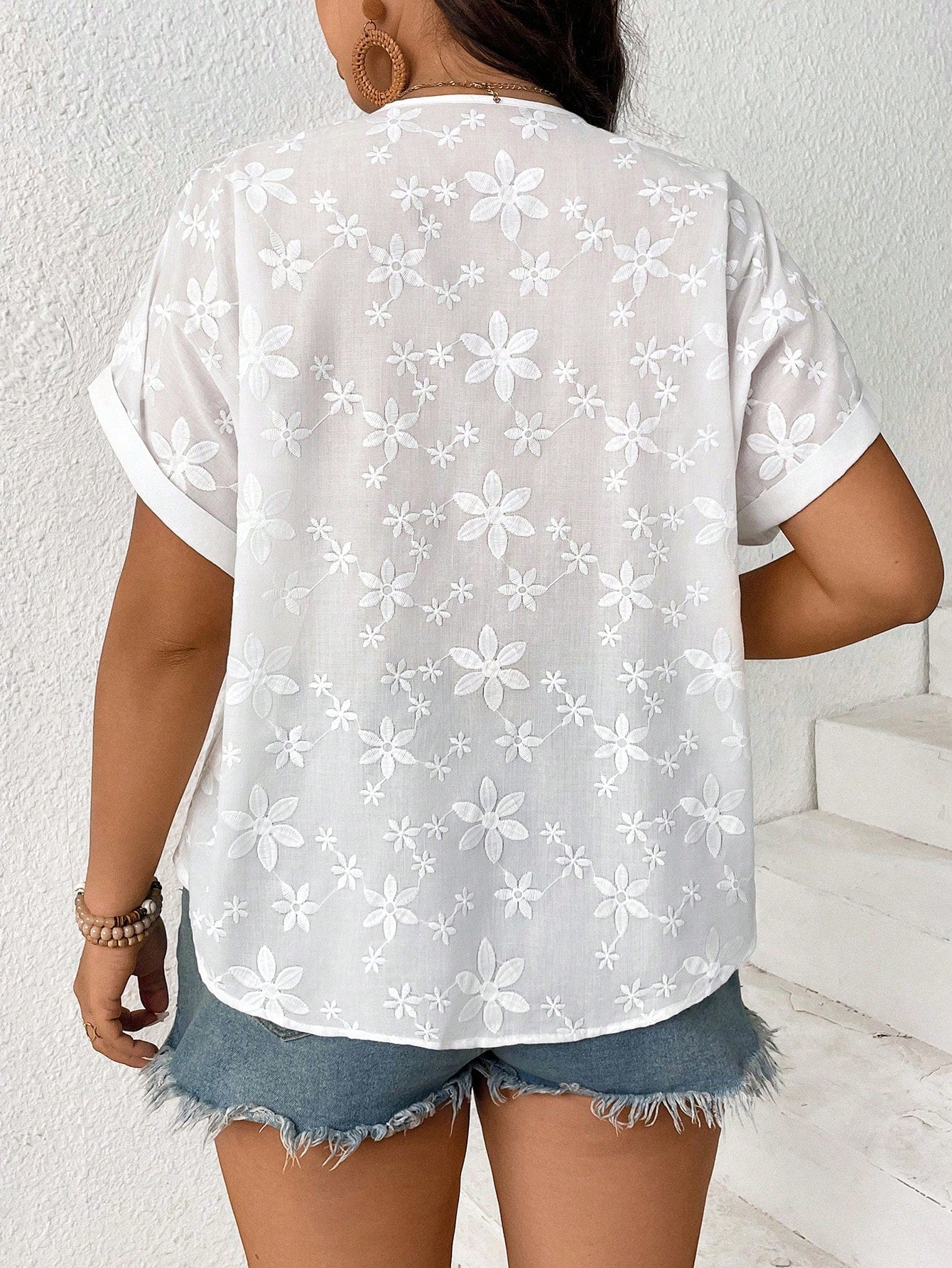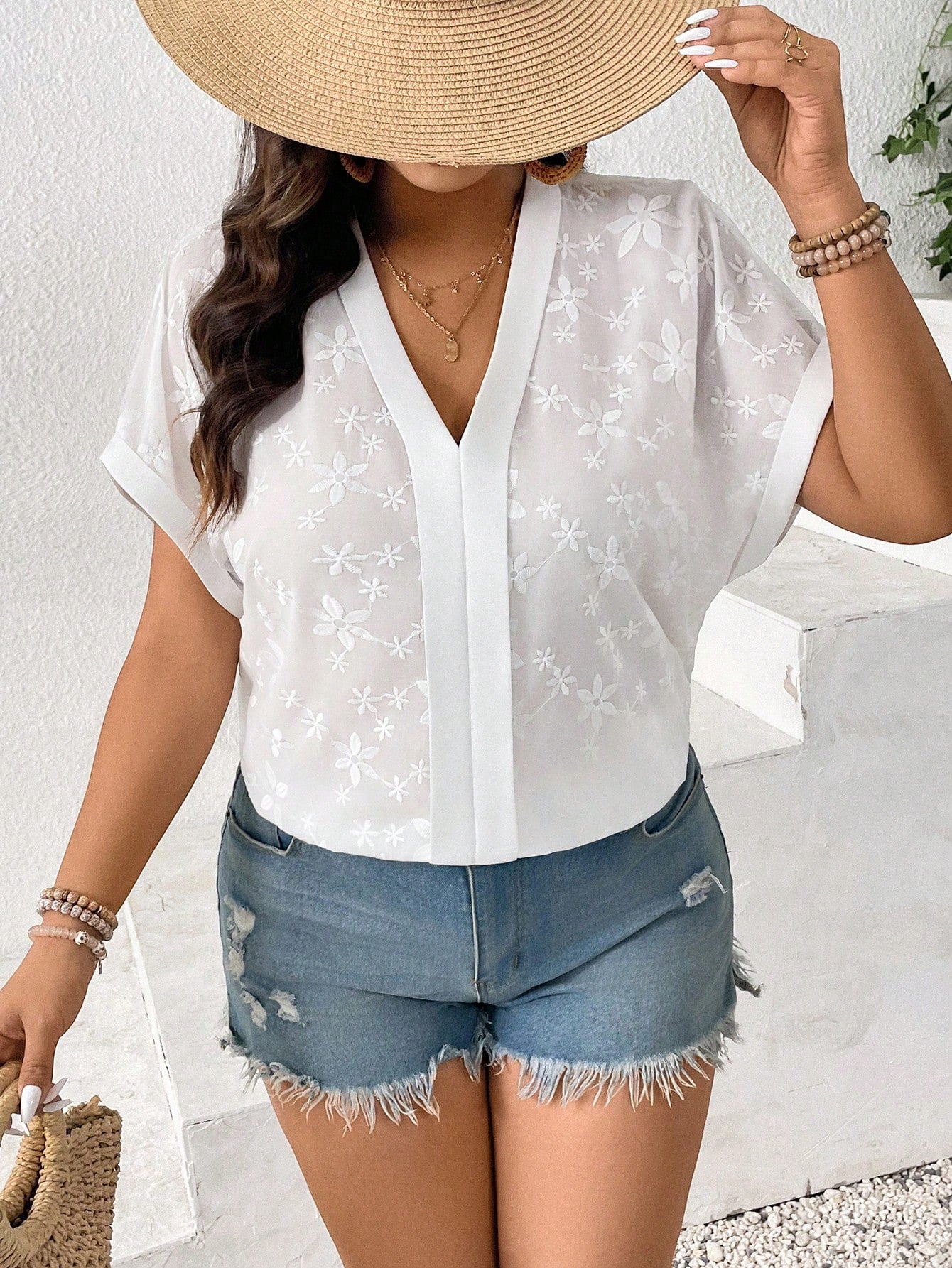 SHEIN Frenchy Plus Size Leisure Floral Embroidery Batwing Sleeve Blouse
