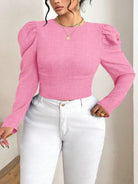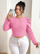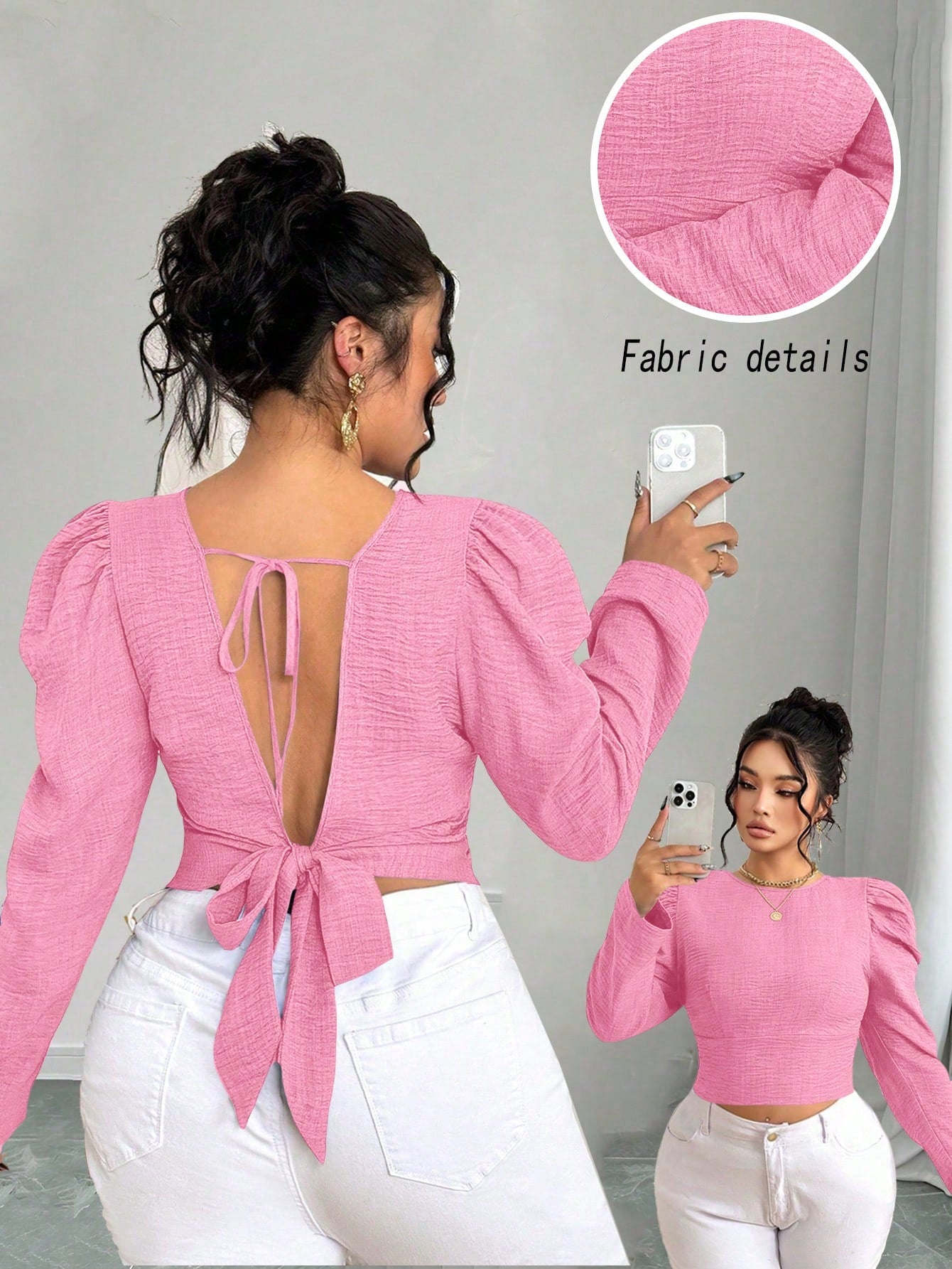Celure Popular Faux Denim Effect Casual Crew Neck Long Sleeve Blouse, Ruched Cinched Waist, Backless