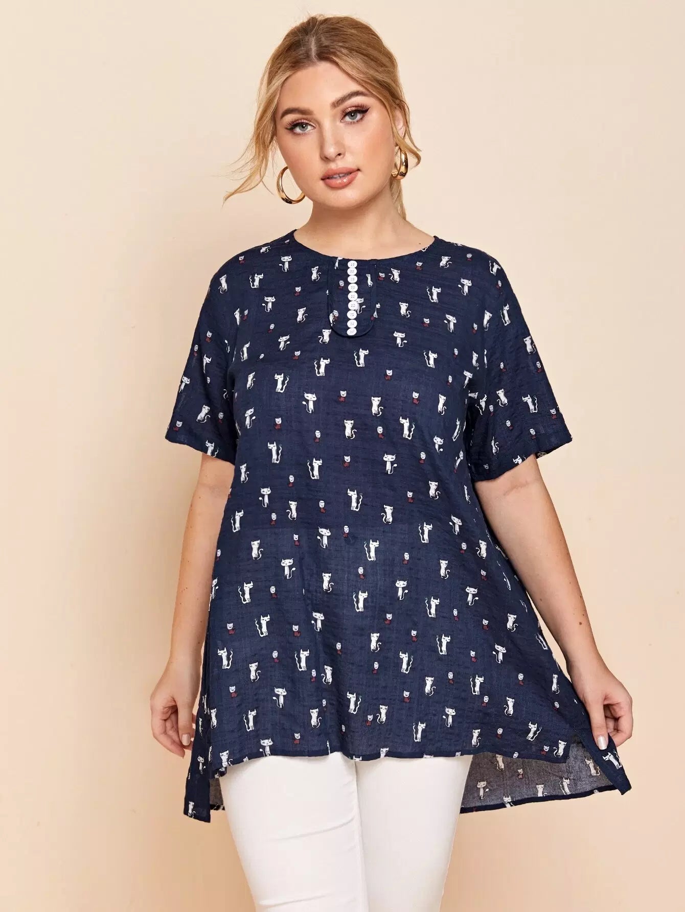 Plus Allover Cartoon Graphic Button Tunic Blouse