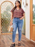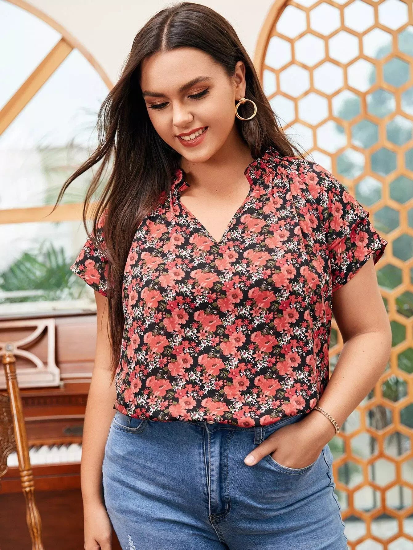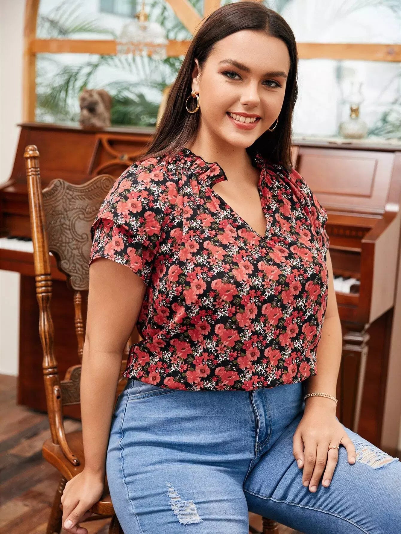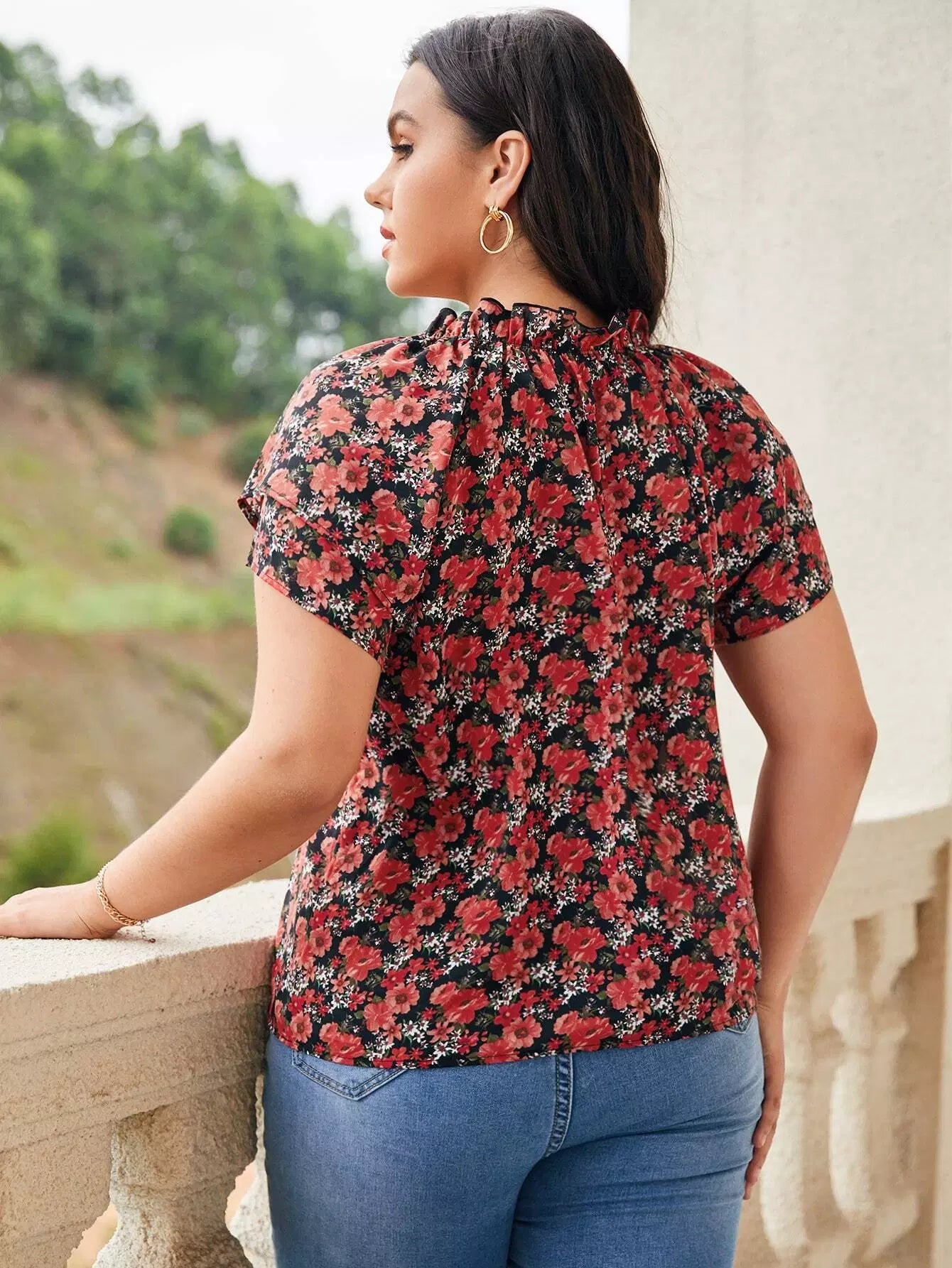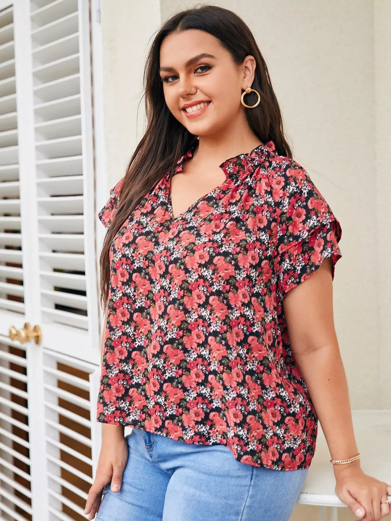 Plus Allover Floral Notch Neck Layered Sleeve Blouse
