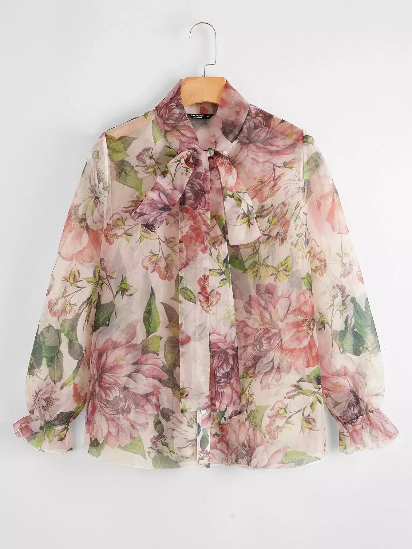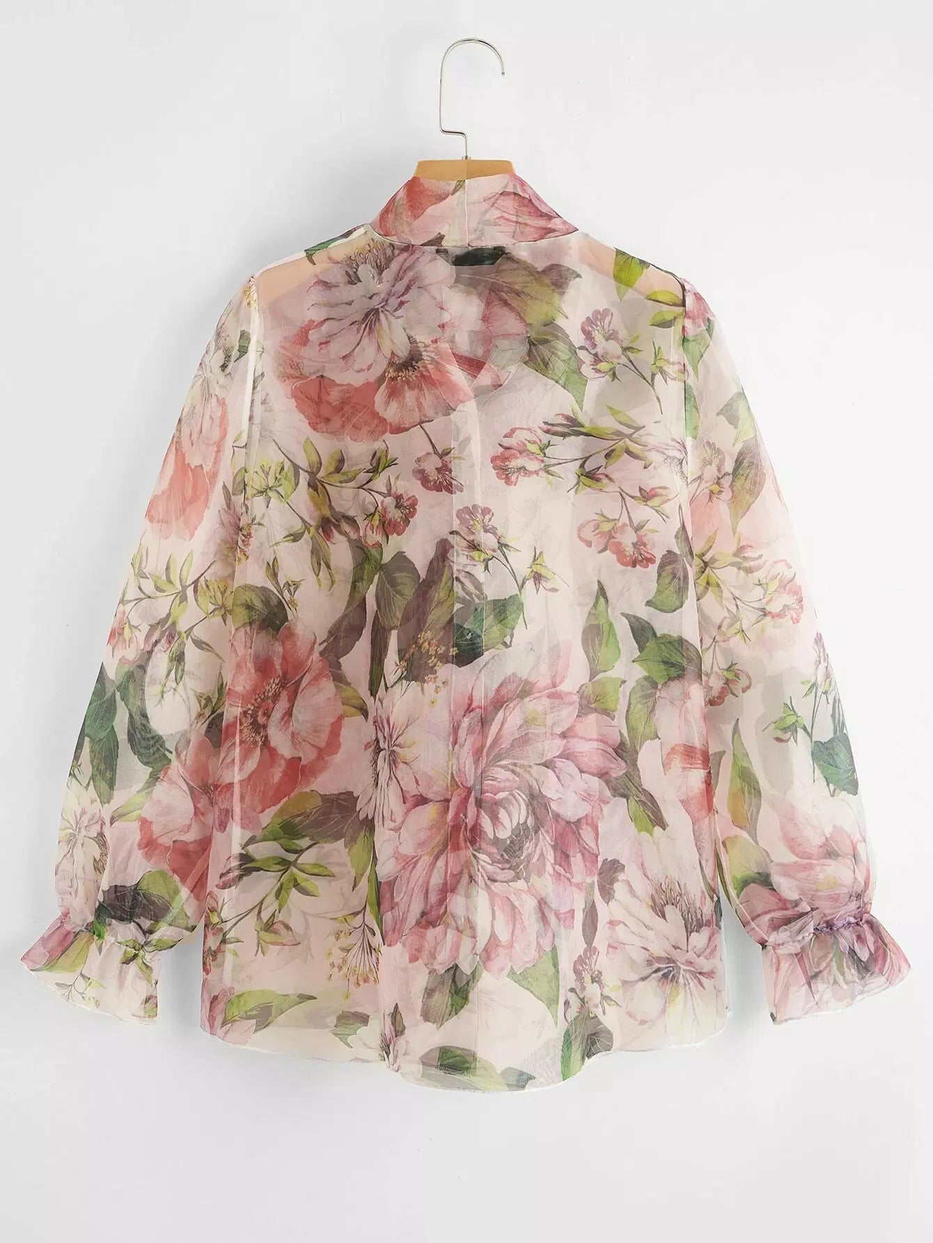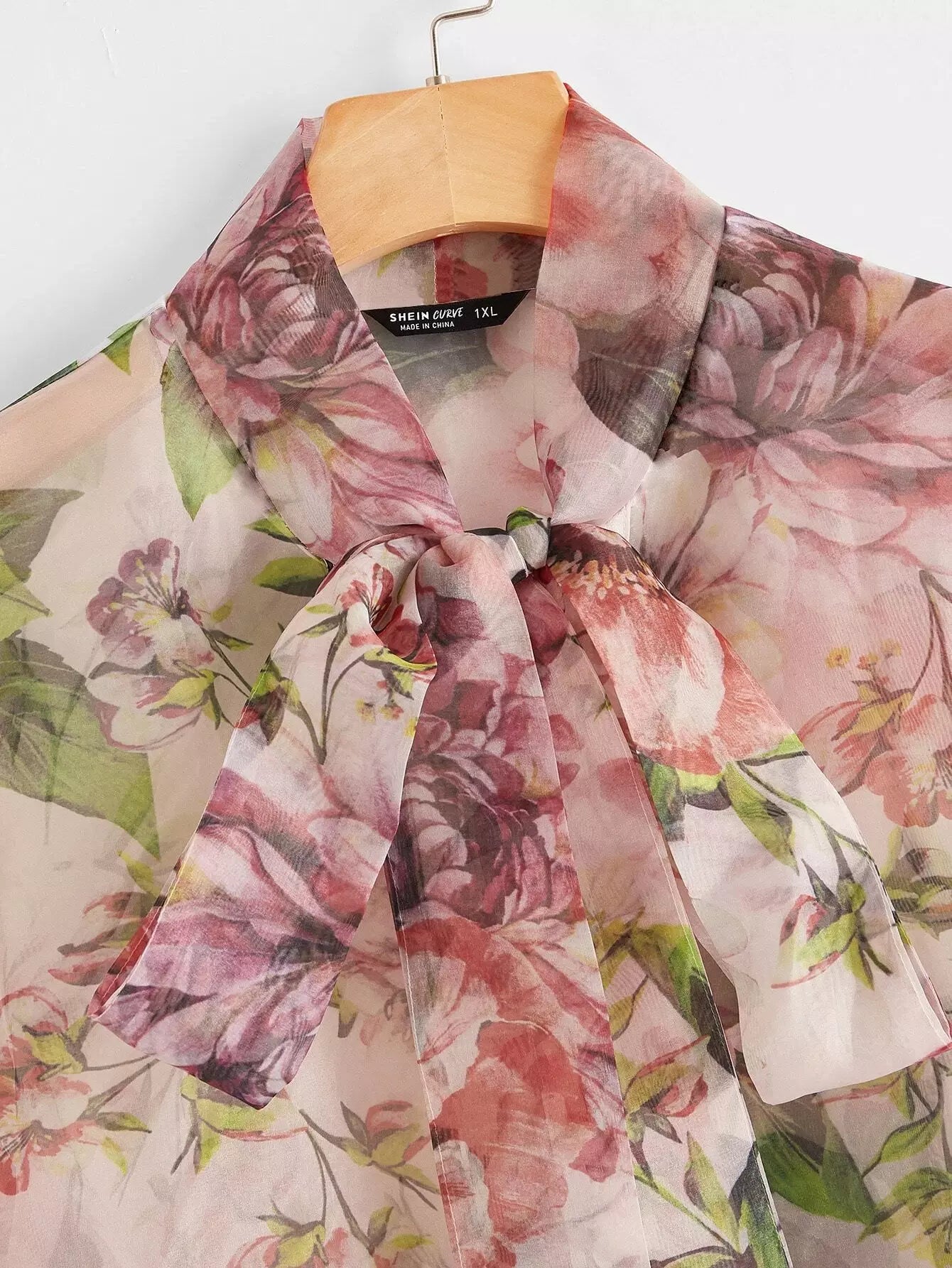 Plus Allover Floral Print Tie Neck Flounce Sleeve Sheer Blouse