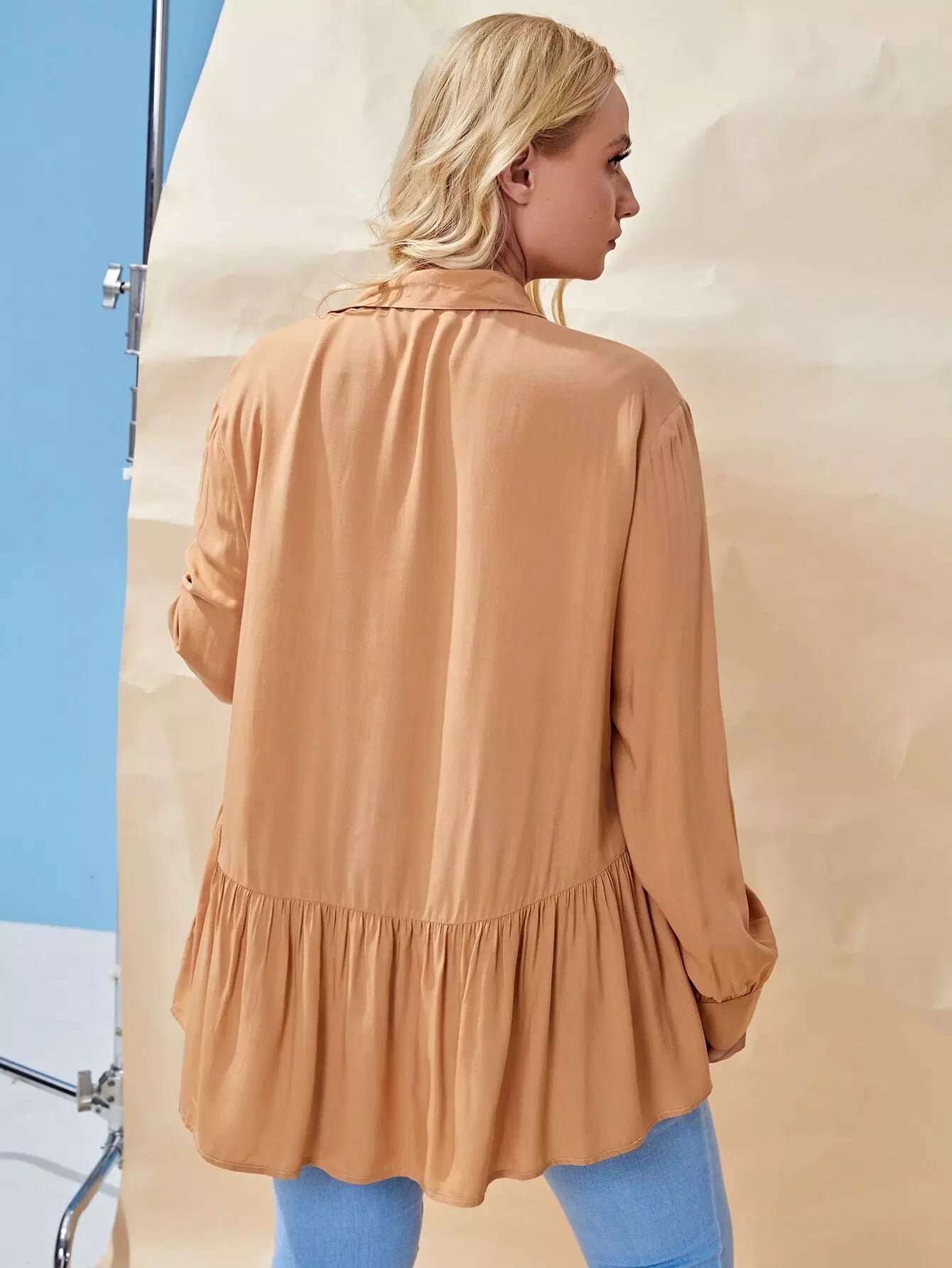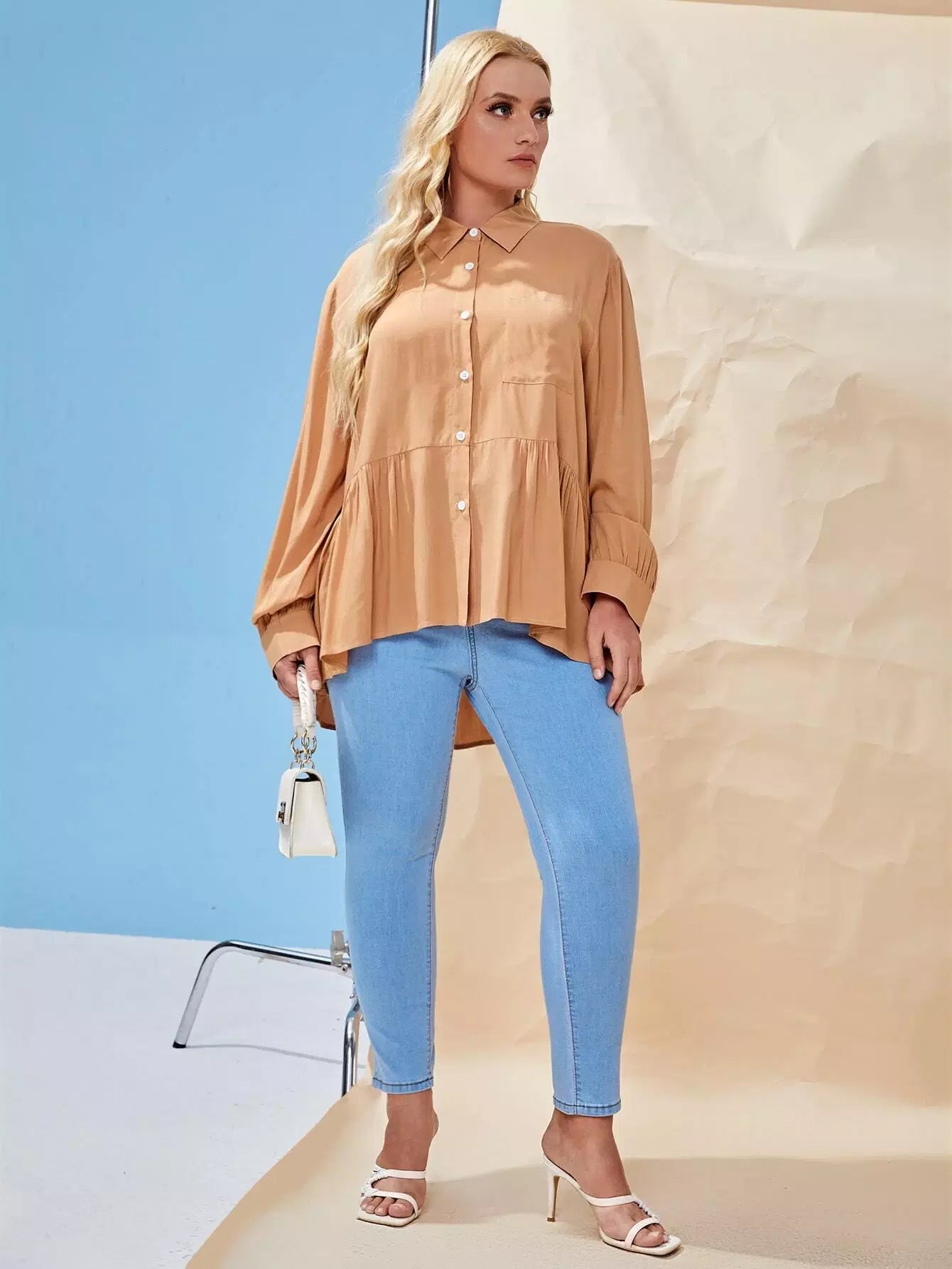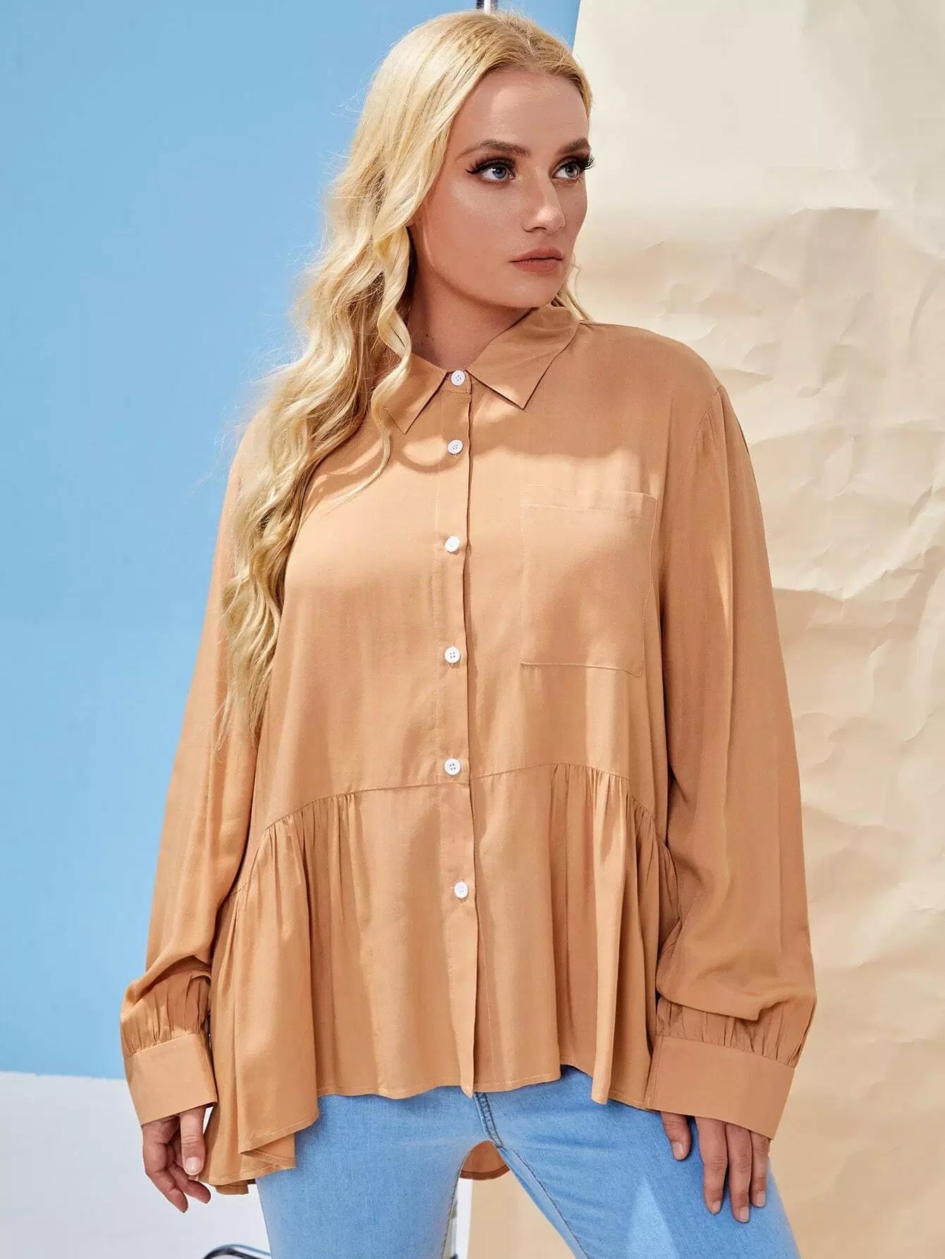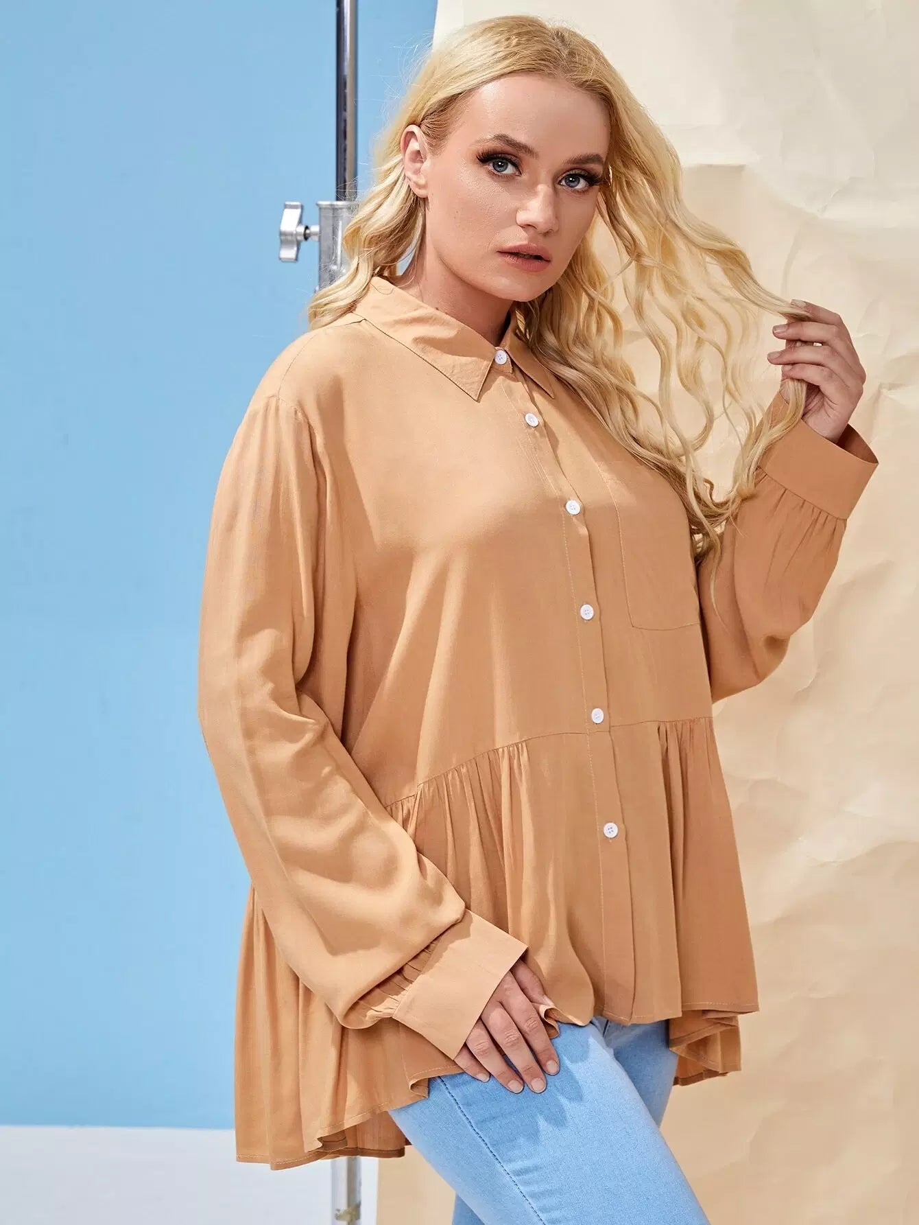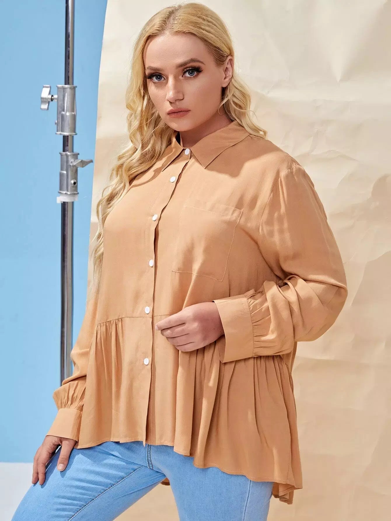 Women - Plus Button Up Ruffle Hem Smock Shirt