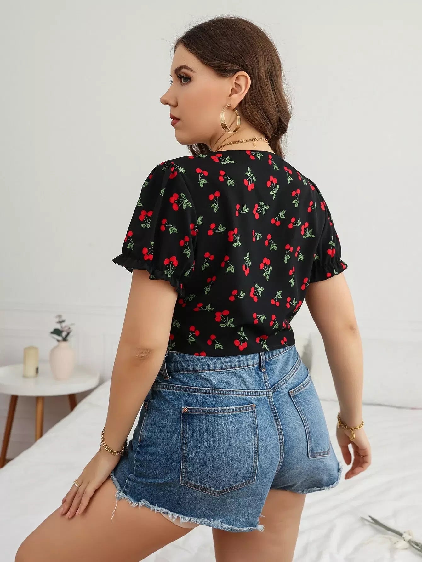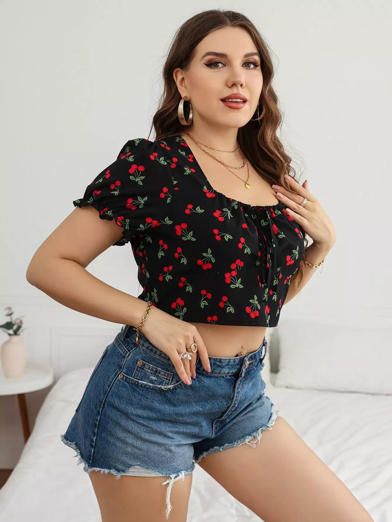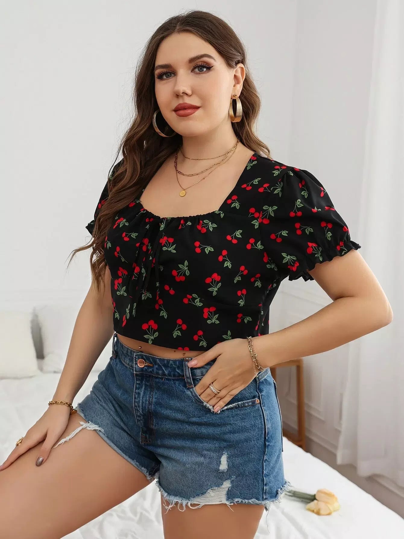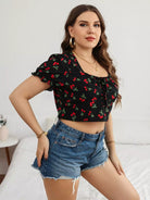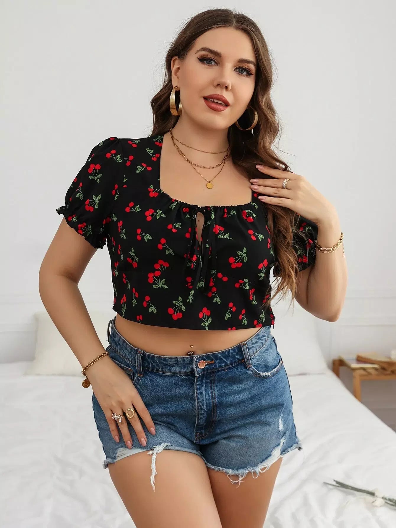 Plus Cherry Print Knot Front Puff Sleeve Crop Blouse