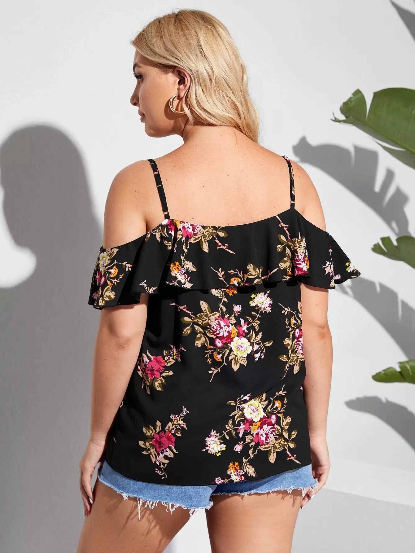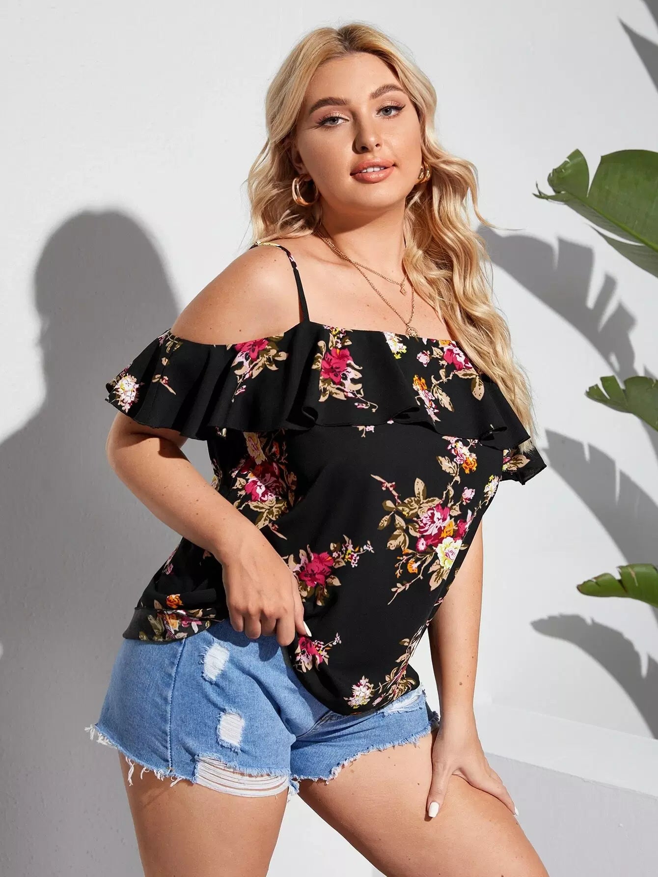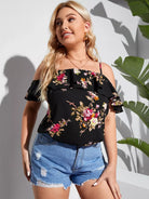 Plus Cold Shoulder Floral Print Ruffle Trim Blouse