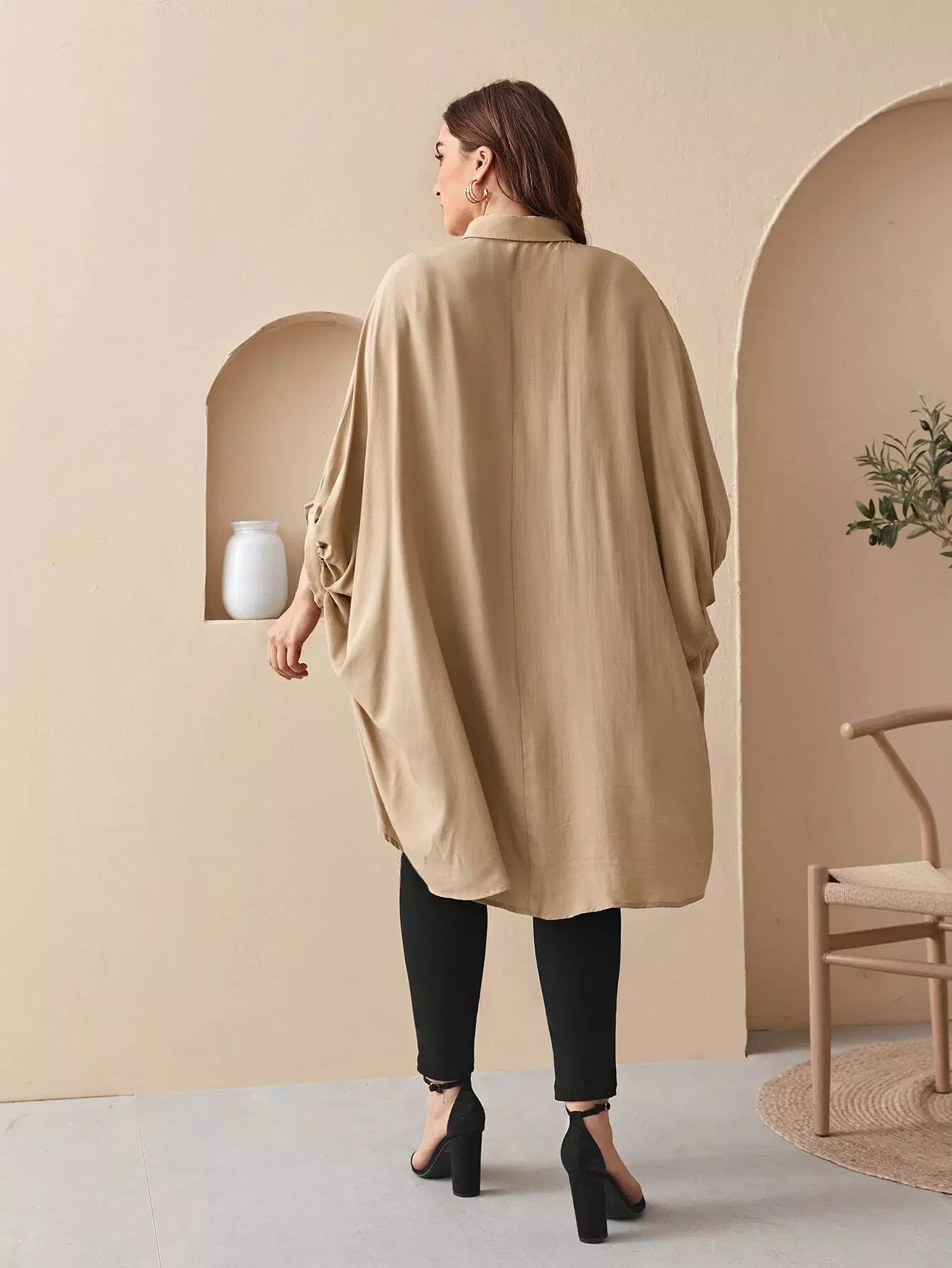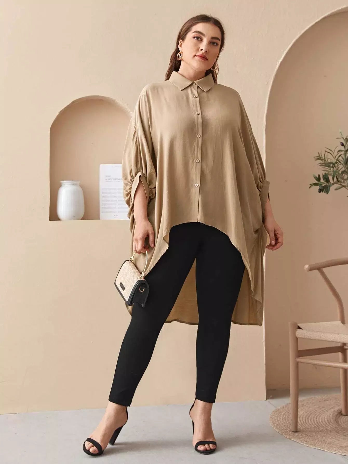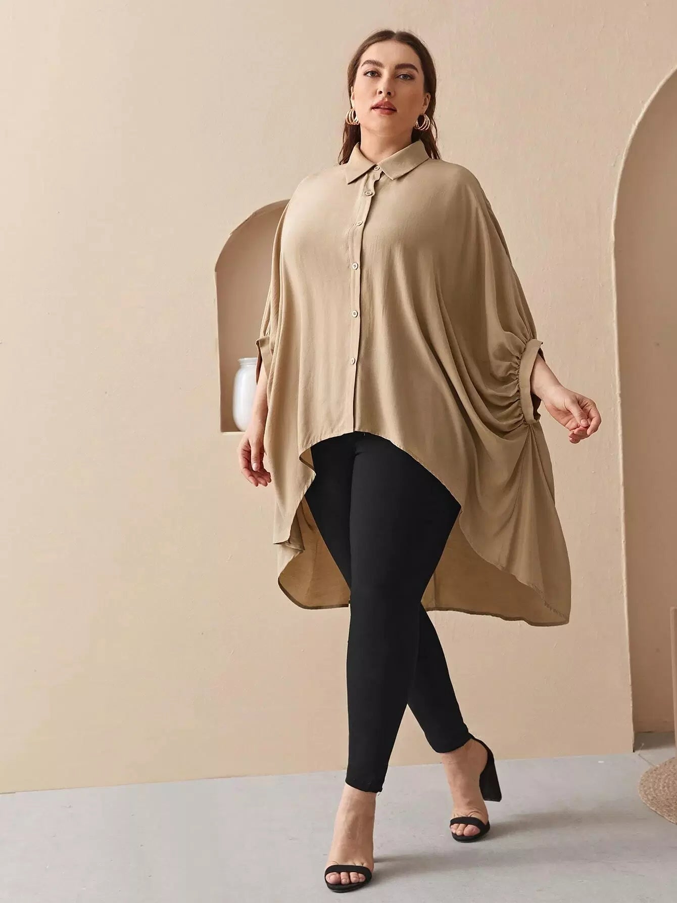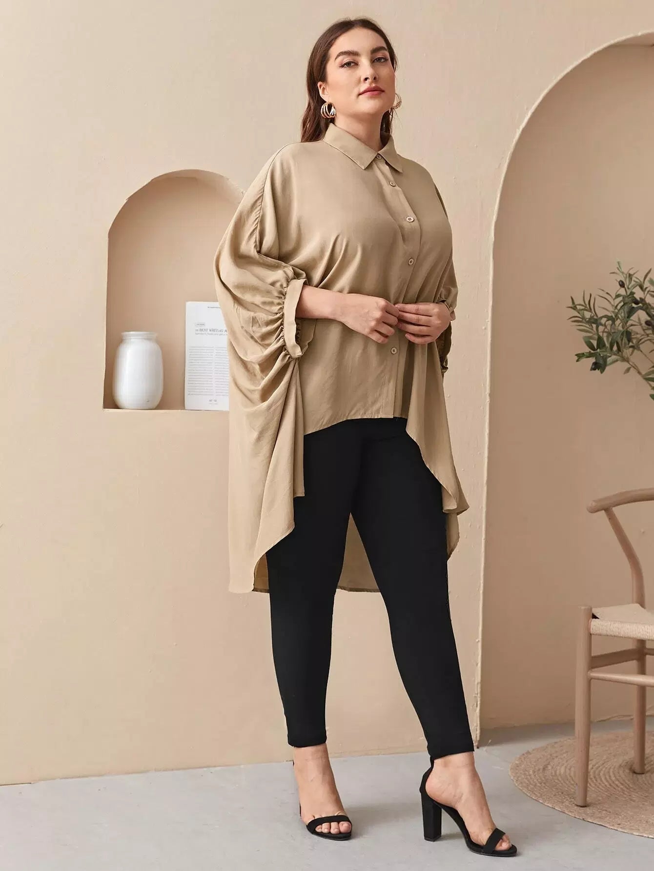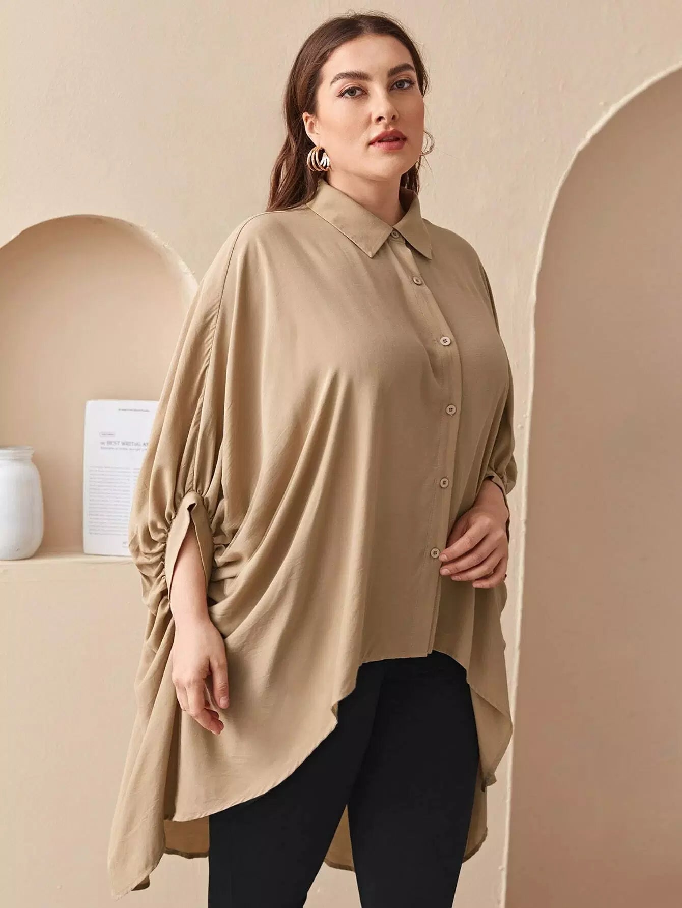 Plus Collared Batwing Sleeve Dip Hem Blouse