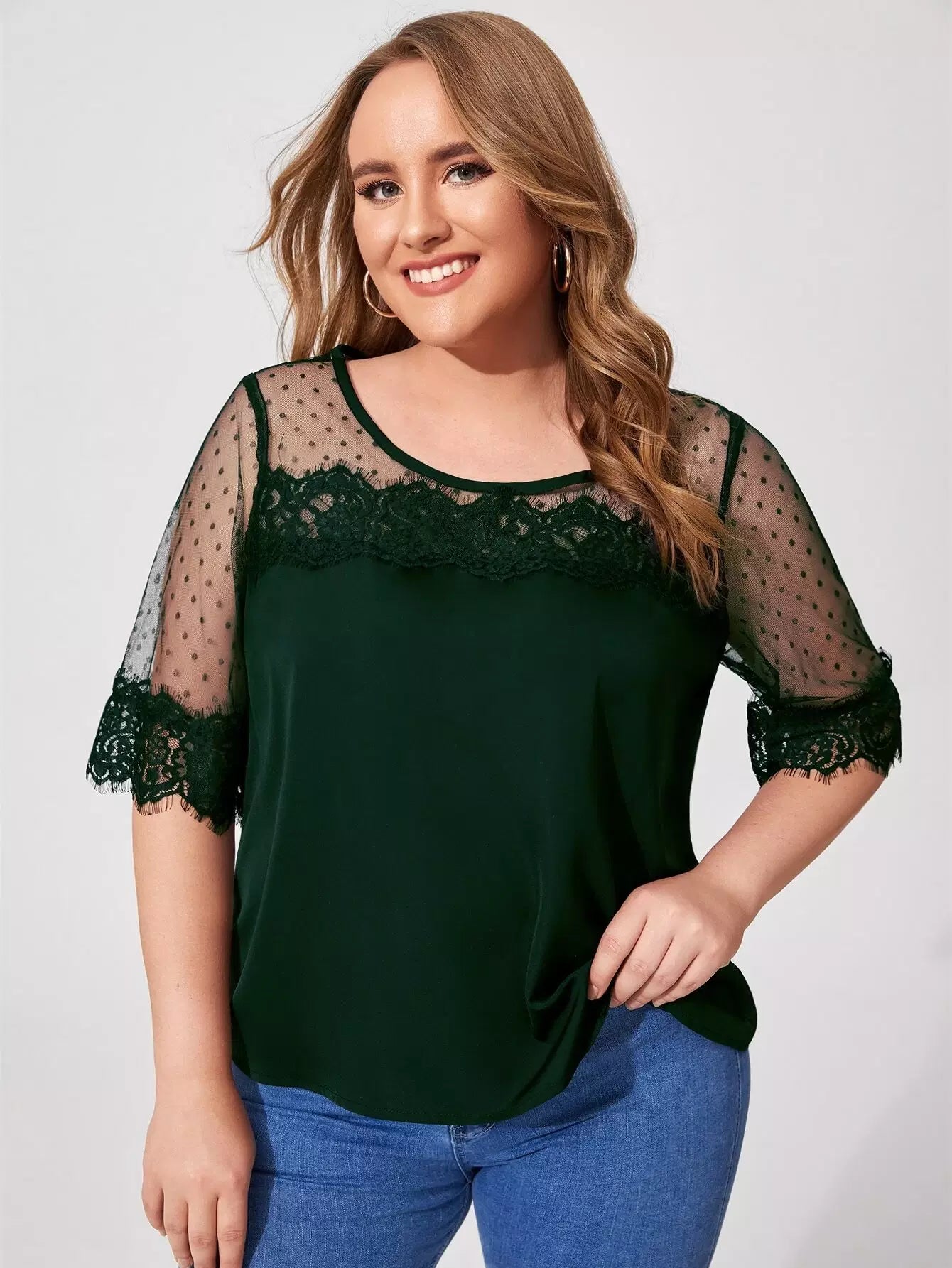 Plus Contrast Lace Dobby Mesh Yoke Blouse