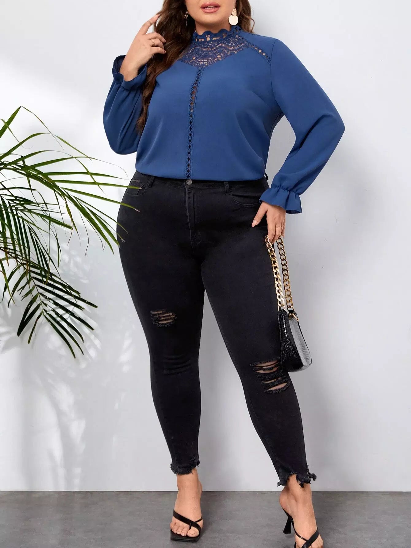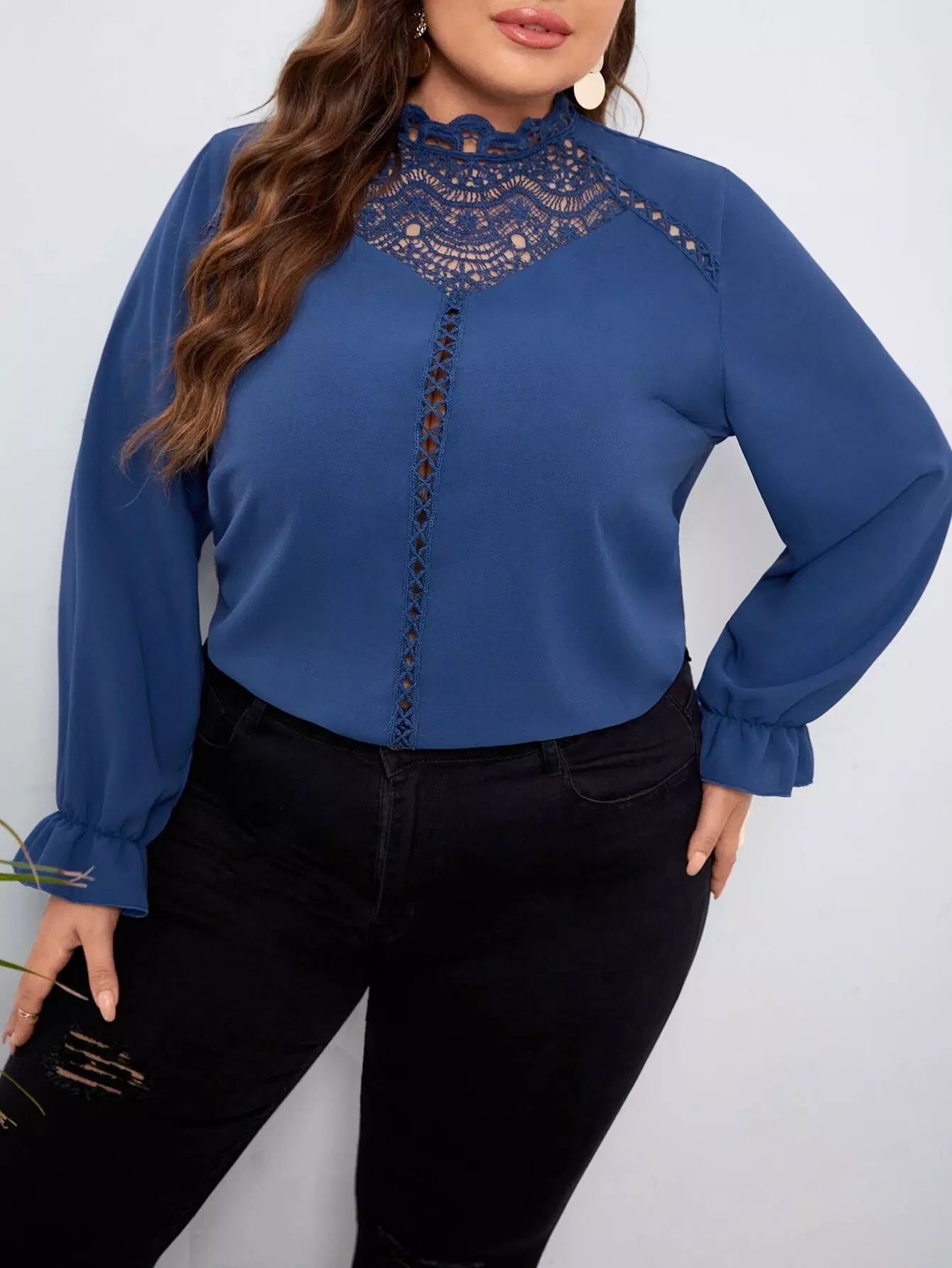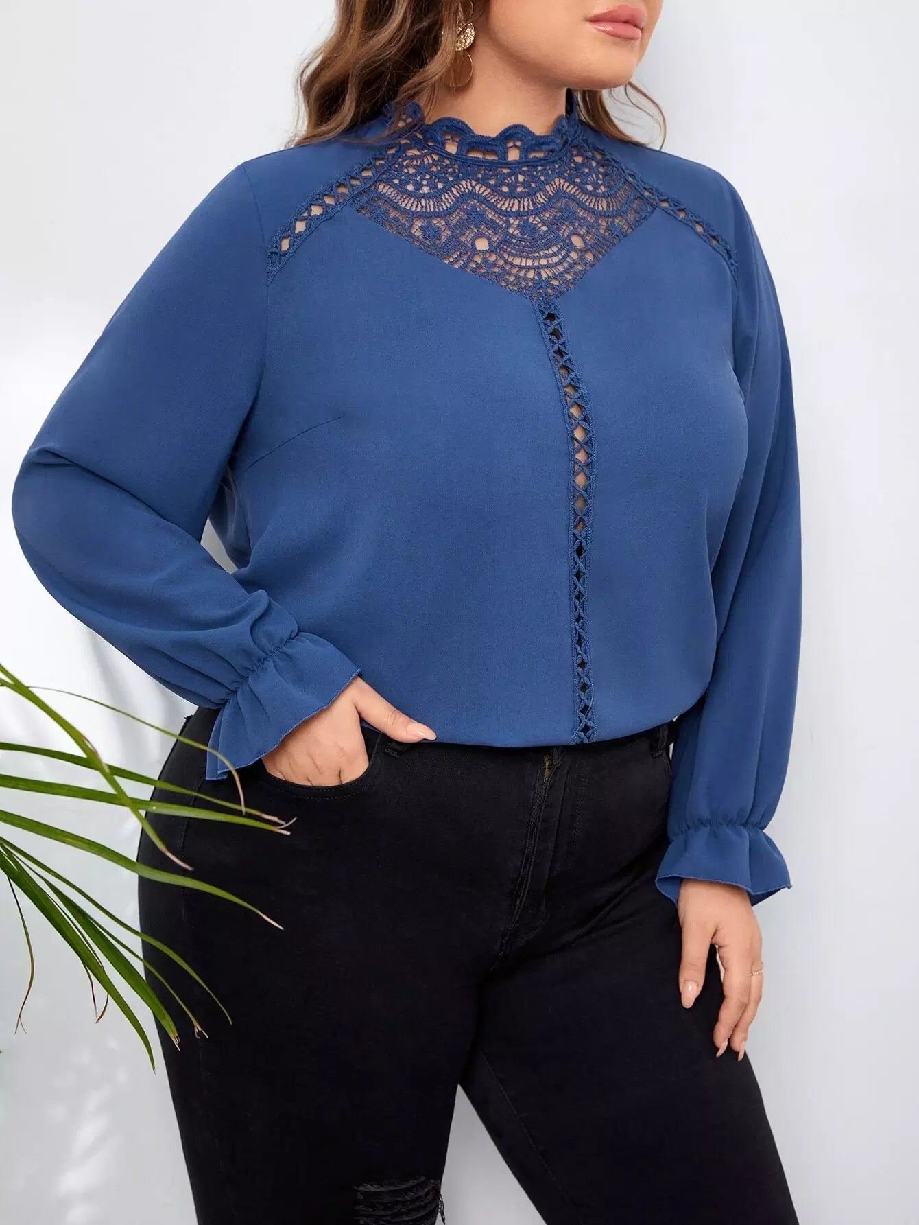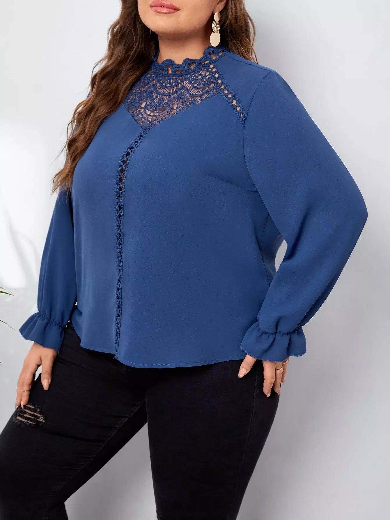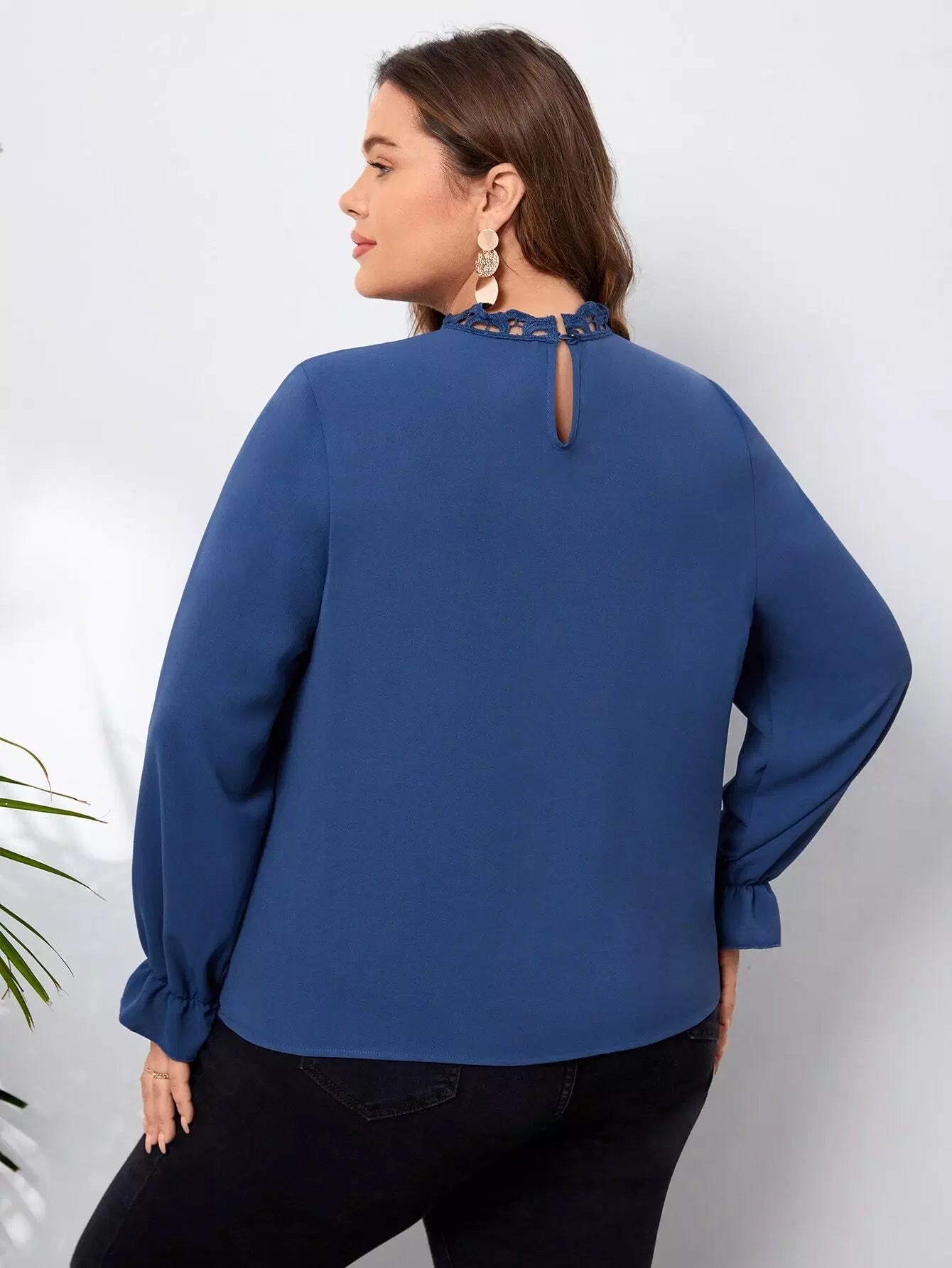 Plus Contrast Lace Keyhole Back Flounce Sleeve Blouse