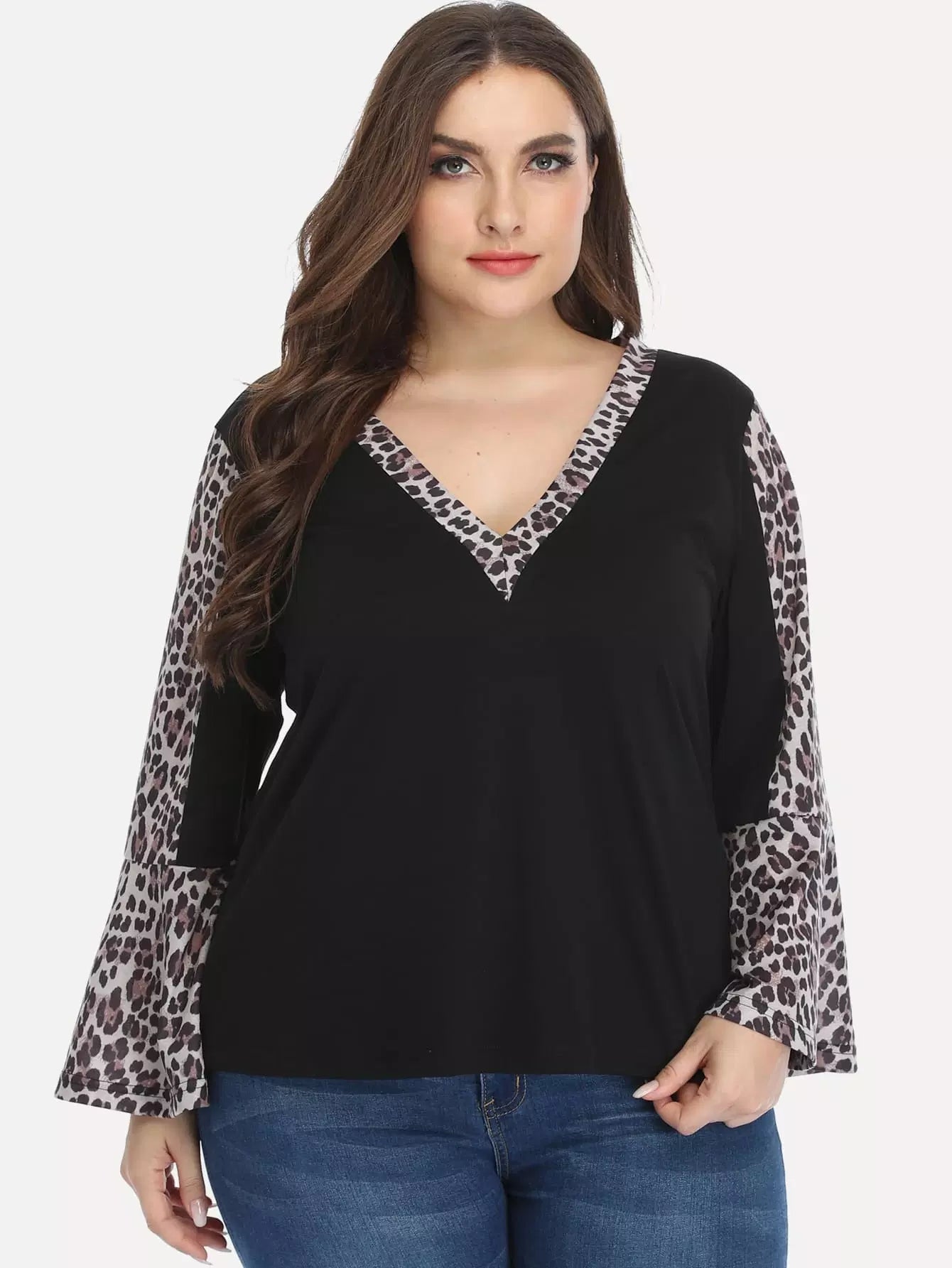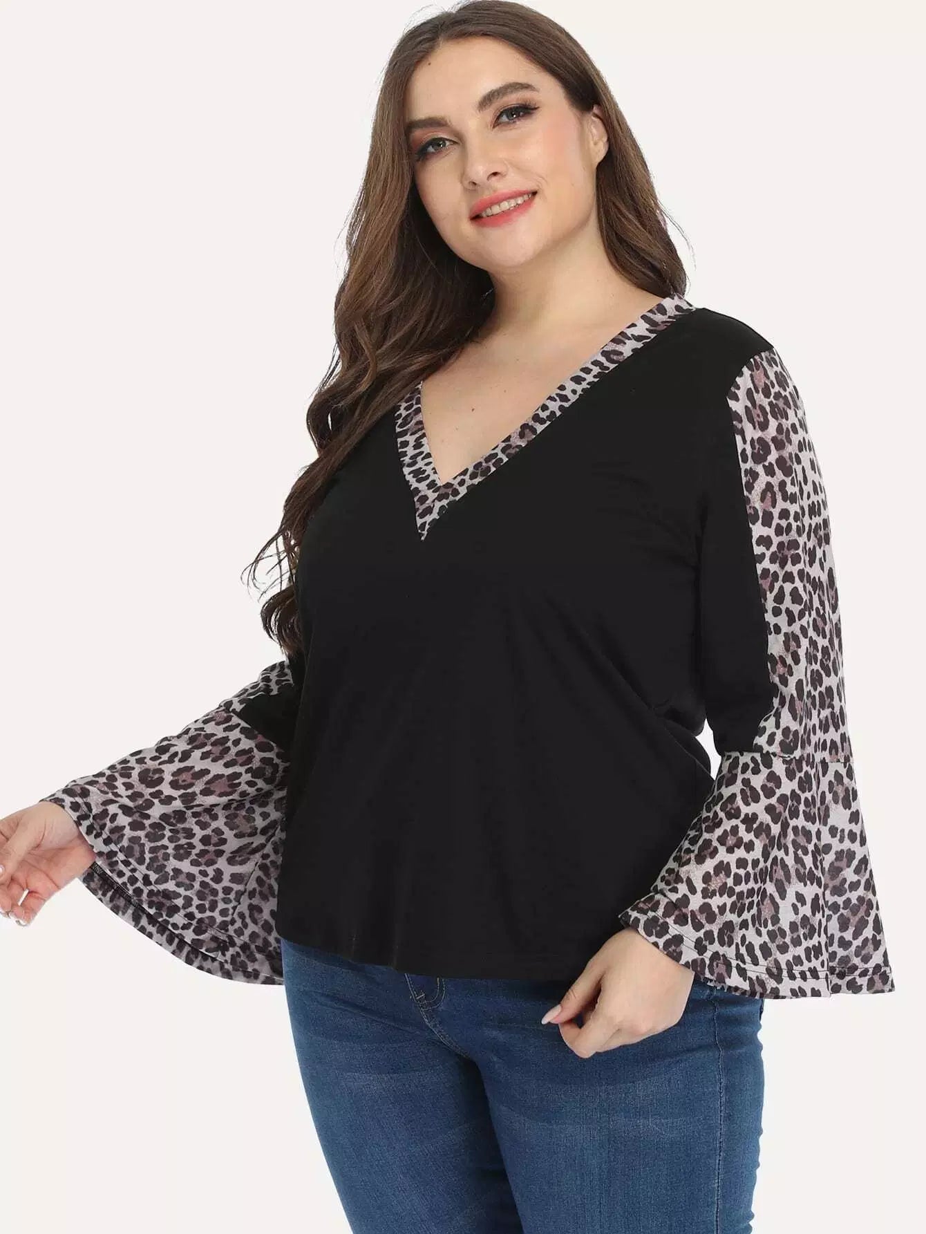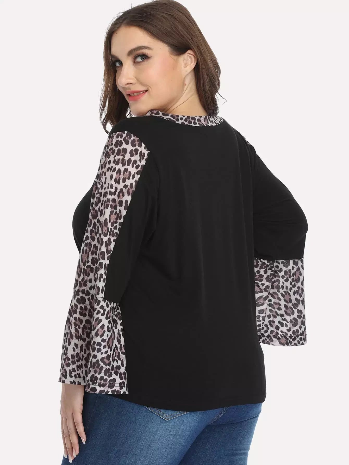 Plus Contrast Leopard Print Flounce Sleeve Blouse