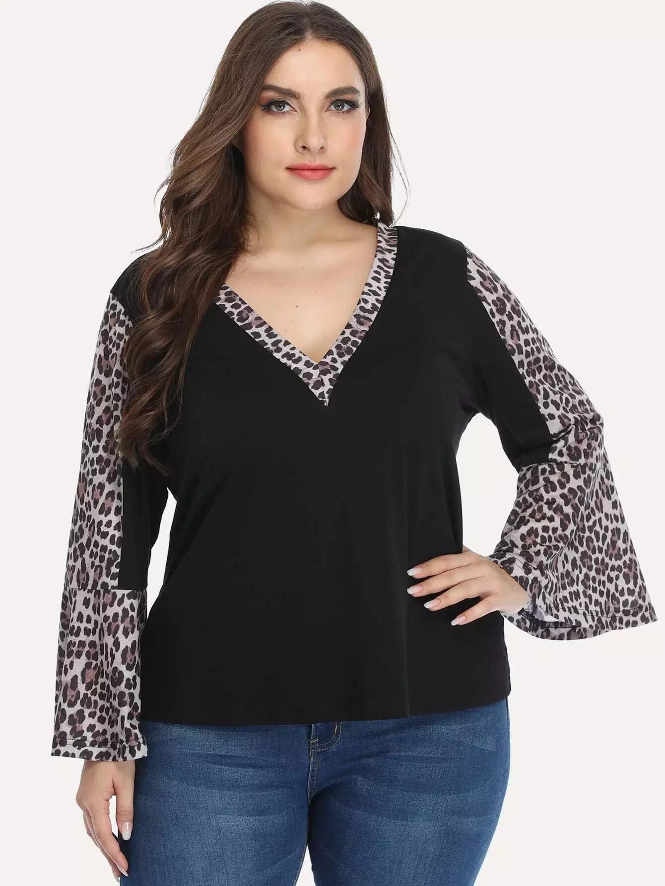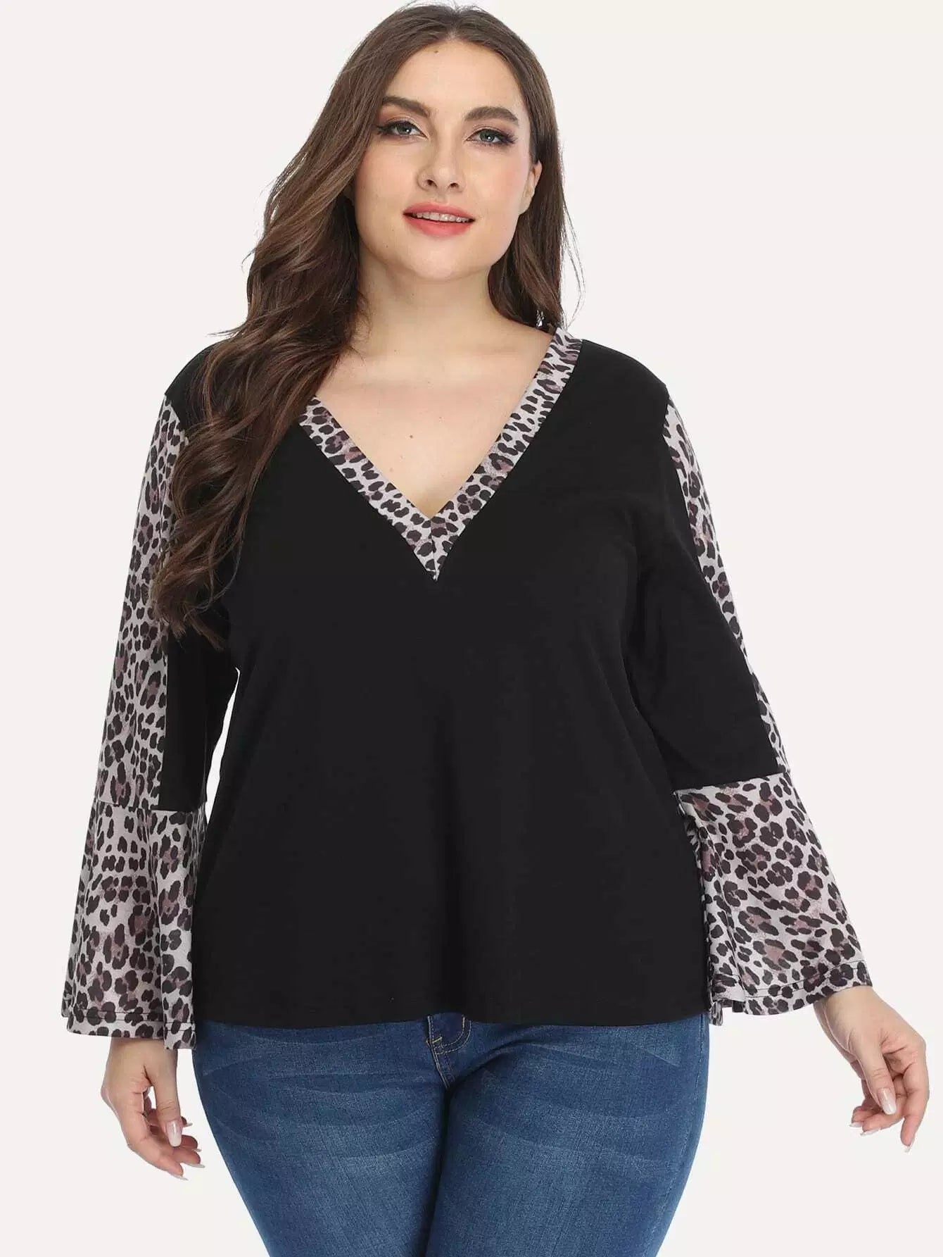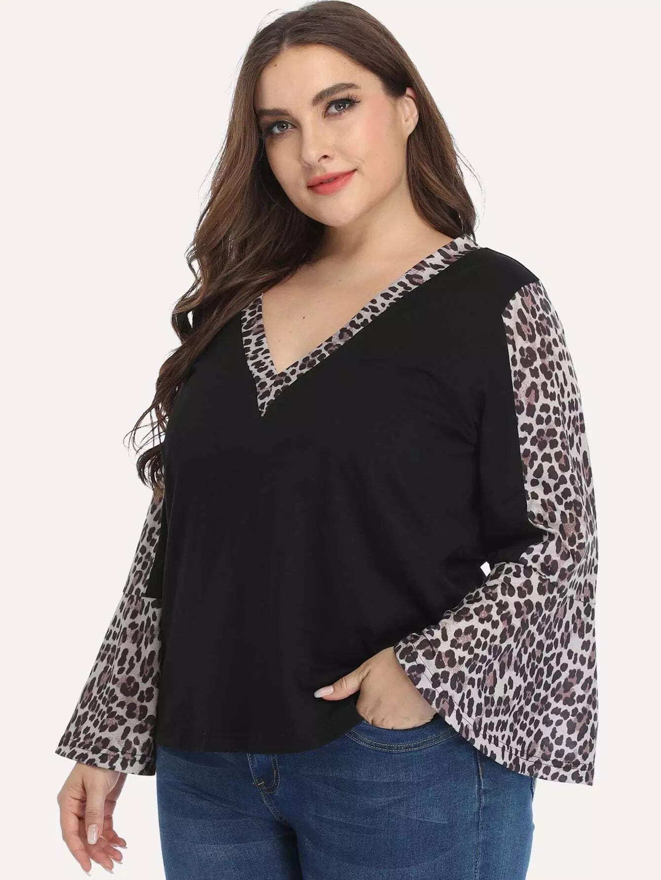 Plus Contrast Leopard Print Flounce Sleeve Blouse
