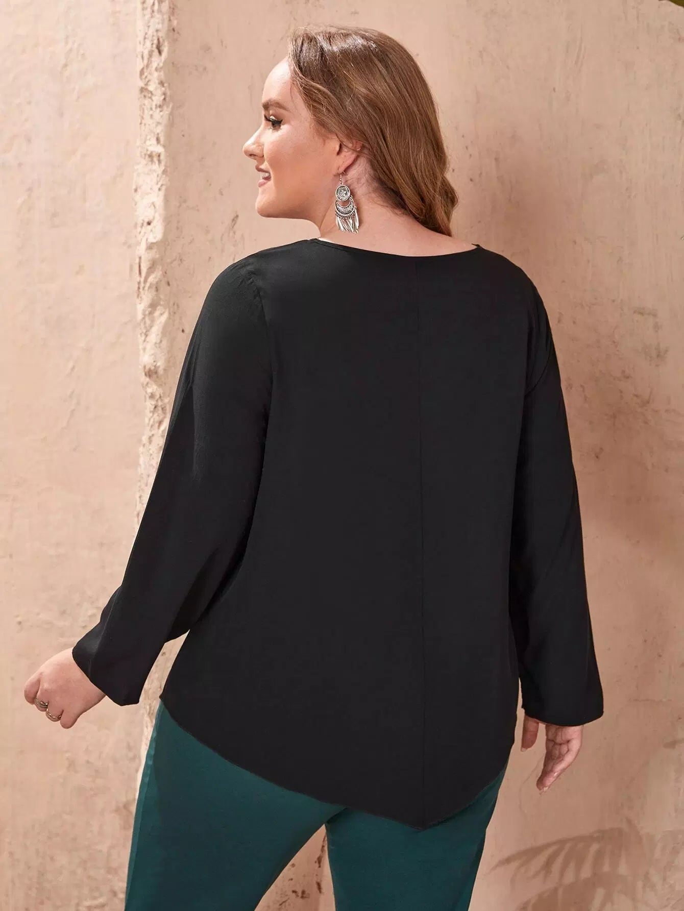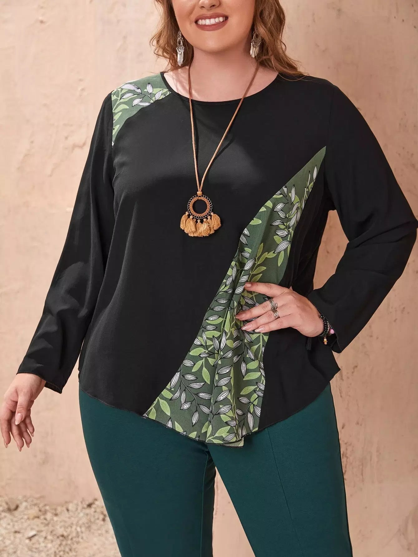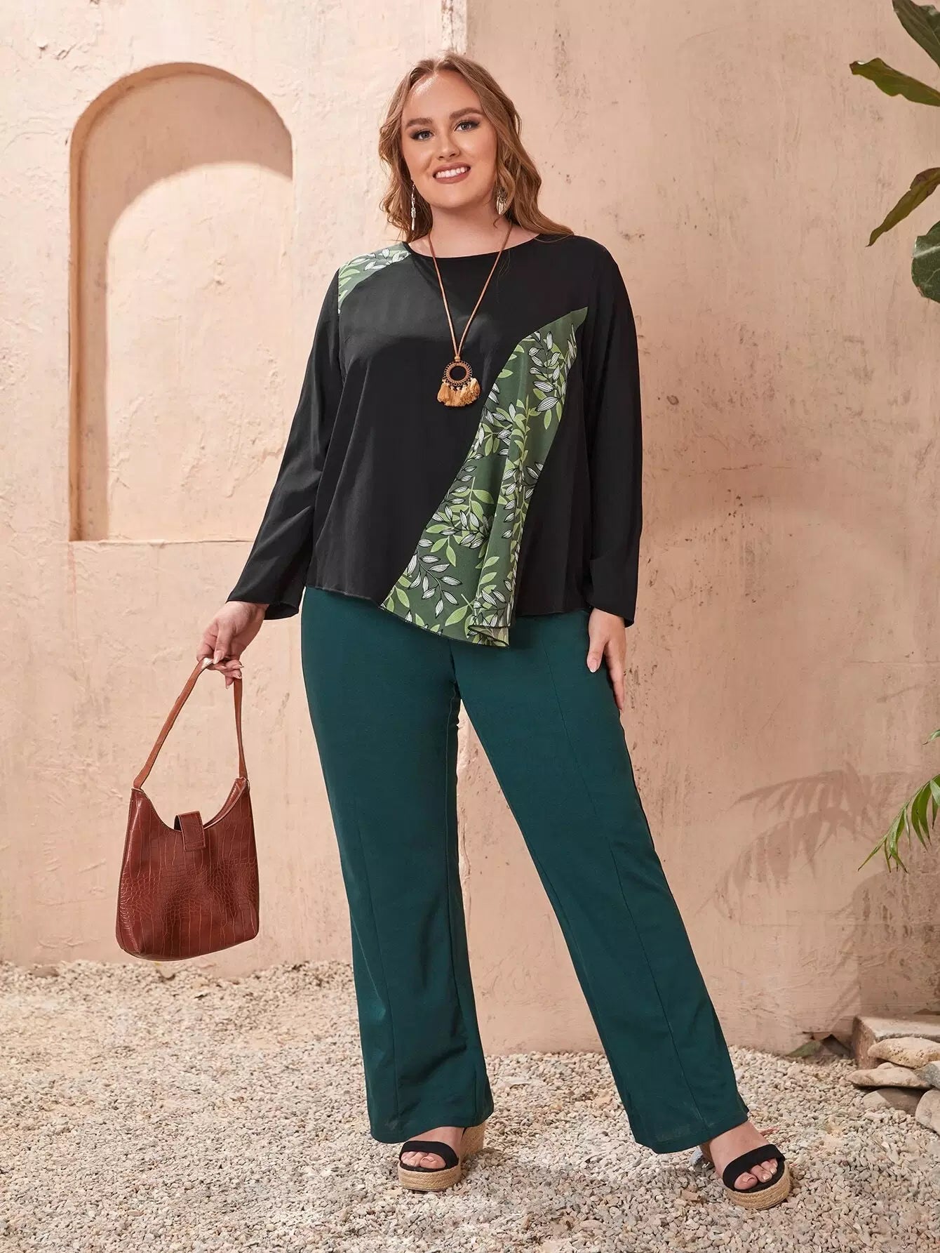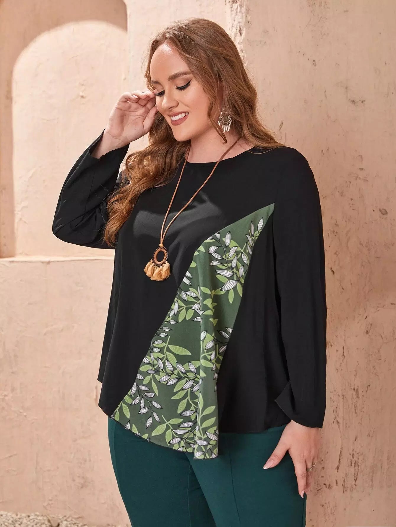 Plus Contrast Plant Print Asymmetric Hem Blouse