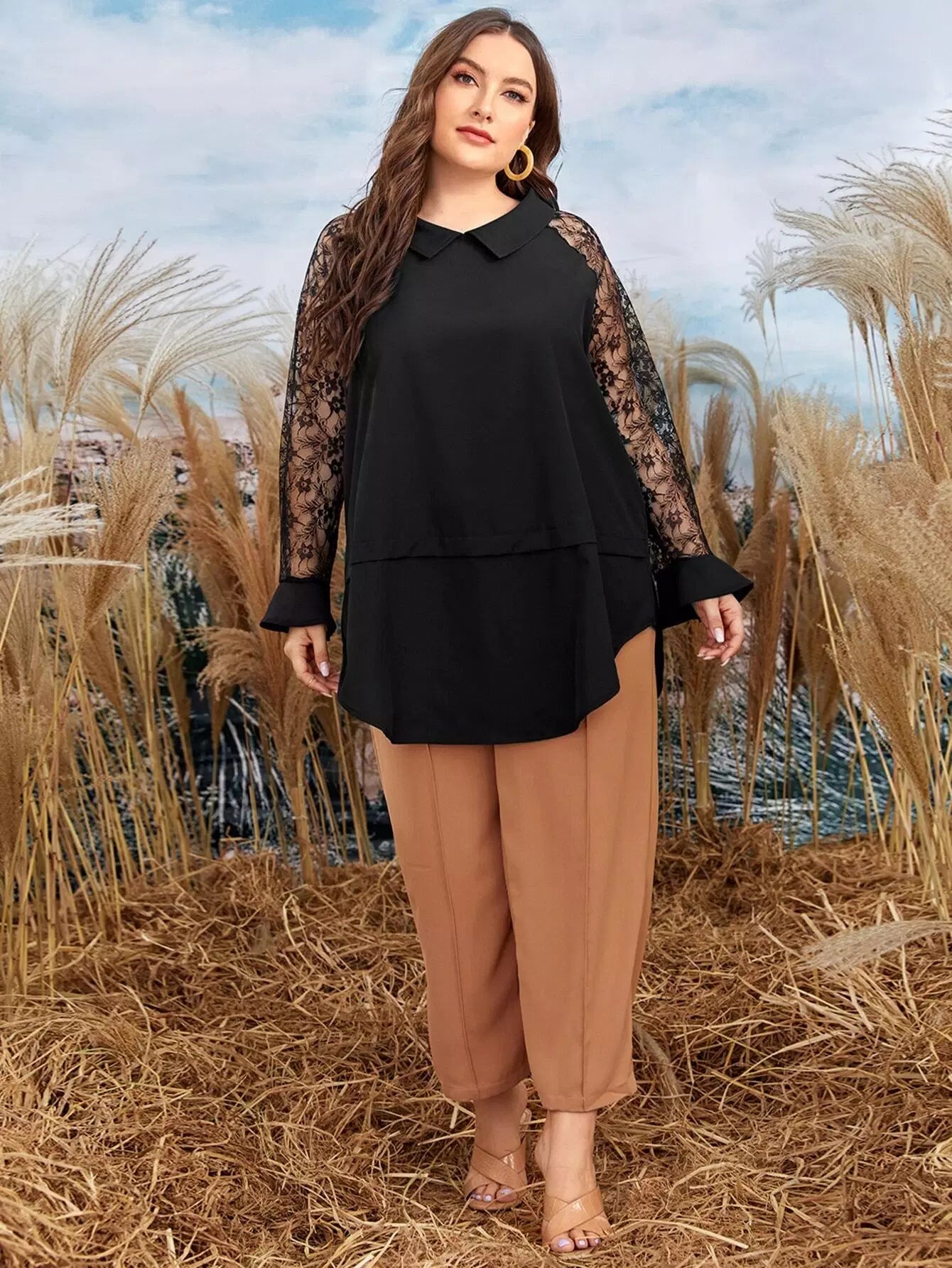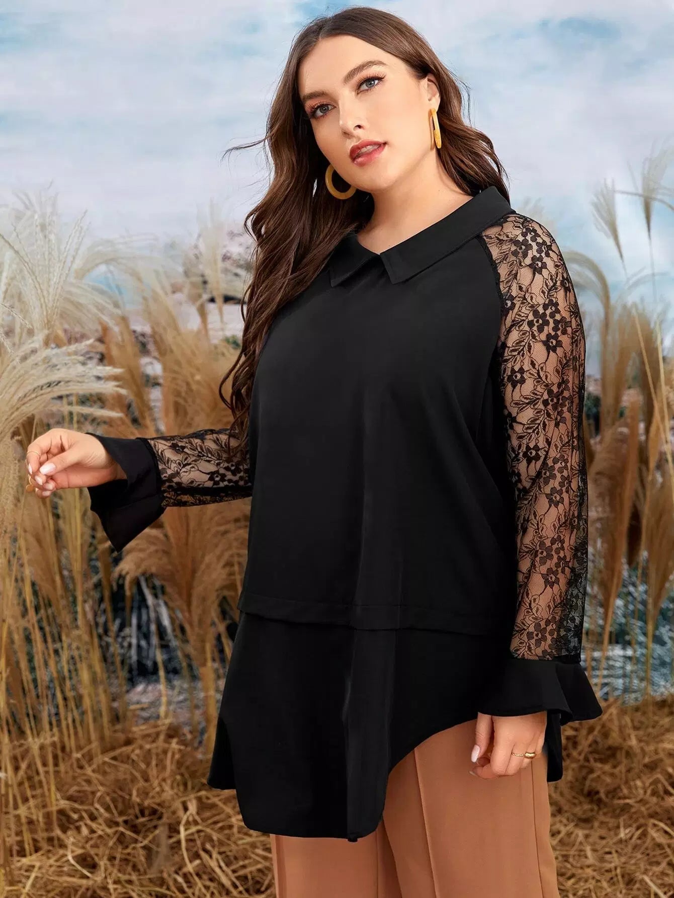 Plus Curved Hem Contrast Lace Raglan Sleeve Blouse