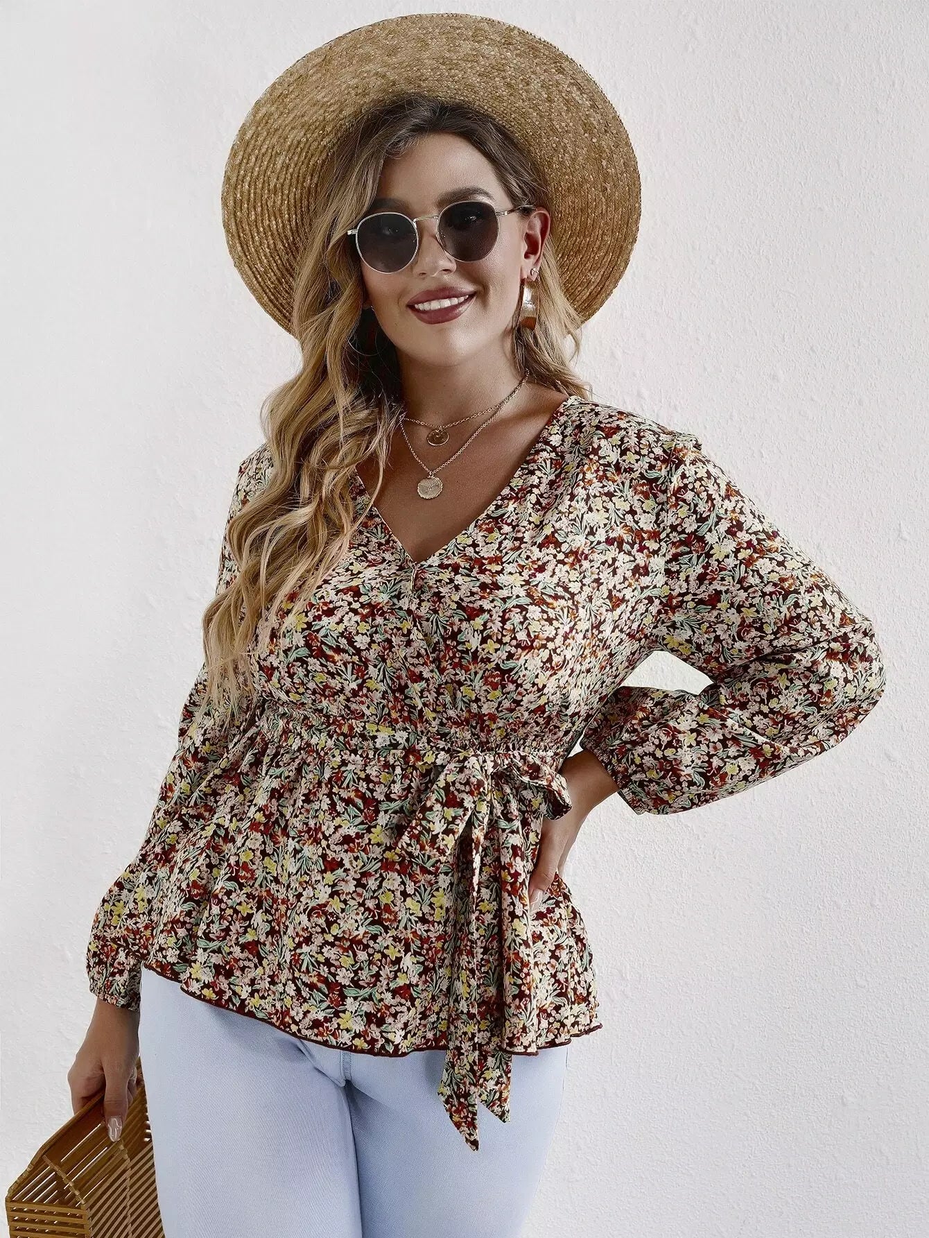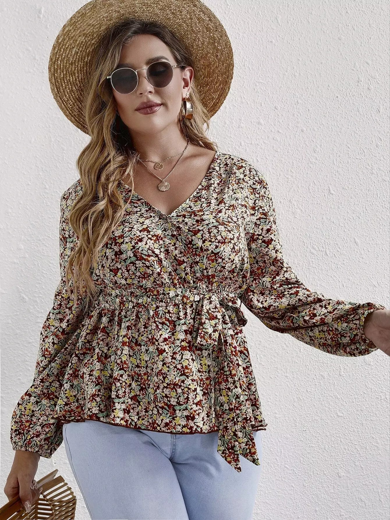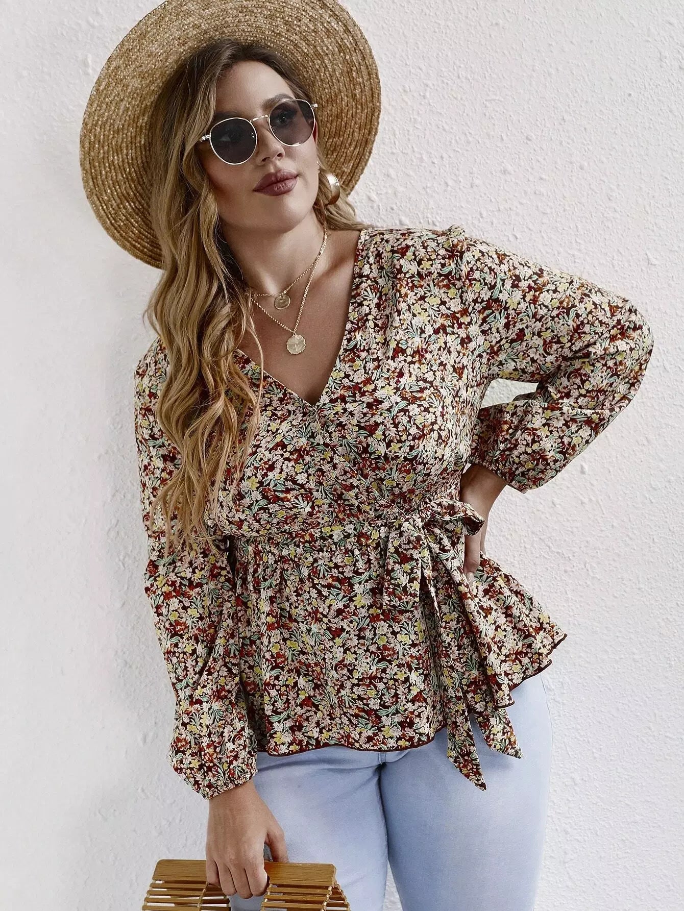 Women - Plus Ditsy Floral Belted Peplum Blouse
