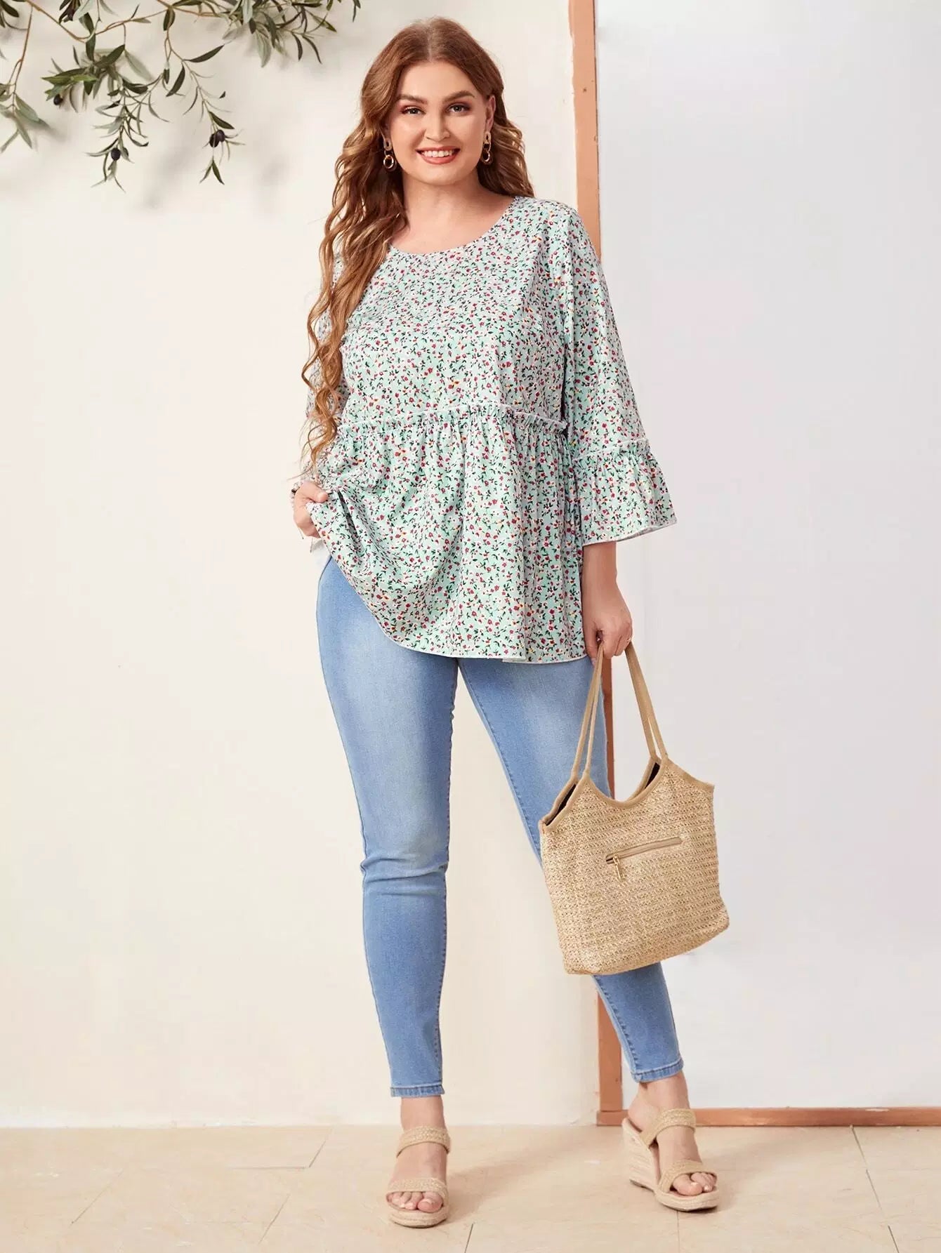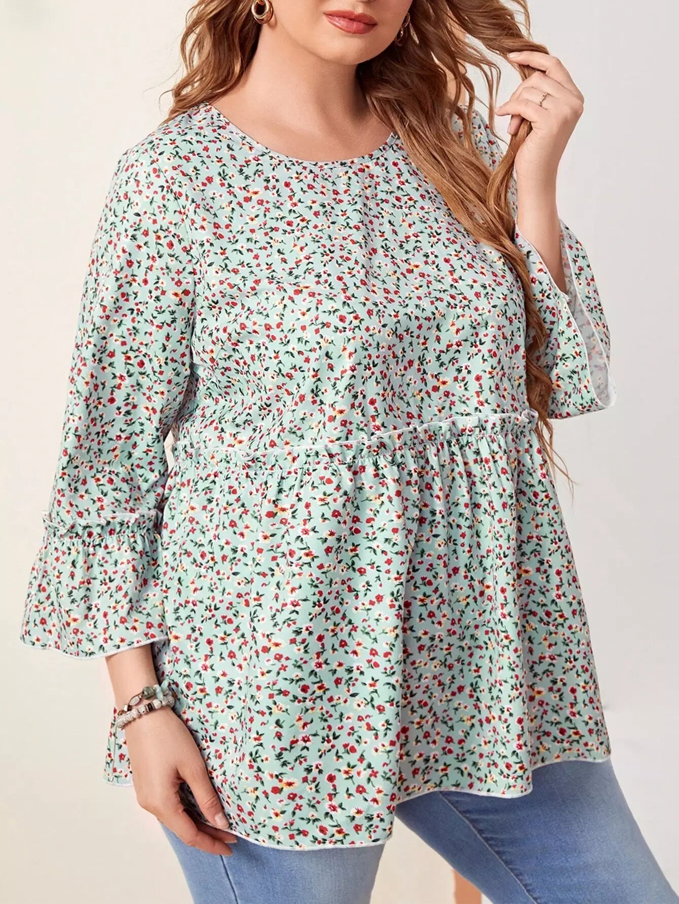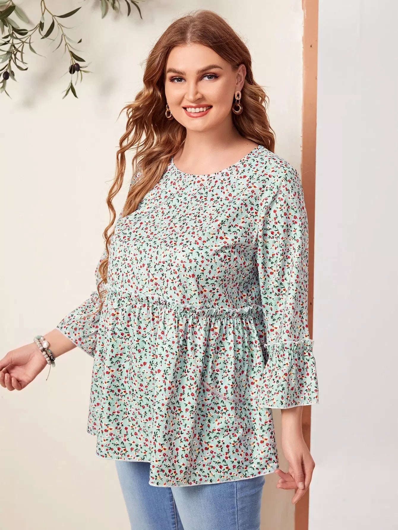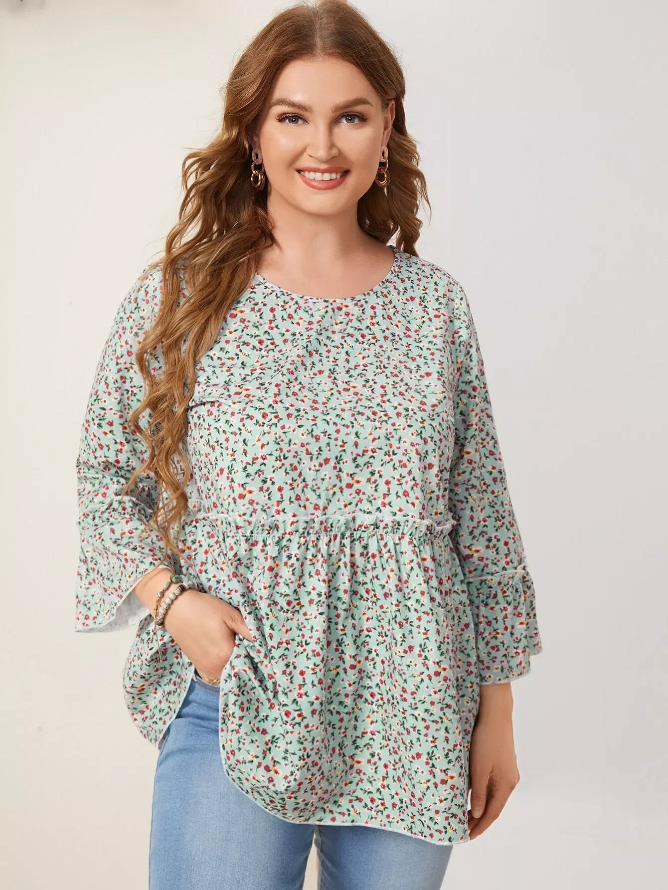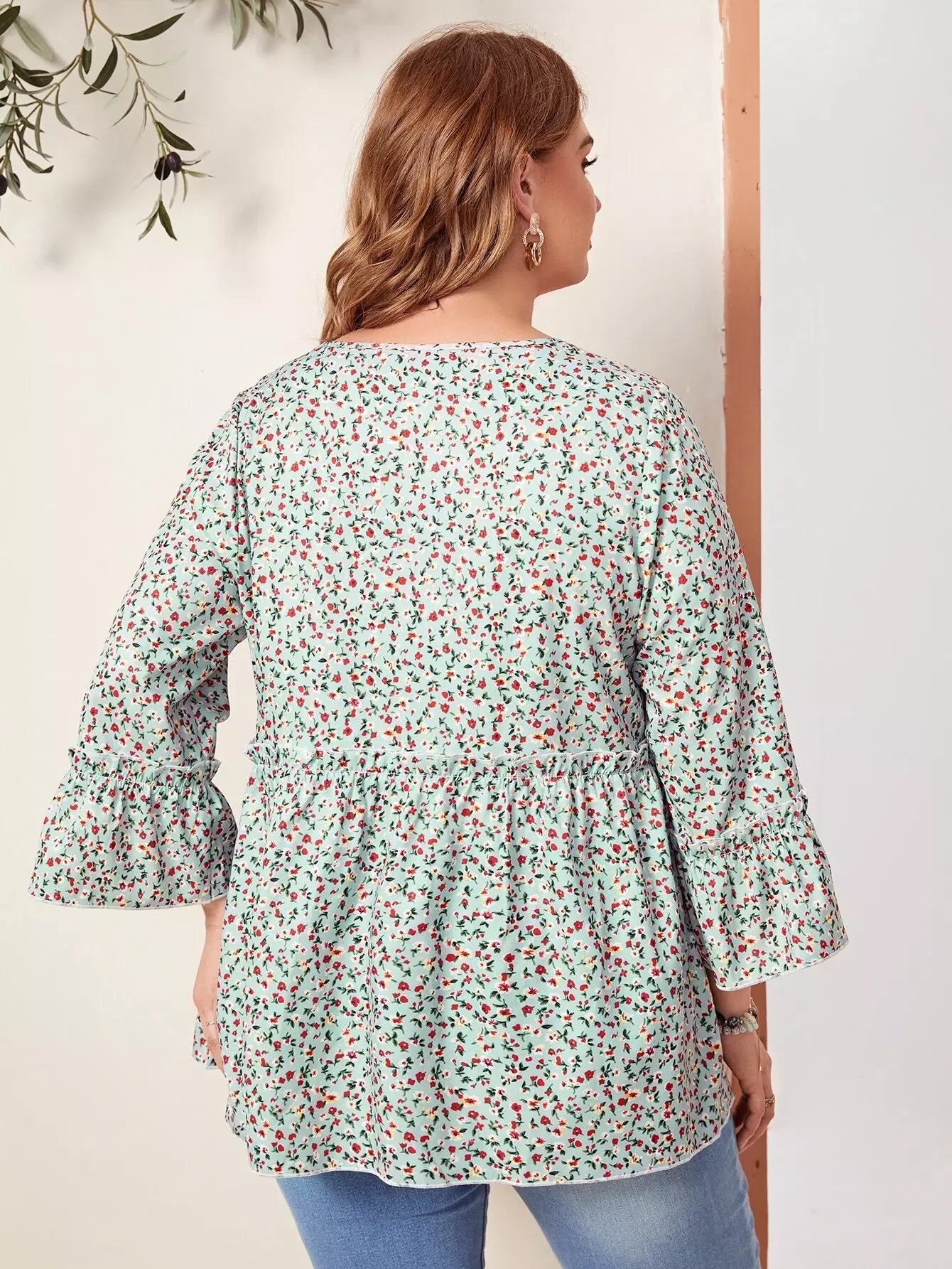 Plus Ditsy Floral Flounce Sleeve Blouse