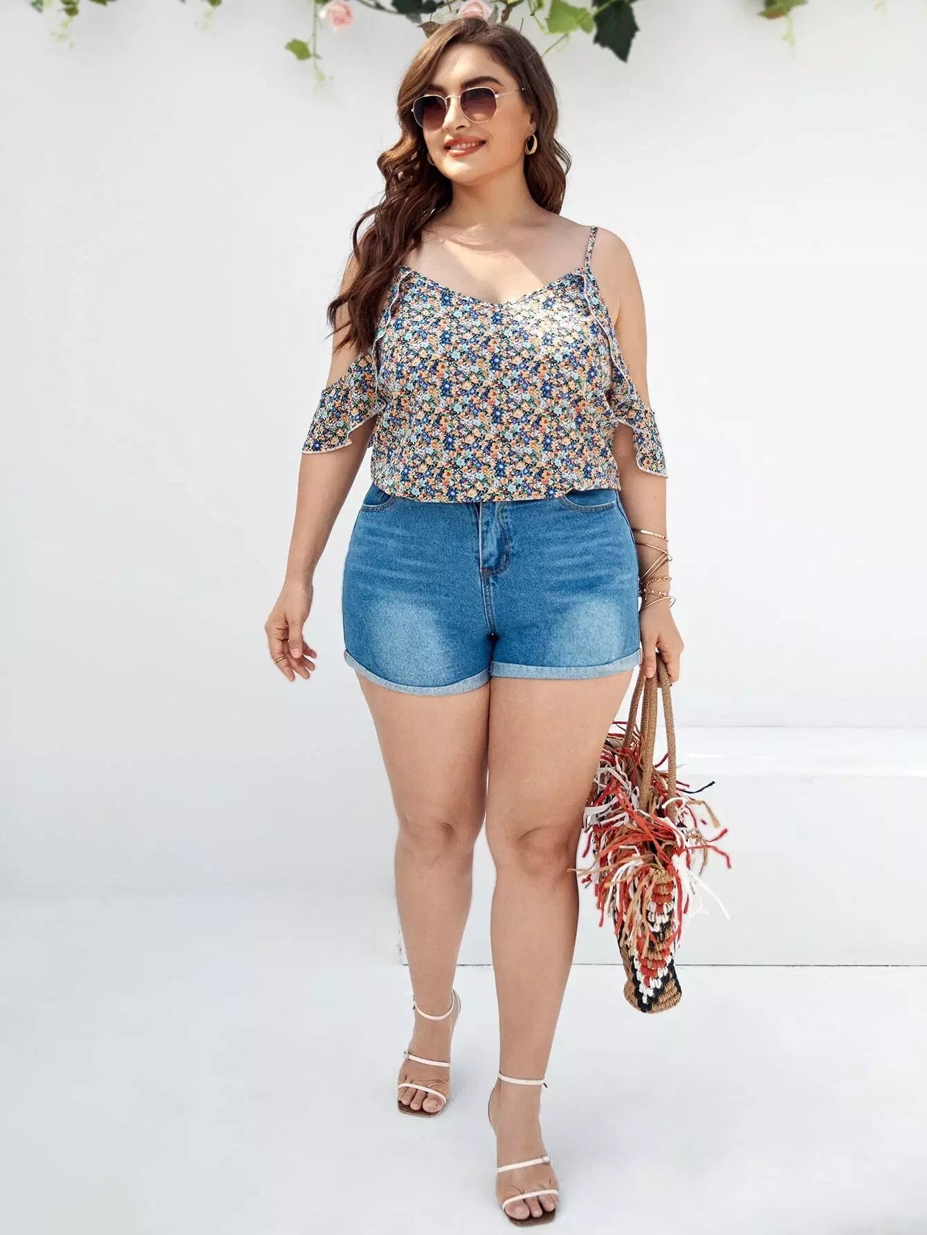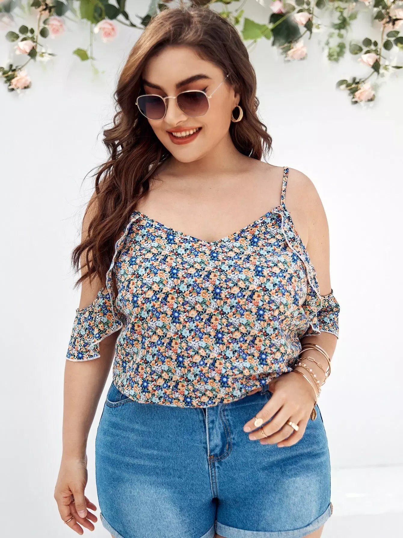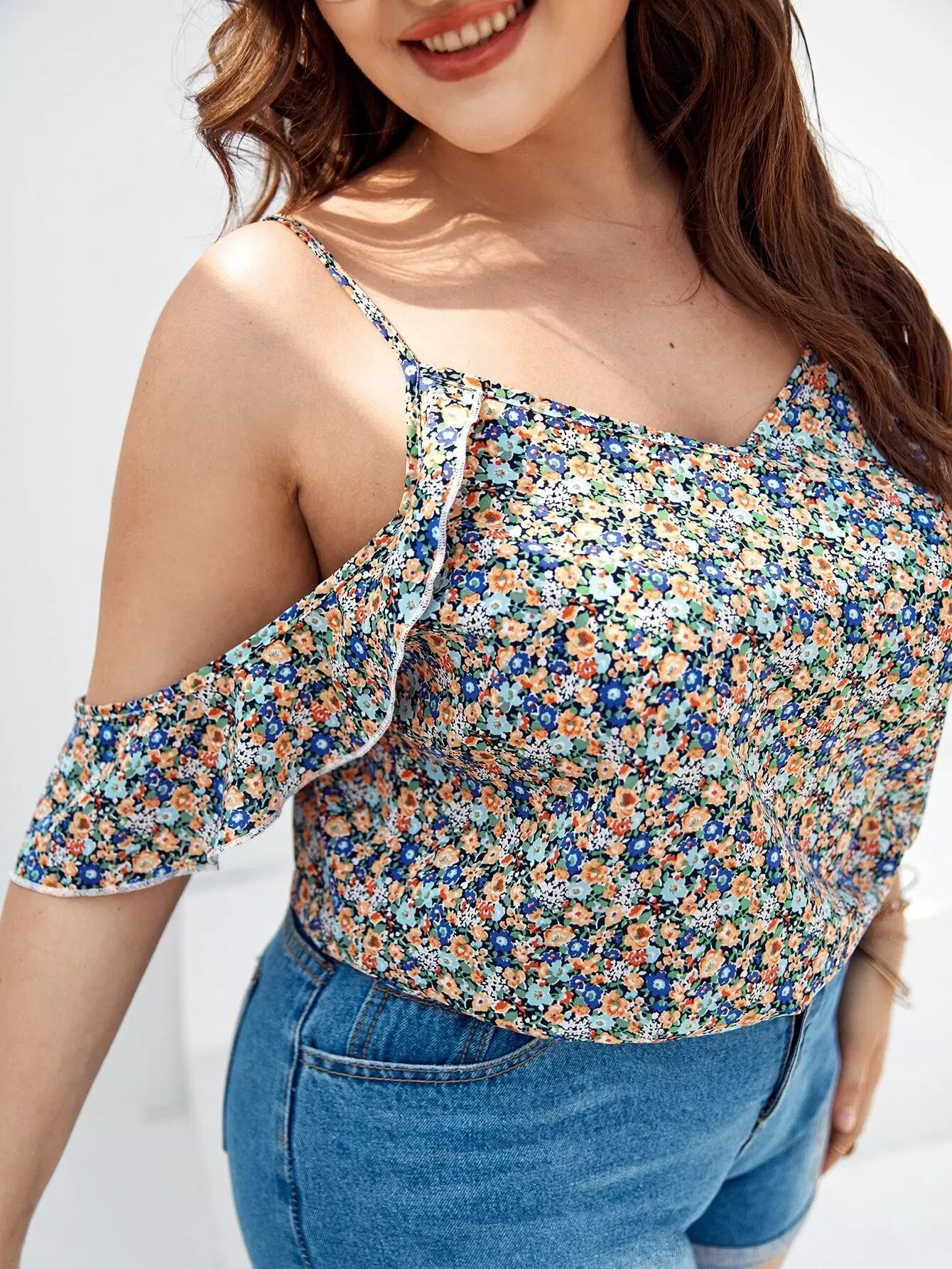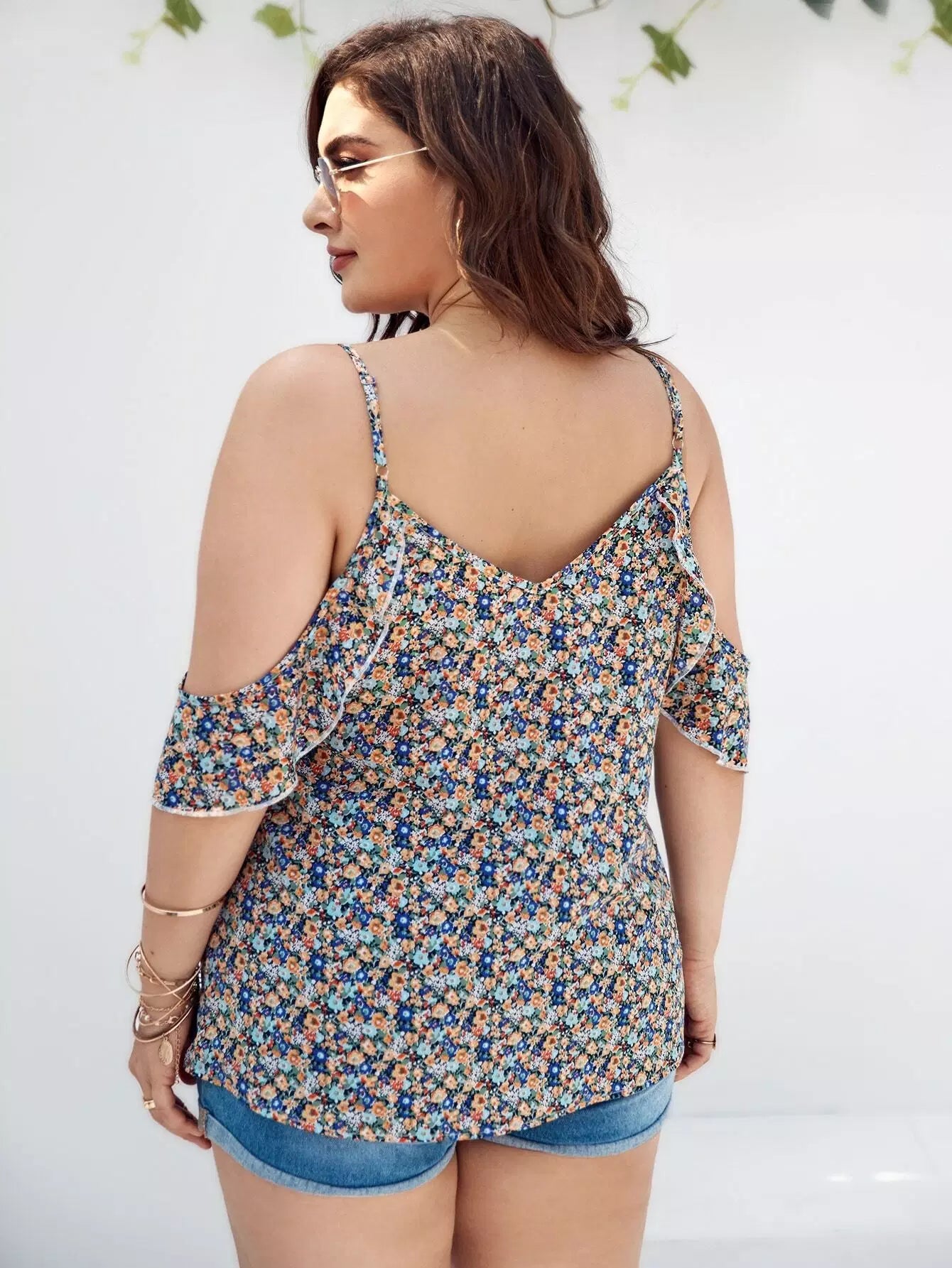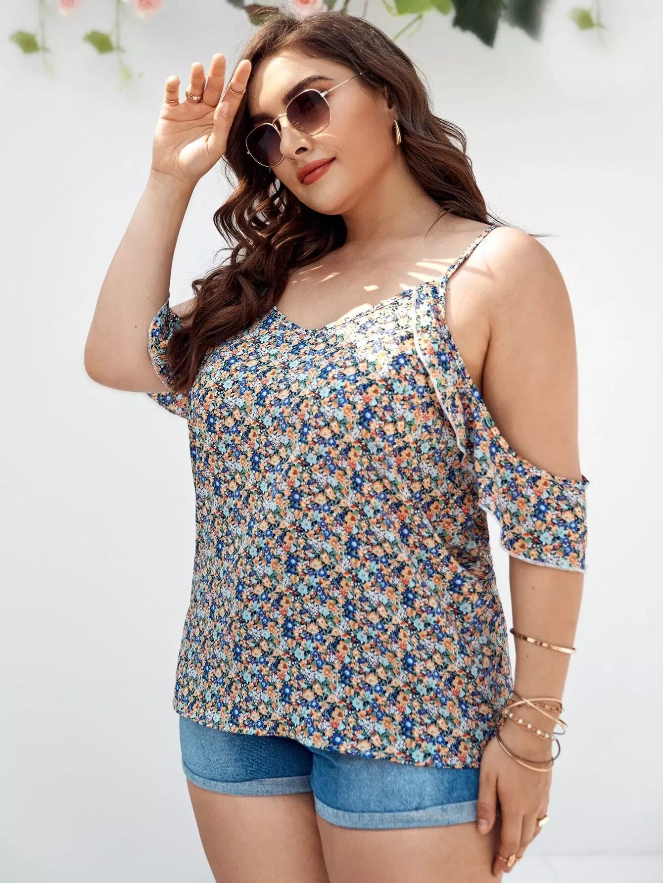 Plus Ditsy Floral Print Cold Shoulder Blouse