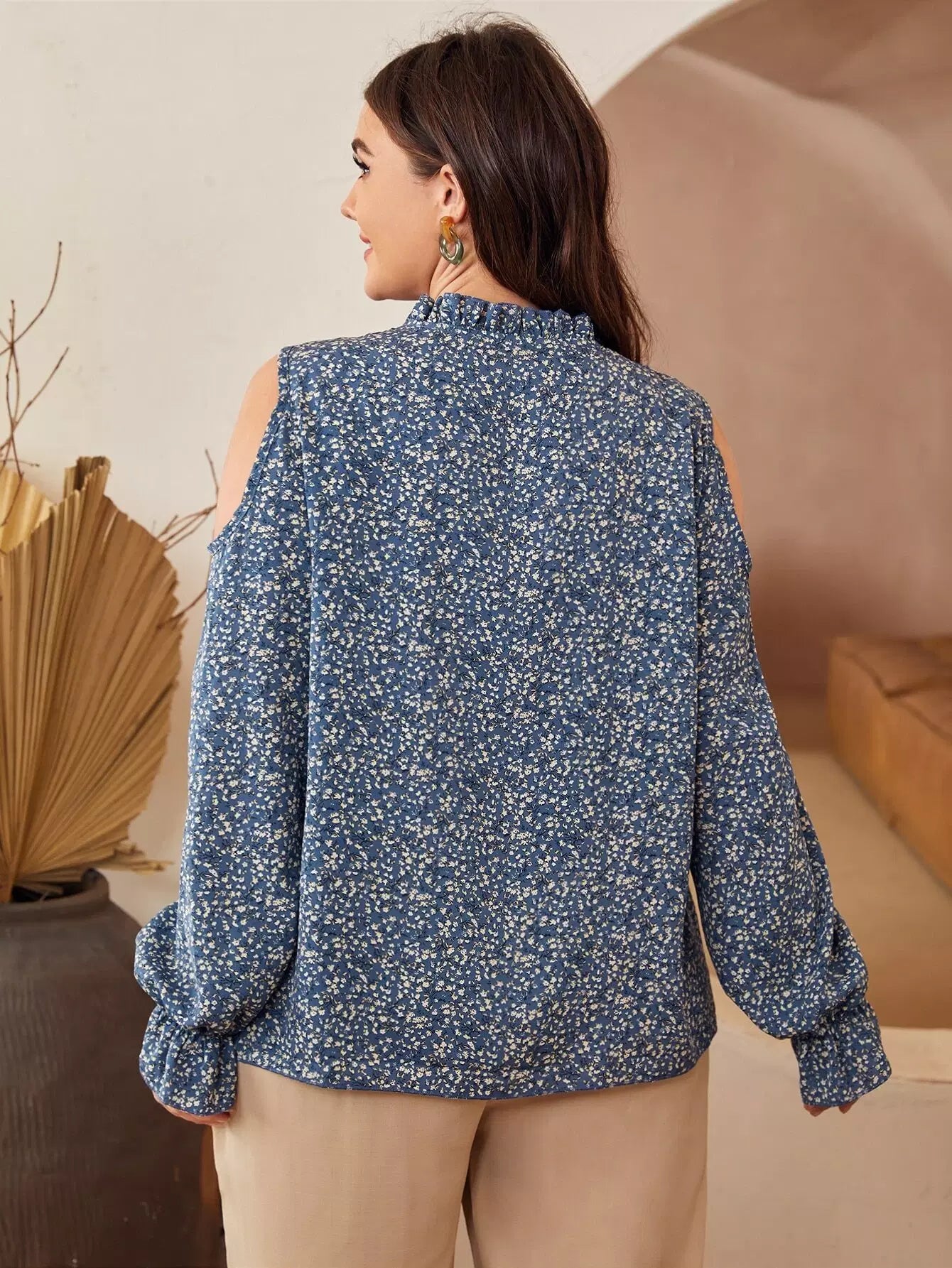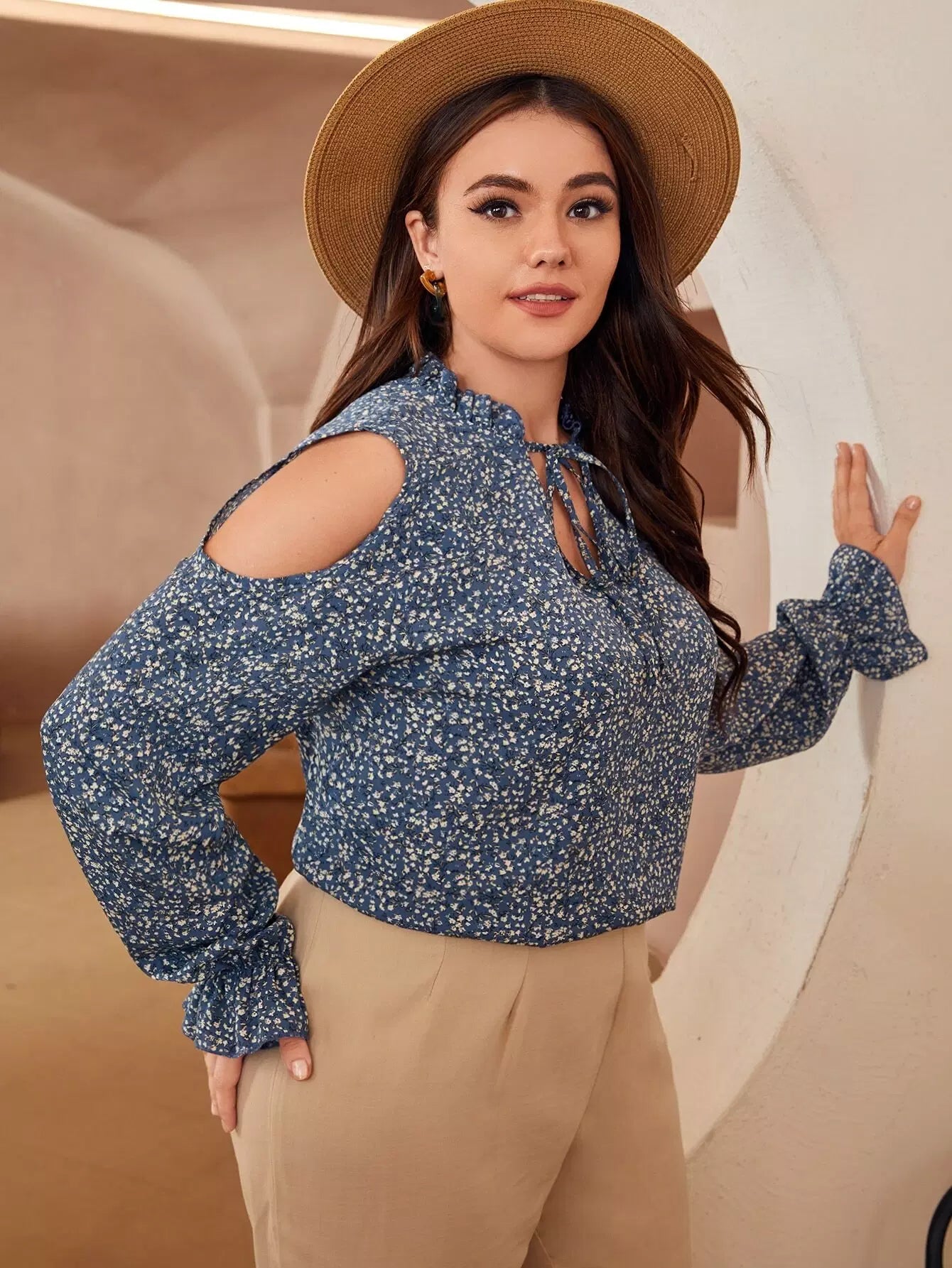 Plus Ditsy Floral Print Tie Front Cutout Flounce Sleeve Blouse