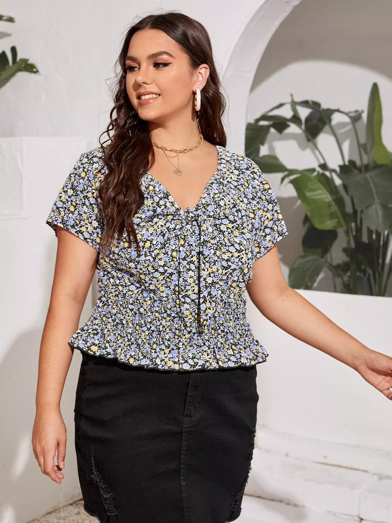 Plus Ditsy Floral Sweetheart Neck Shirred Blouse