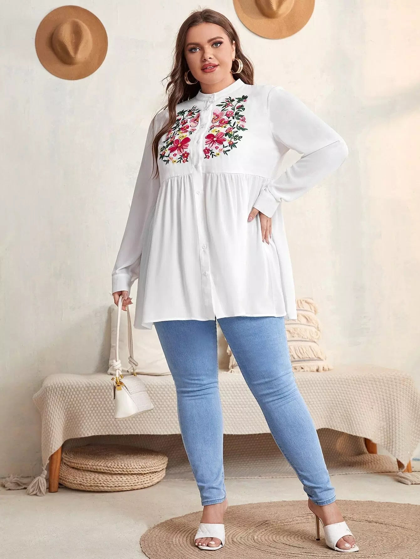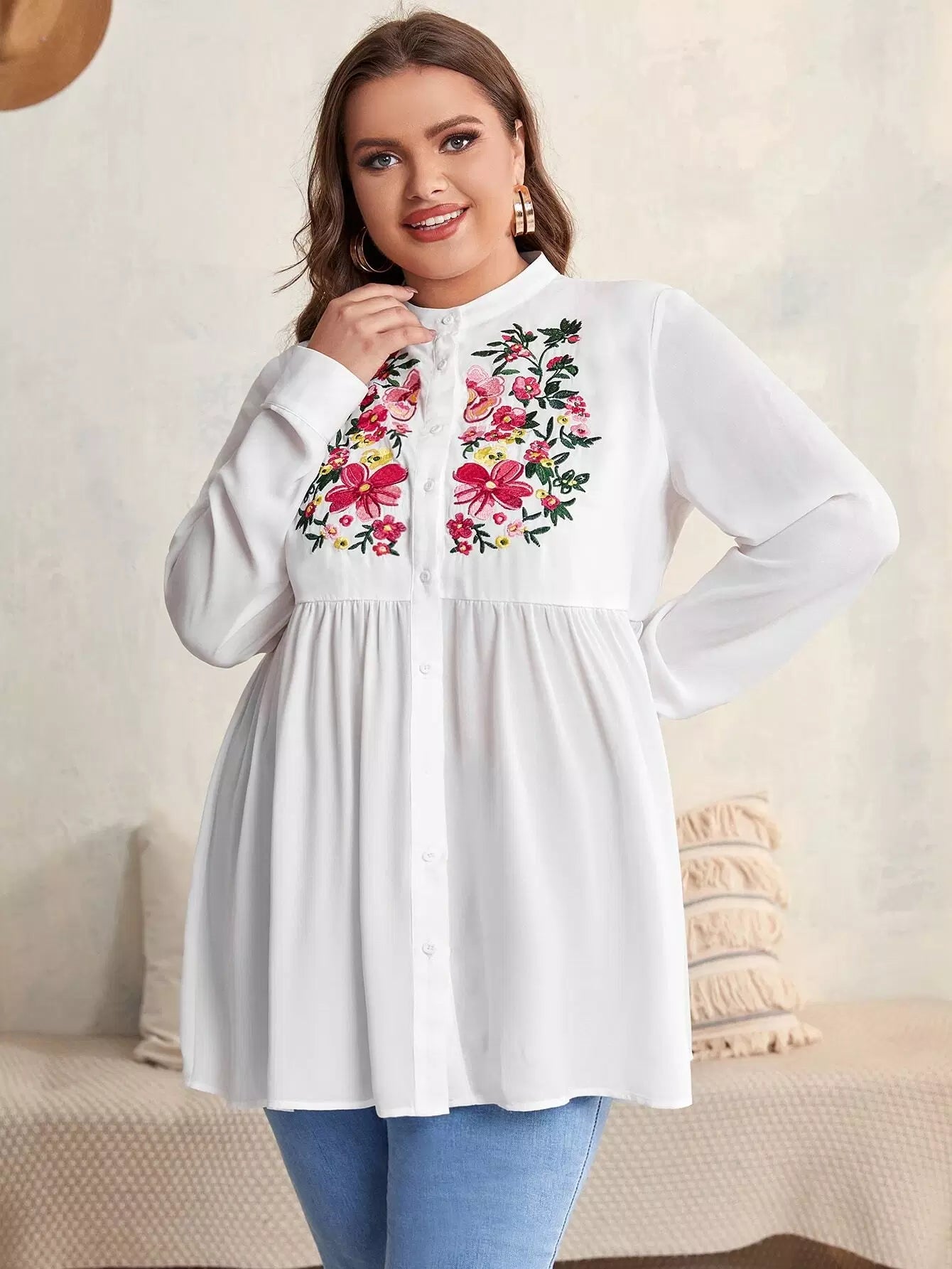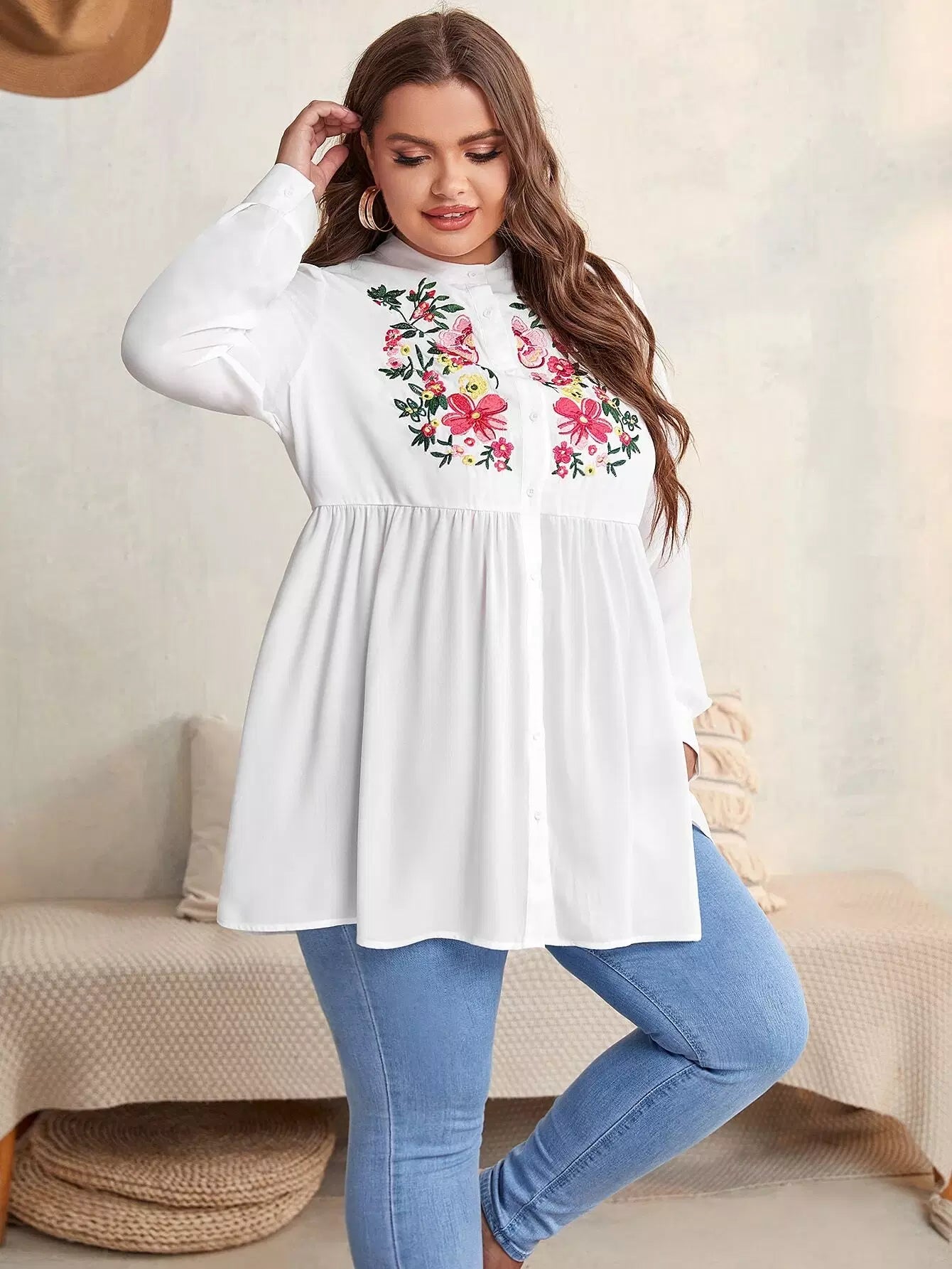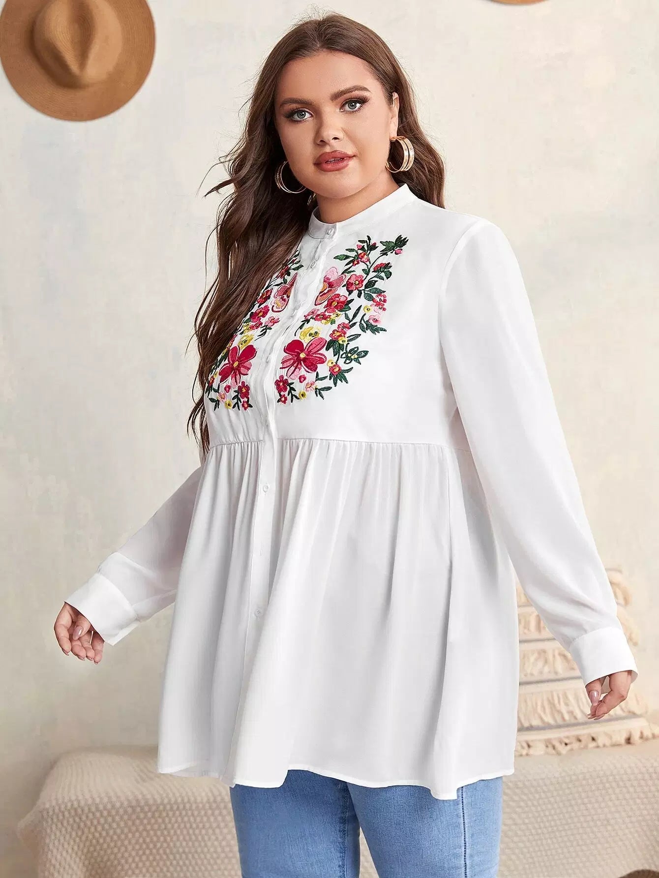 Plus Floral Embroidery Peplum Blouse