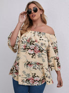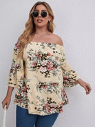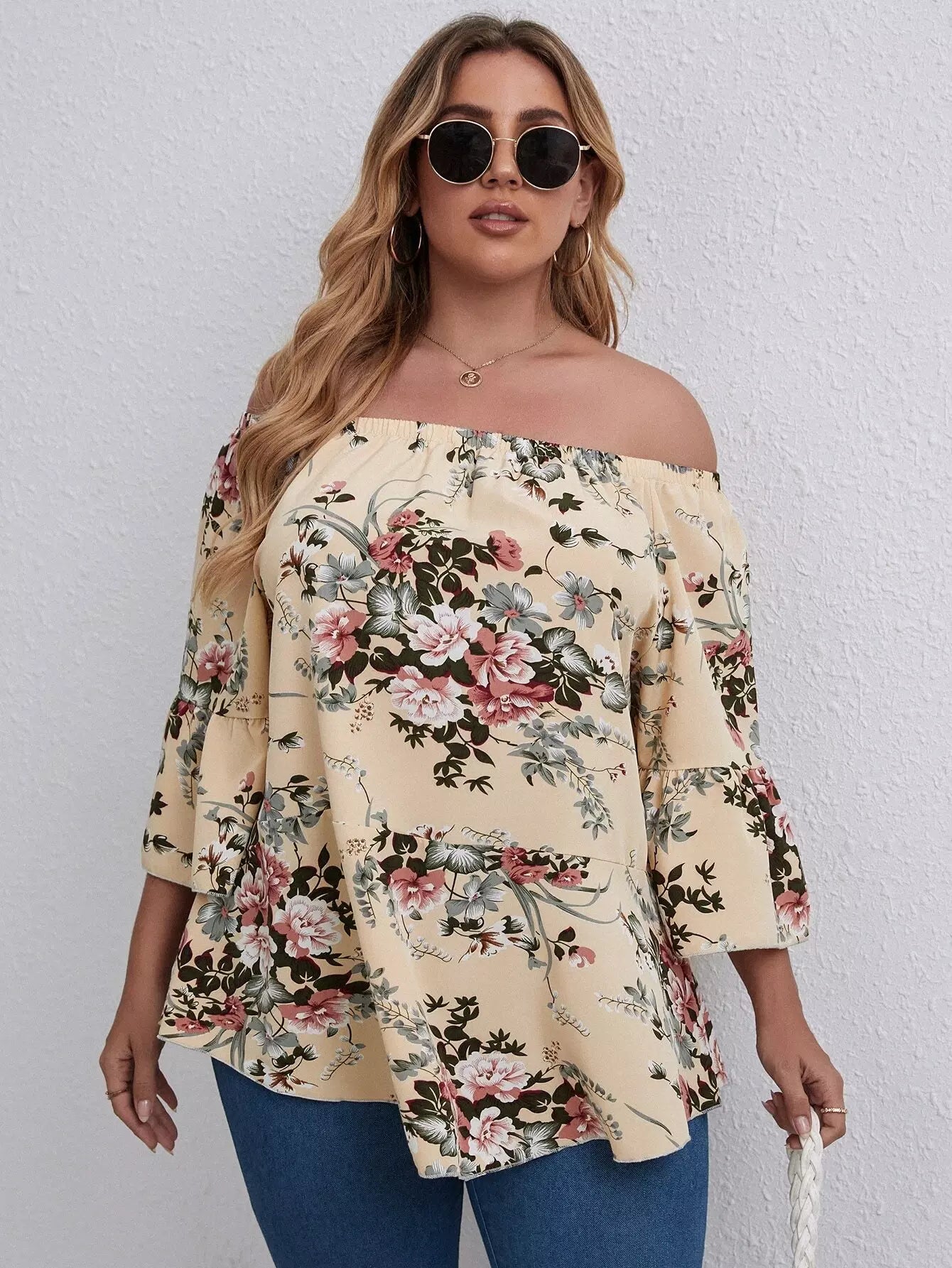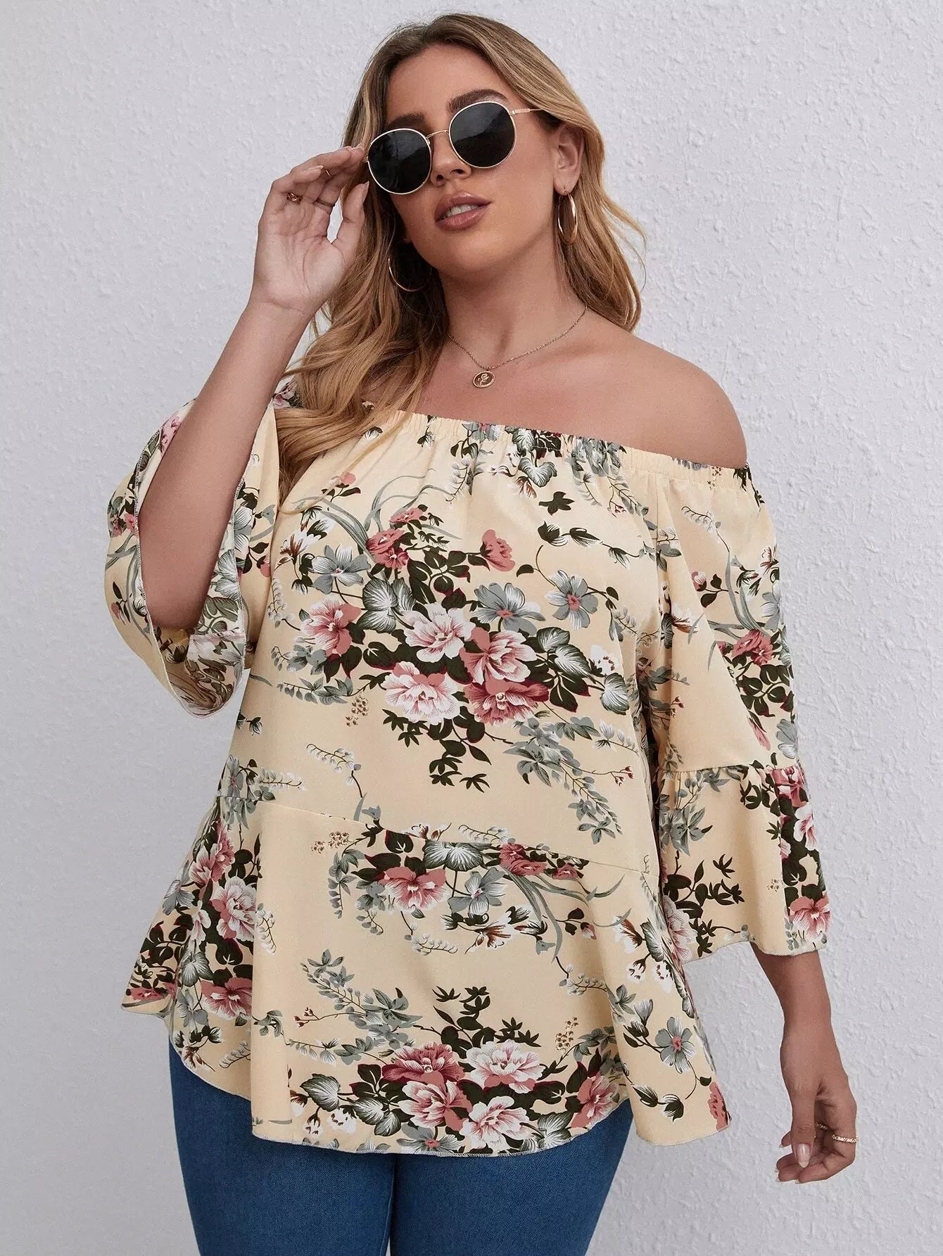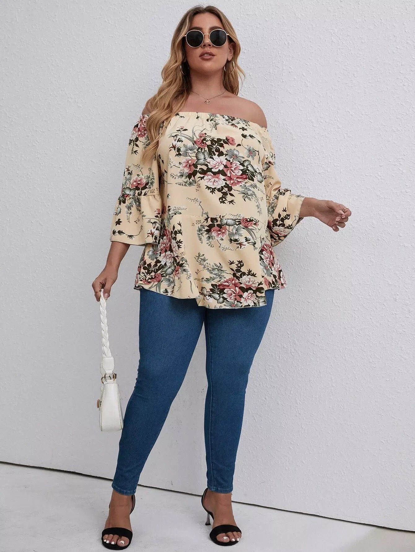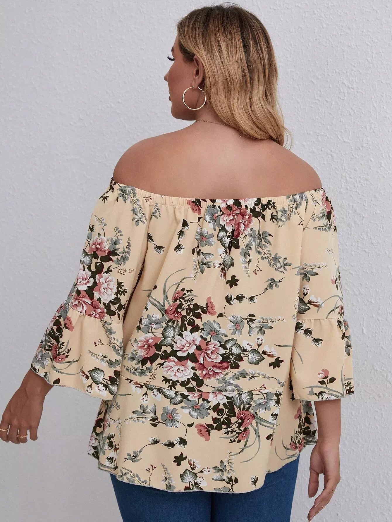 Plus Floral Print Flounce Sleeve Bardot Blouse