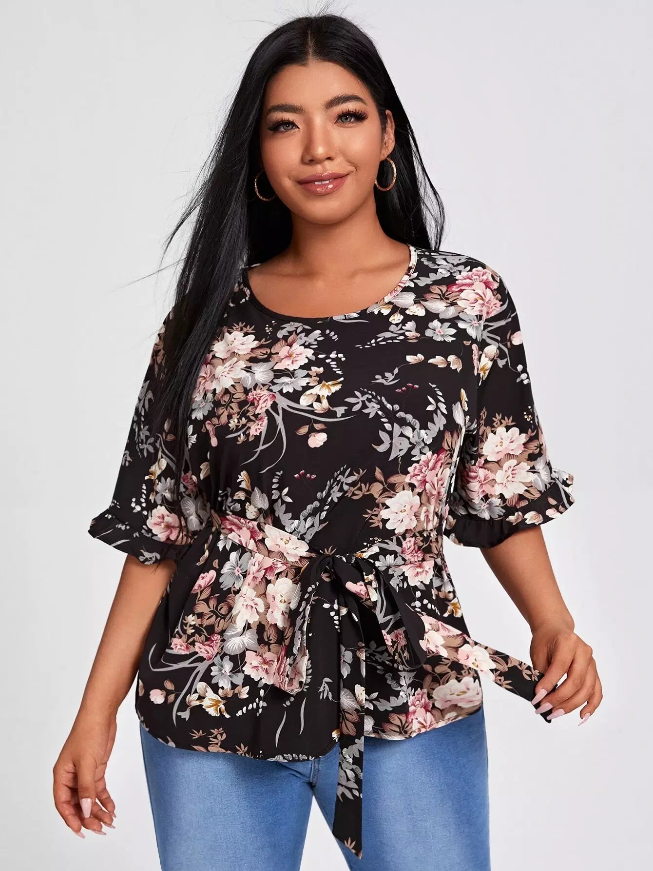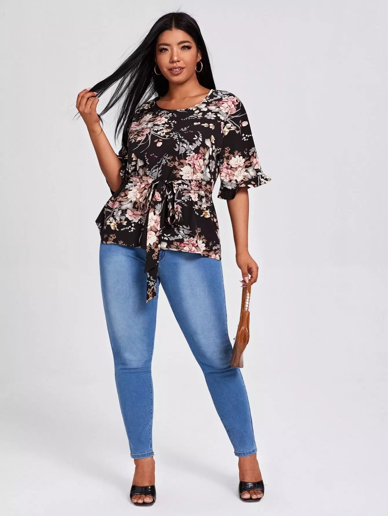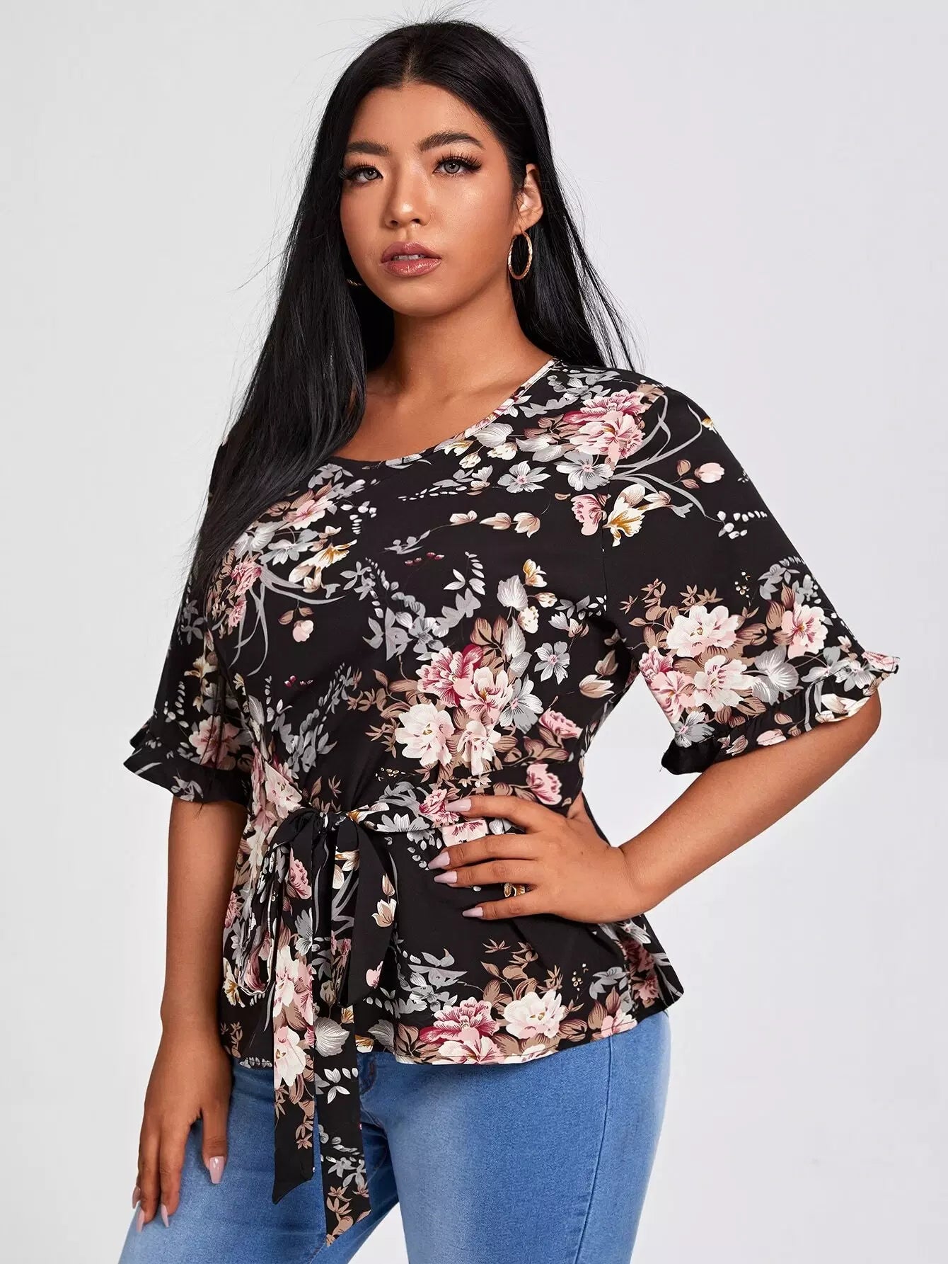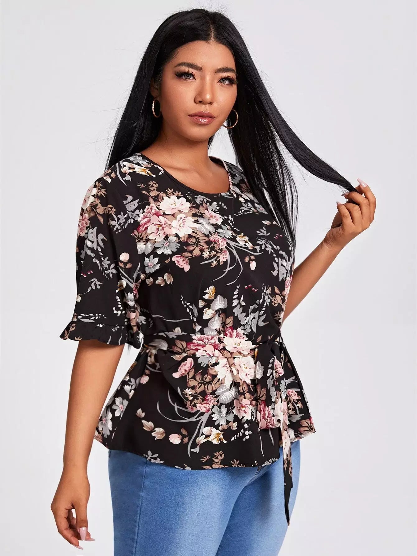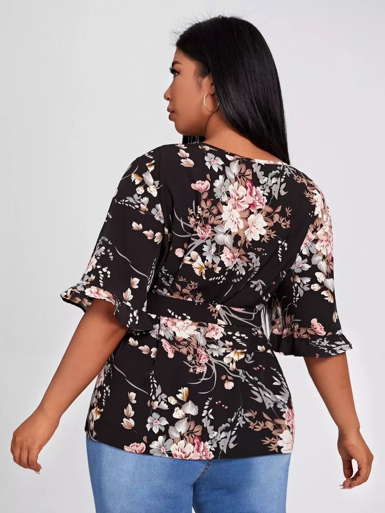 Plus Floral Print Flounce Sleeve Blouse Without Belt