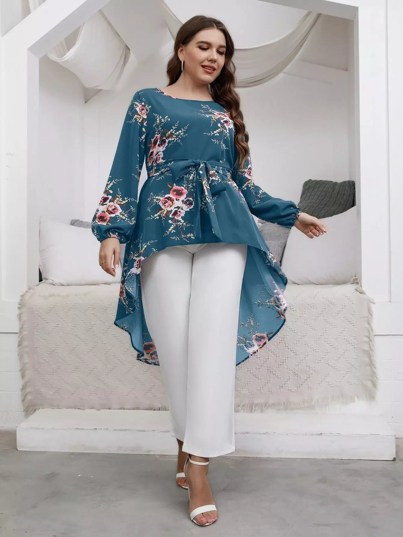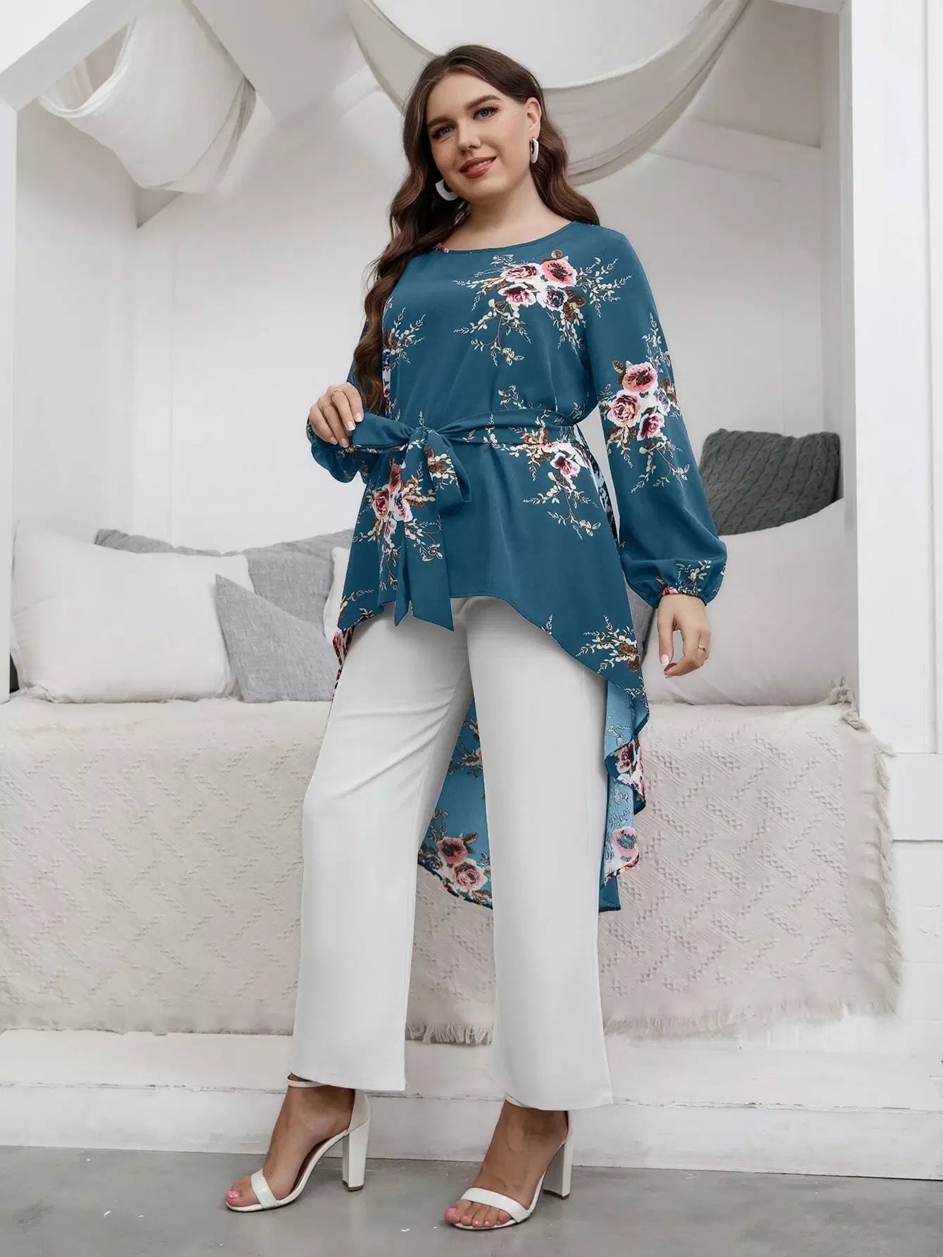 Plus Floral Print High Low Hem Blouse Without Belt