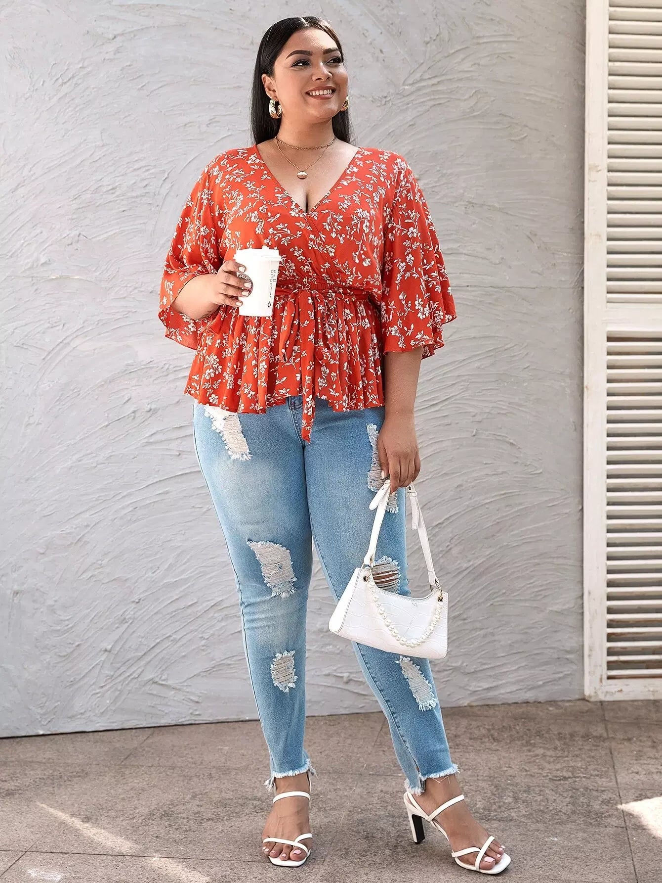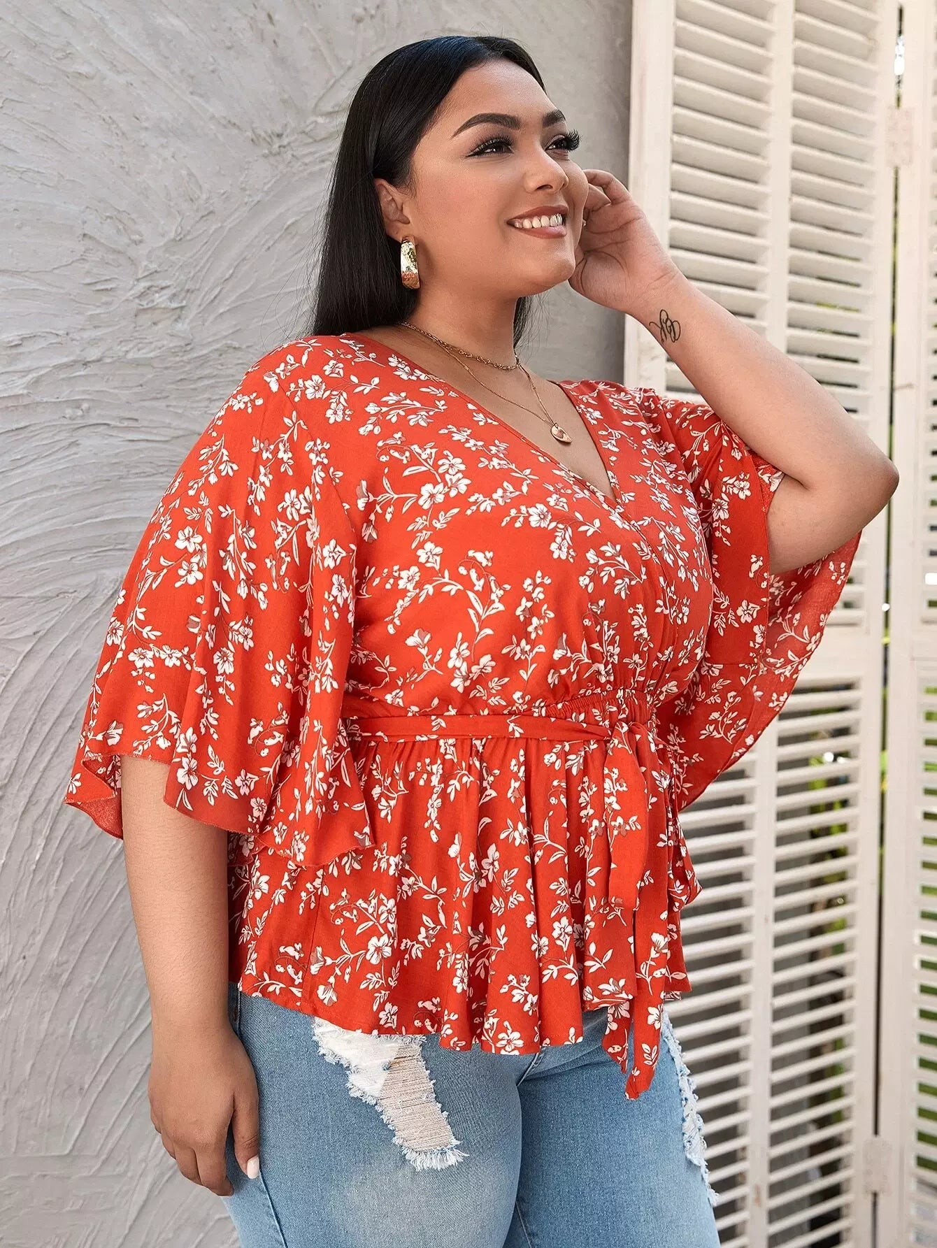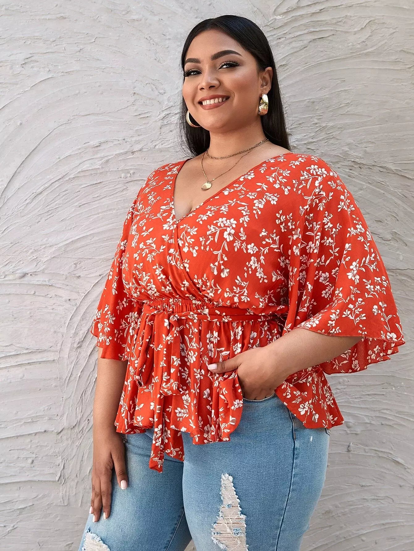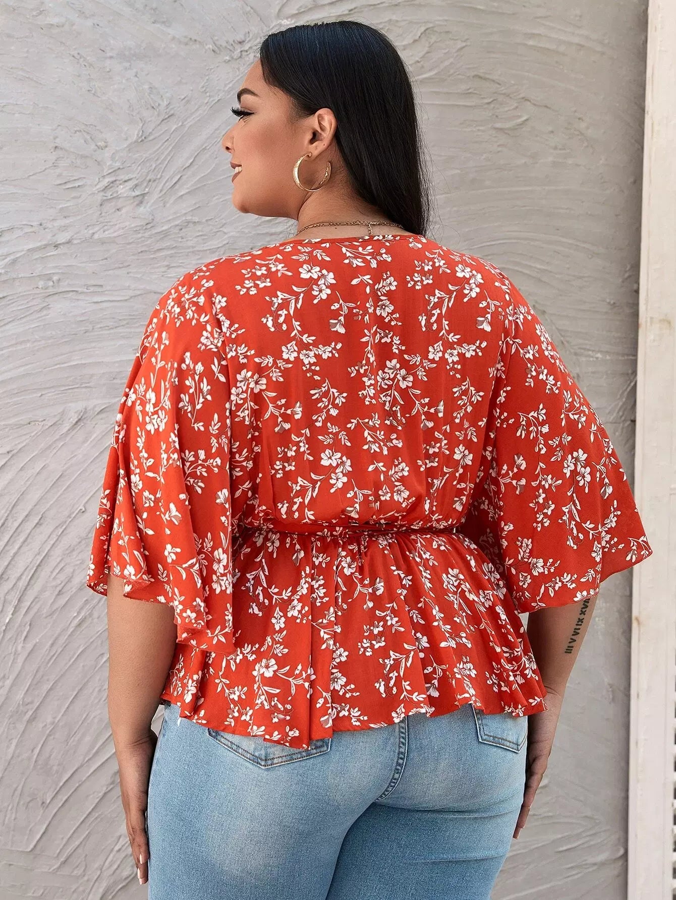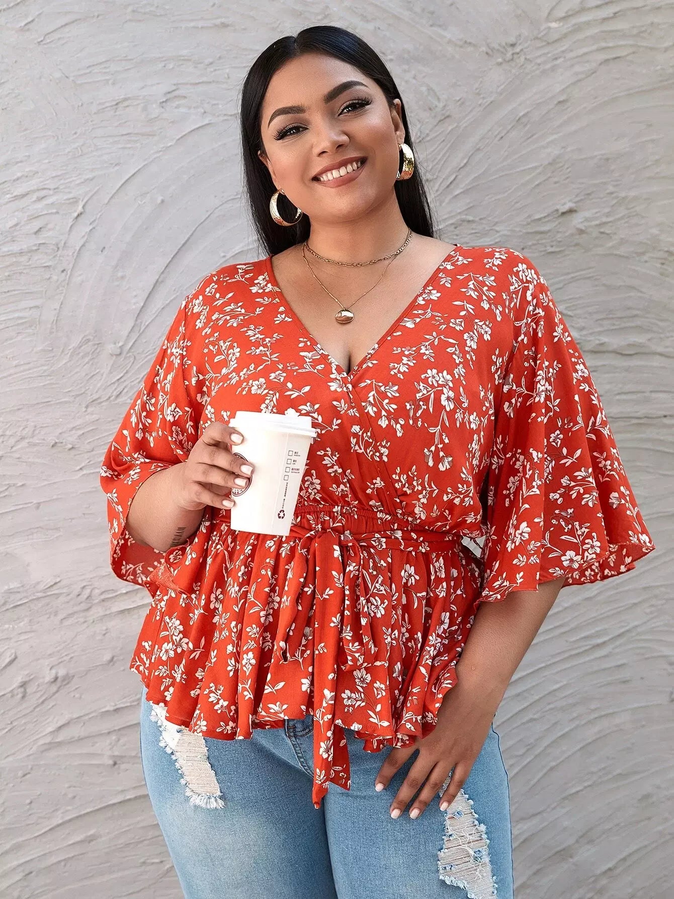 Plus Floral Print Surplice Front Peplum Blouse Without Belt
