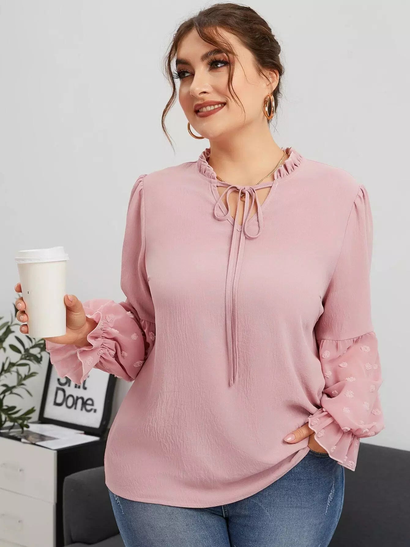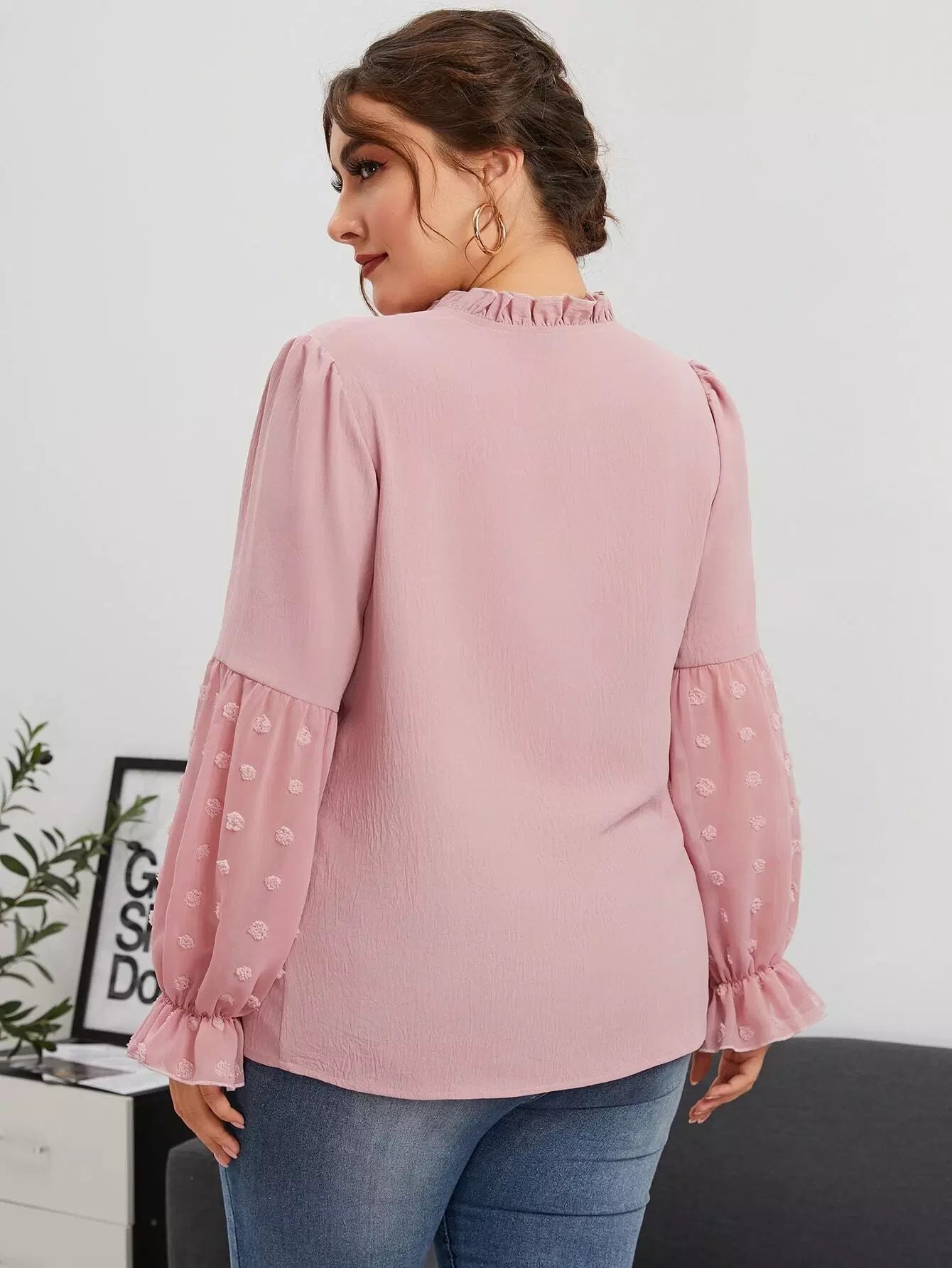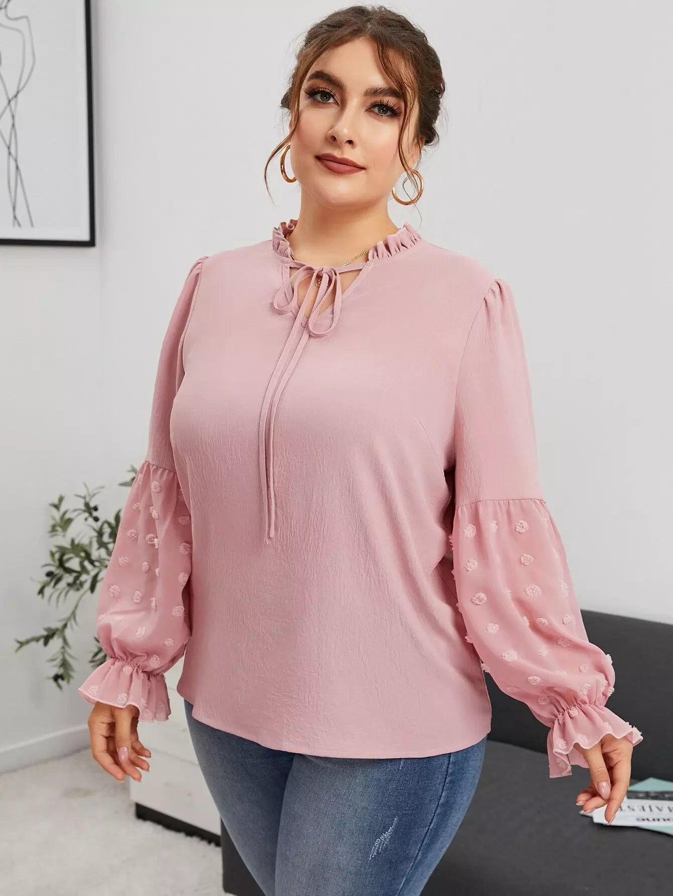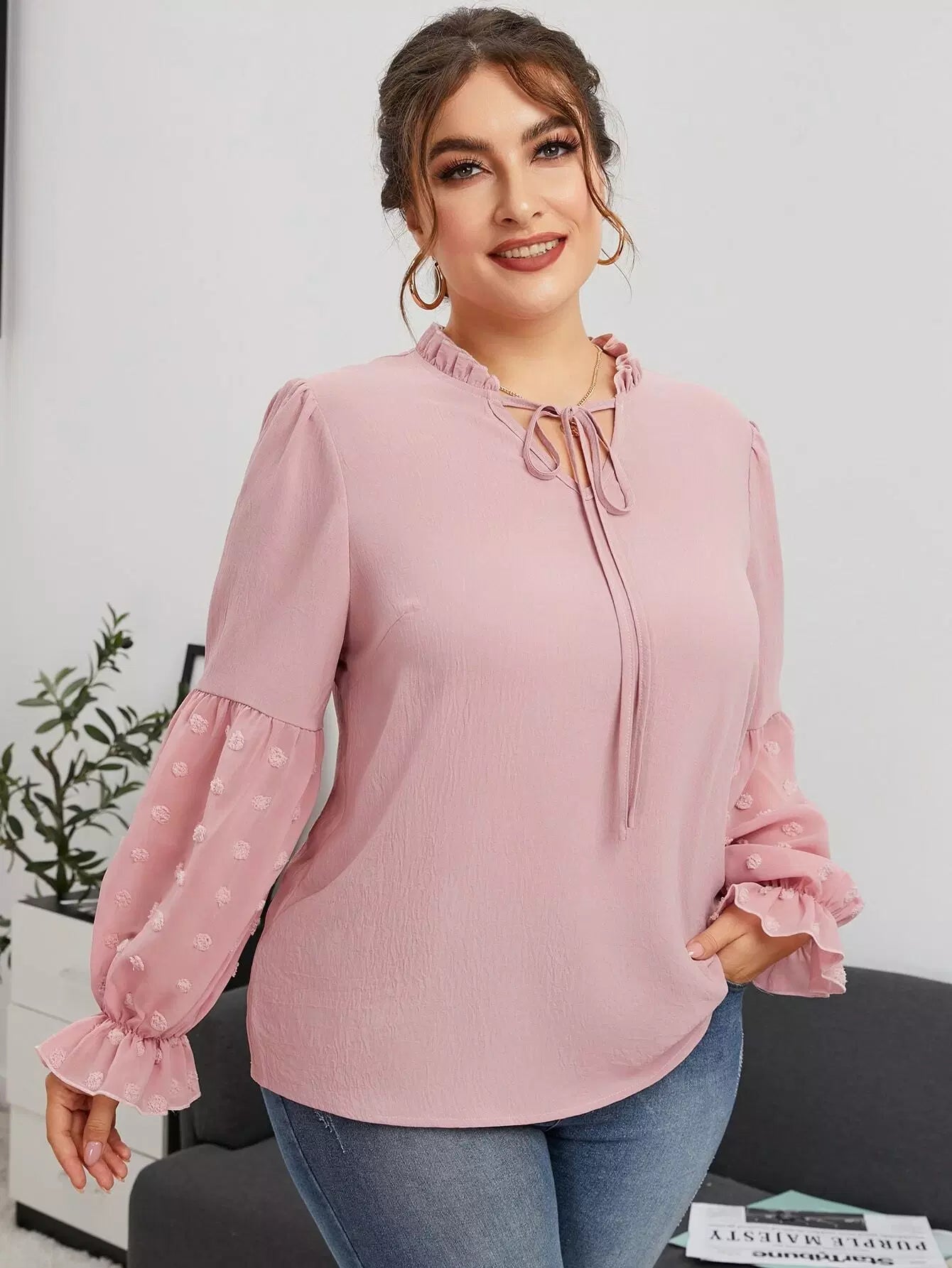 Plus Frill Tie Neck Swiss Dot Flounce Sleeve Blouse